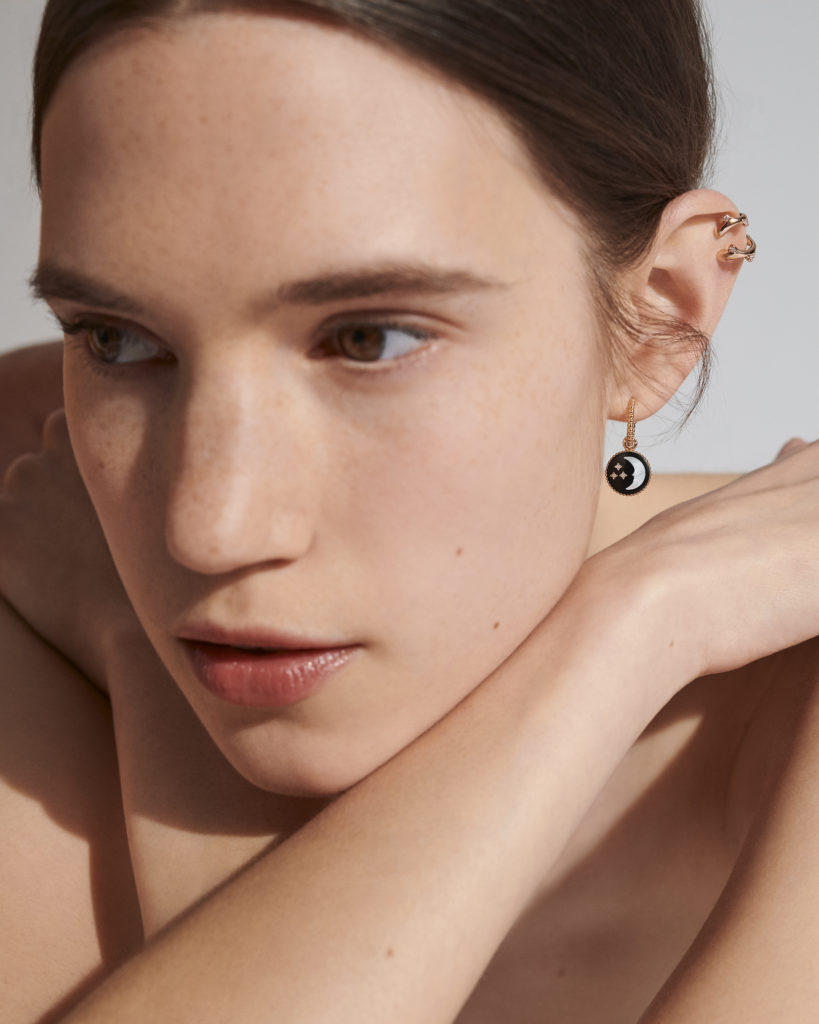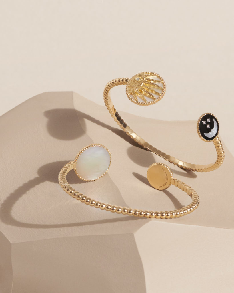 Imaginée par Victoire de Castellane, la collection joaillière Rose des vents se décline avec poésie dans une série de créations baptisées Rose Céleste illustrant la passion de Christian Dior pour l’art divinatoire. Côté recto, ces pièces dévoilent une lune en nacre, constellée d’étoiles en or blanc sur un ciel d’onyx. Coté verso, un majestueux soleil fait briller ses neuf rayons en or jaune ciselé. Aujourd’hui, Rose Céleste se complète de trois précieux fétiches inédits – boucles d’oreilles, bague et bracelet – réinventant ces motifs porte-bonheur. Une parure à découvrir en images, sublimée par la nouvelle égérie Cara Delevingne.