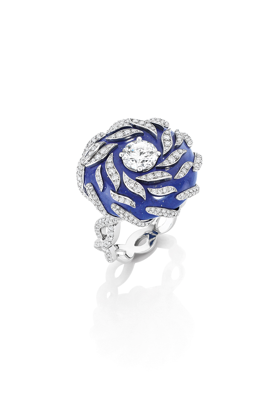 La parure « Ondine », avec ses courbes délicates et ses volumes façonnés par le lapidaire et le joaillier, représente l’onde formée par les vaguelettes qui s’échouent sur les rives de l’île, et le bleu profond du lapis lazuli est rehaussé par le blanc des diamants taille poire et navette qui viennent s’y déposer tels des gouttes d’écume.