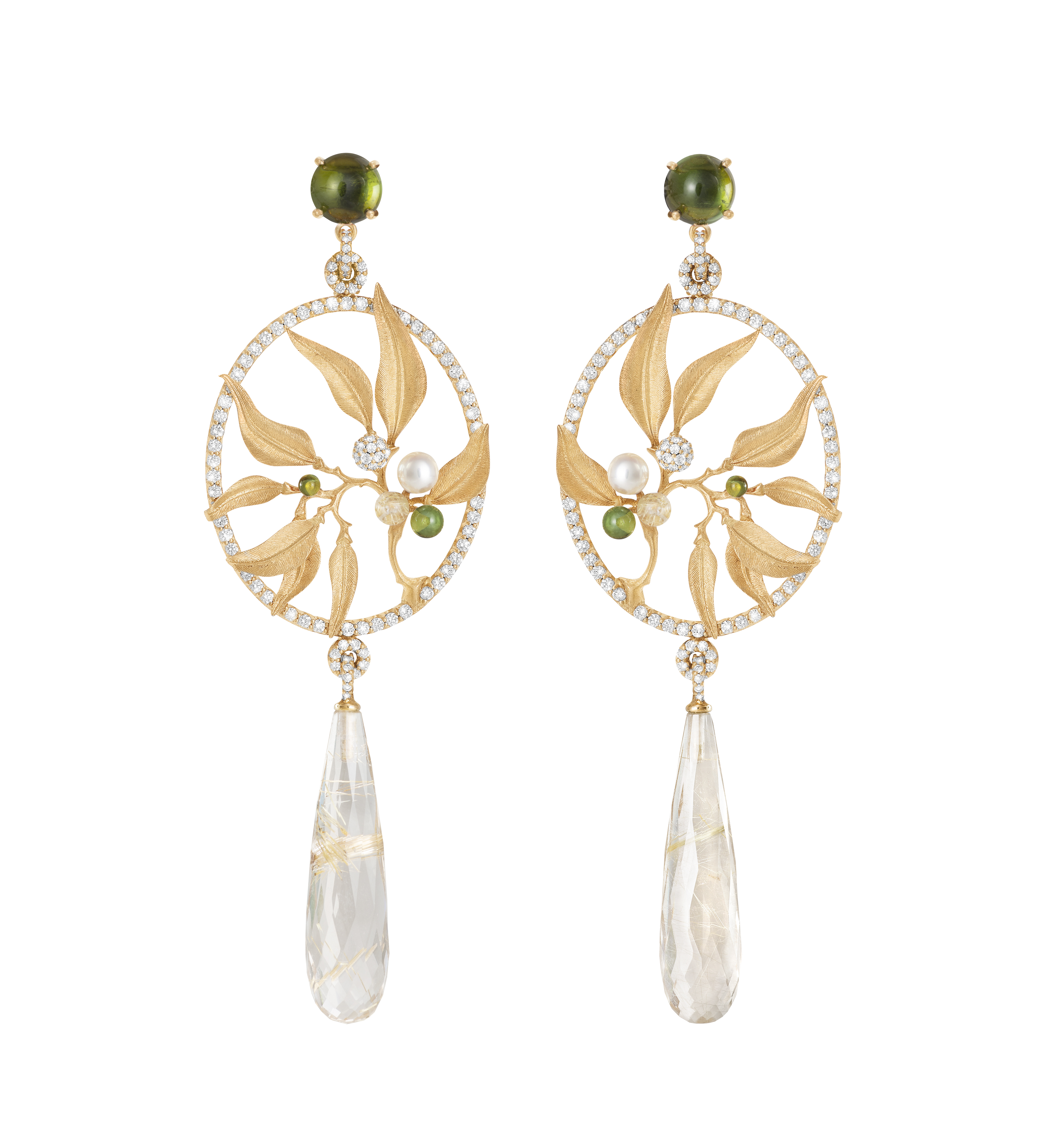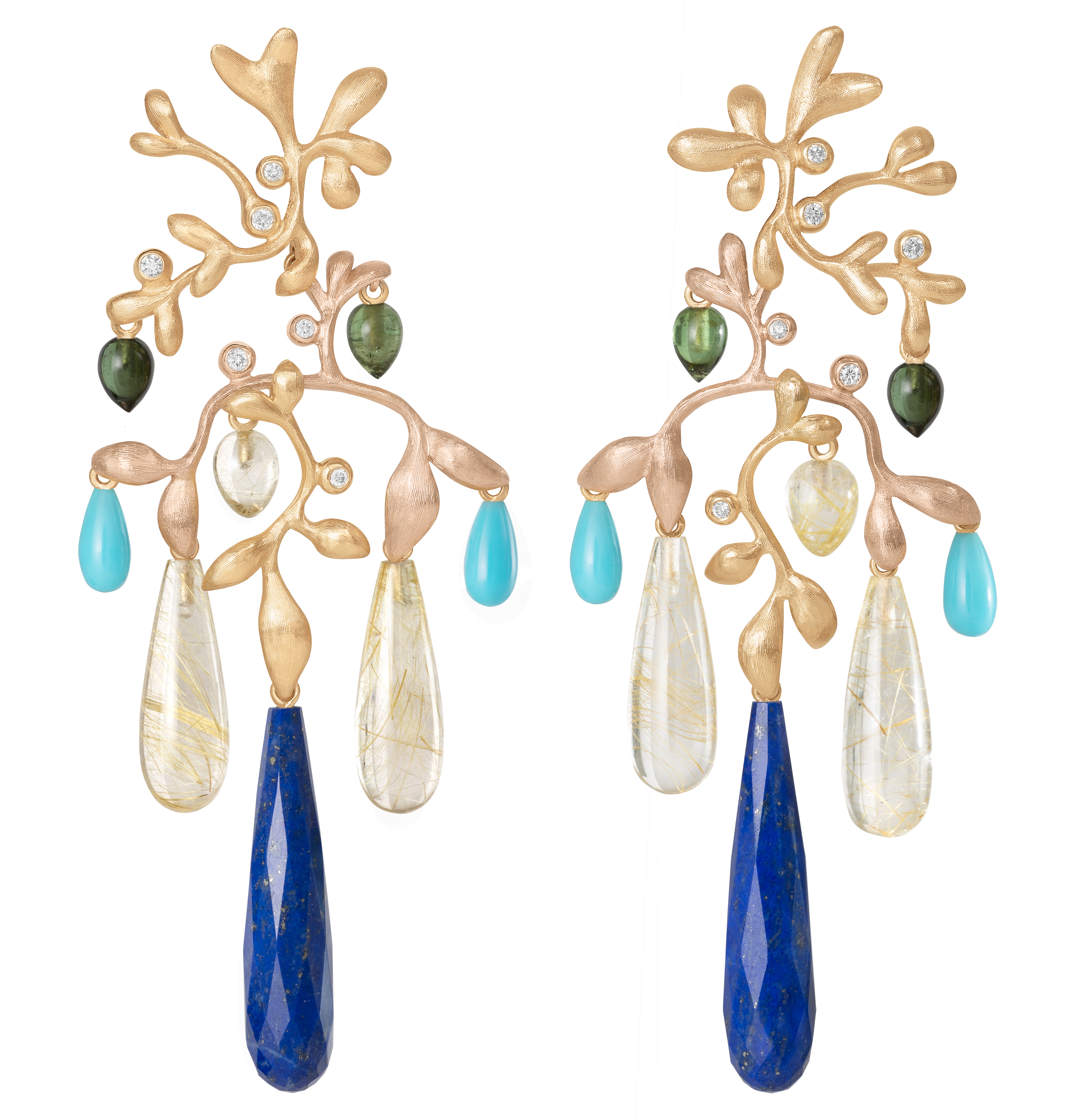 Chaque bijou est une pièce unique et somptueuse, qui fait appel aux matériaux les plus éblouissants de la nature: le diamant, le quartz fumé, le quartz rutile, la turquoise, la serpentine, la perle, le lapis lazuli et la pierre de lune rose.