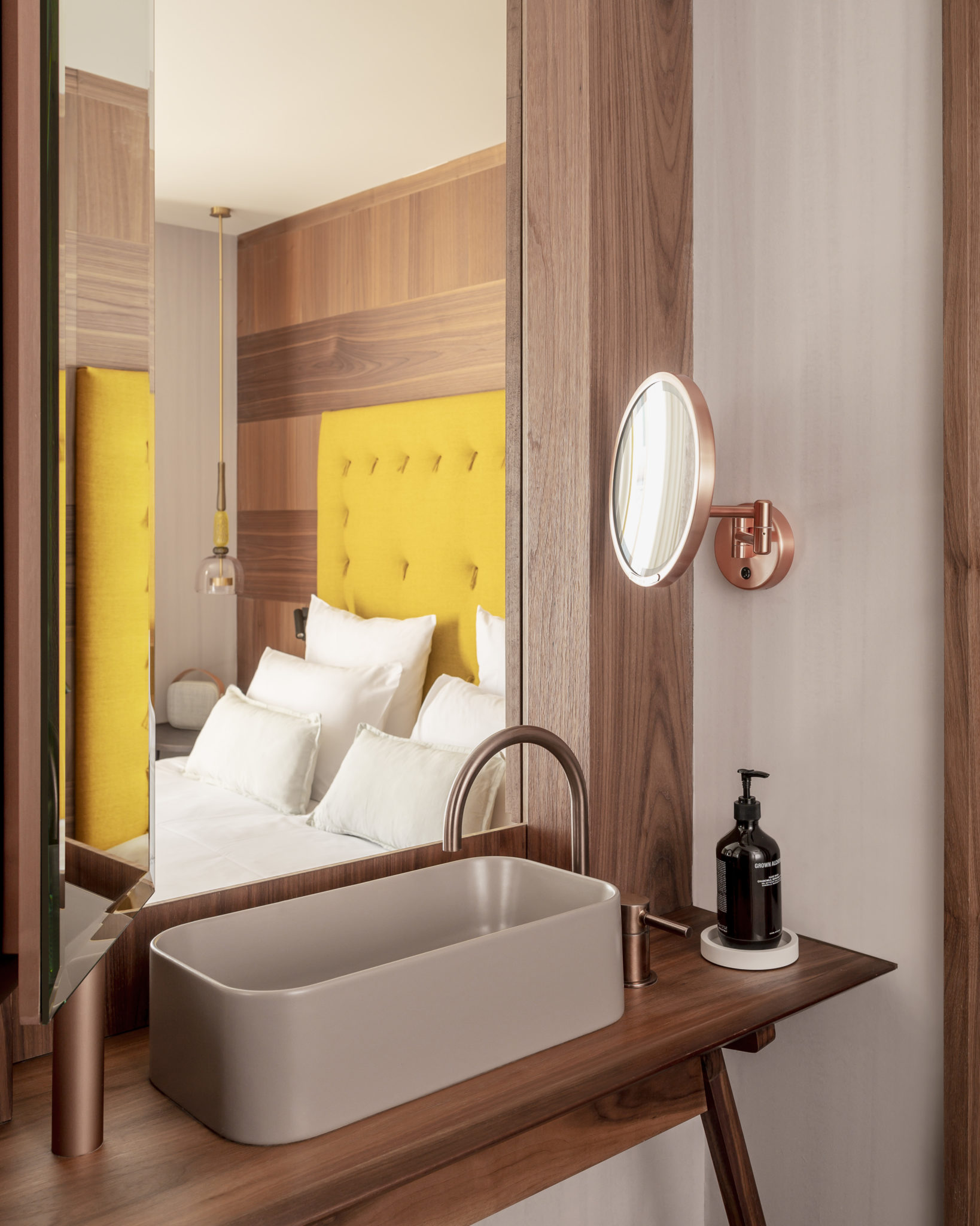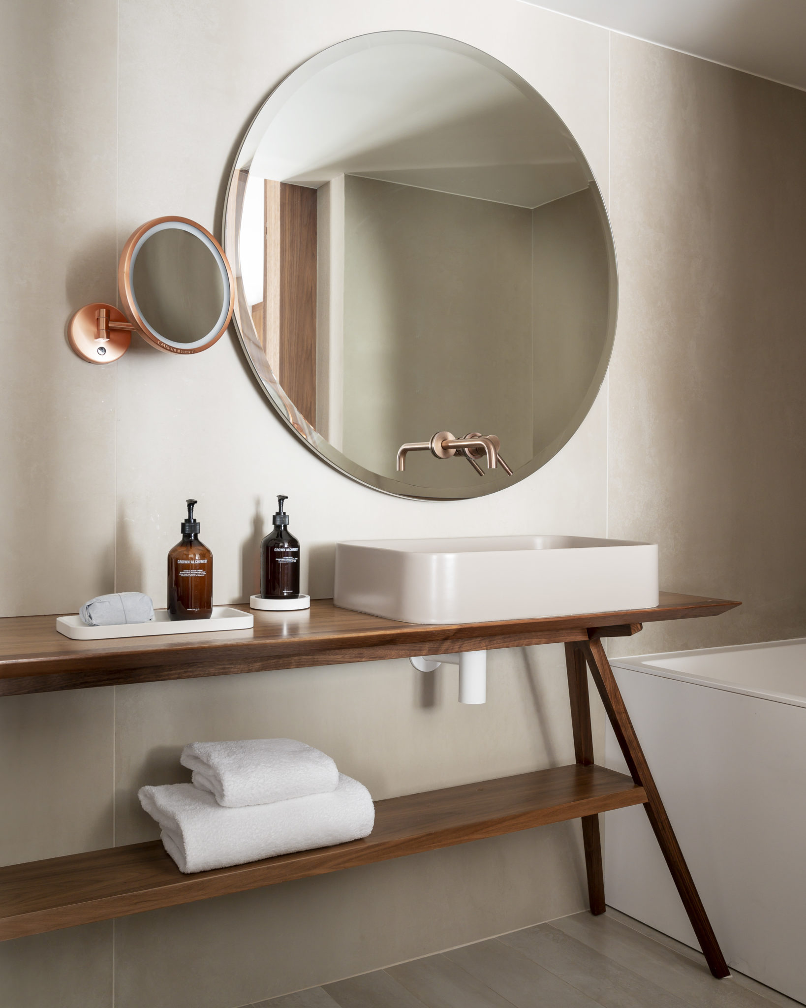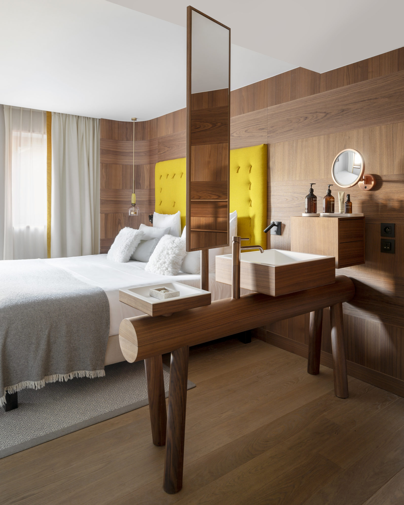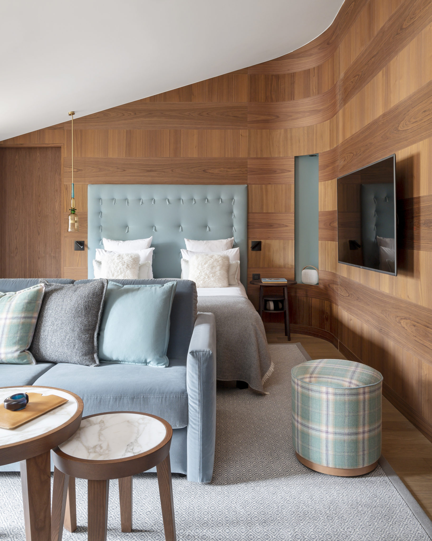 Il faudra attendre le mois de décembre prochain, pour découvrir Cœur de Megève achevé à bonne fin. Ce cocon des neiges qui revisite l’esprit alpin avec finesse et modernité. Combinant deux chalets traditionnels, sa façade est recouverte de tavaillons, ces tuiles en bois que l’on retrouve un peu partout en Savoie. Sous la houlette de Sybille de Margerie, la décoration initie les voyageurs aux joies du luxe cool. A deux pas de l’église ou dos au torrent du Planay, les quelques 39 chambres douillettes cultivent un style bien à elles. Habillées de noyer brossé et de mobilier design, les lits accueillants sont chapeautés, au choix, de têtes en lin aux teintes anis, azur et carmin. Certaines sont mansardées. D’autres s’ouvrent sur de grandes terrasses. Toutes ont des salles de bain à l’ambiance zen, avec des douches à l’italienne et un kit de beauté Grown Alchemist, marque de cosmétiques biologiques dépourvue de parabens et de colorants artificiels venue d’Australie. Sans oublier leur gamme chromatique qui fait écho aux couleurs de la montagne : blanc-gris clair-brun-bleu givré… Le confort règne en maître, sans jamais être pompeux.