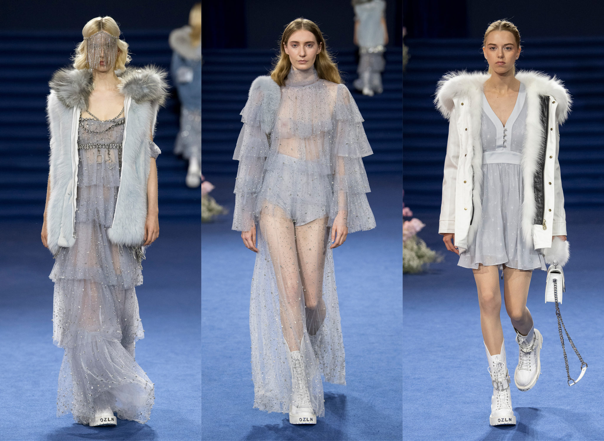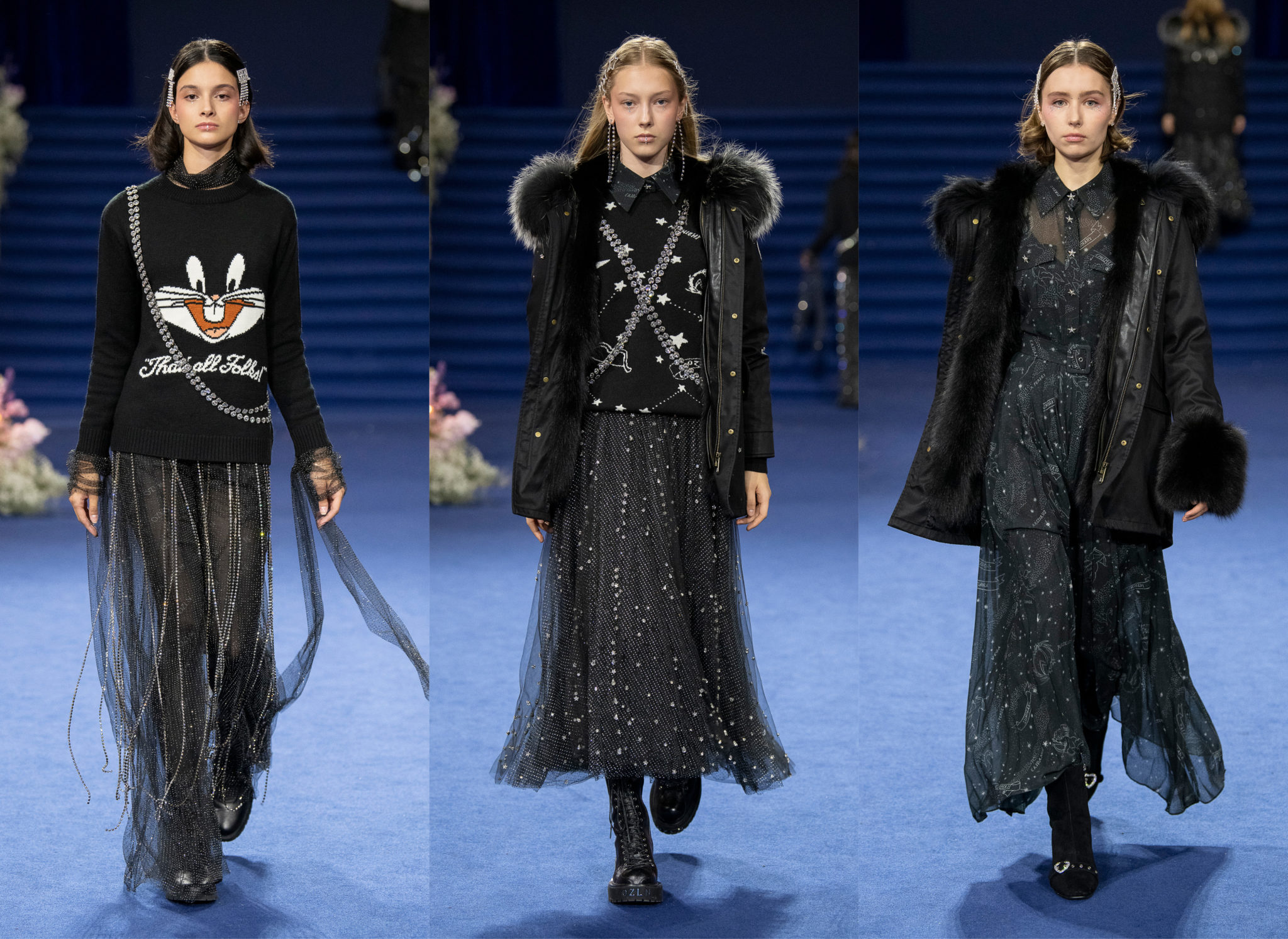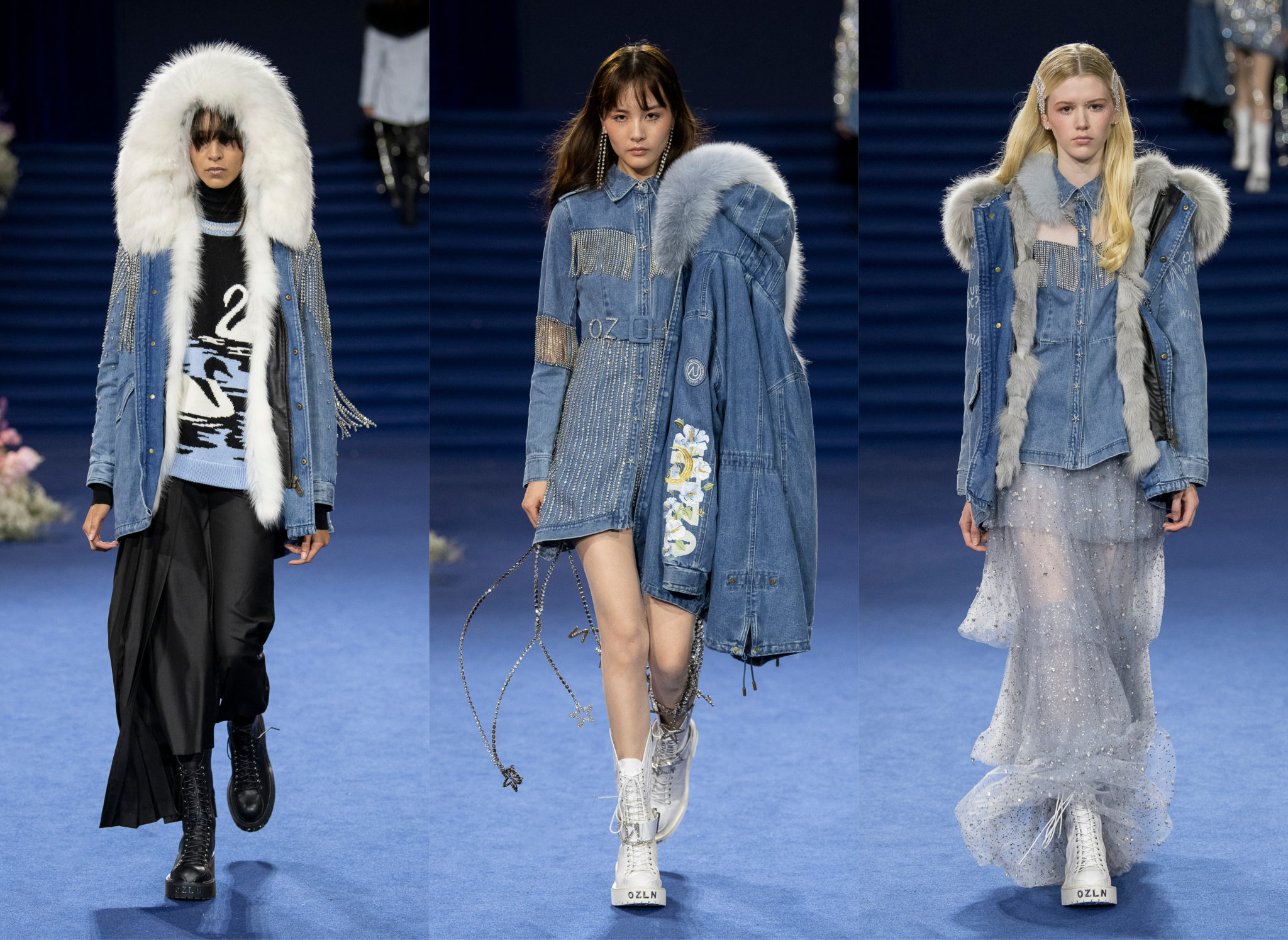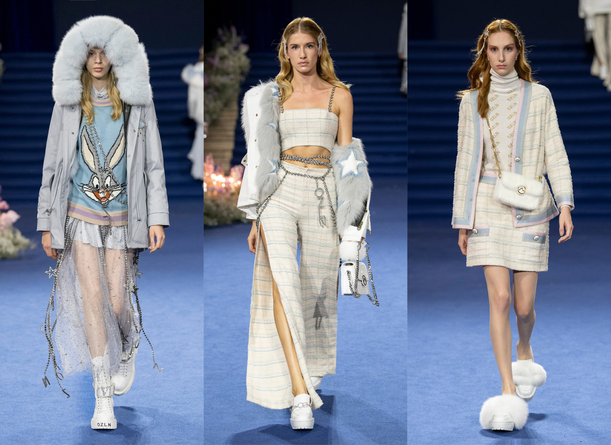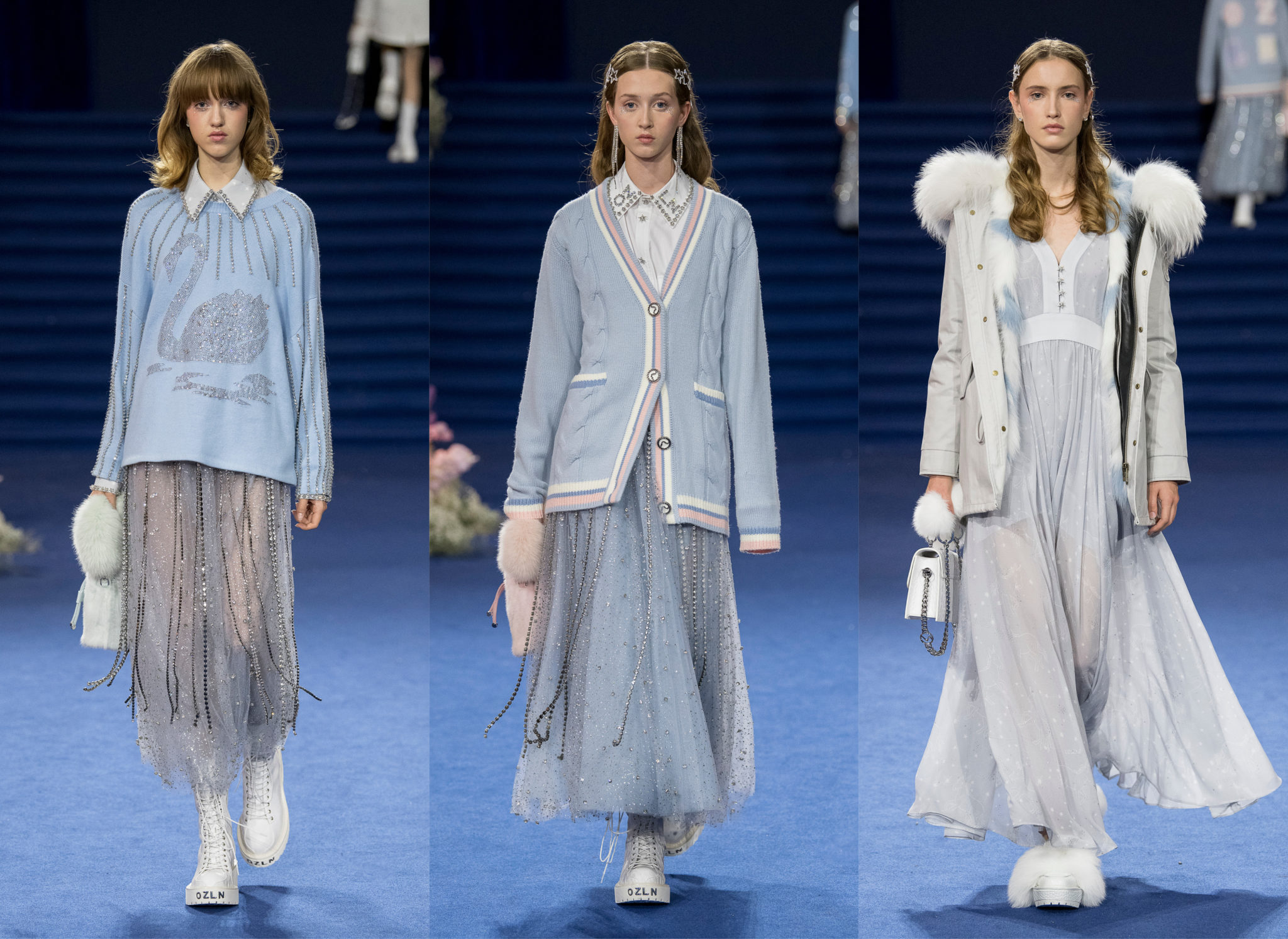 “We believe every woman, every girl, has a fairytale story within their heart – our aim is to fulfill her wonderous dreams and fantasy through the vision of OZLANA.” OZLANA is an Australian fashion brand with a romantic, playful personality, explored through story-telling inspired concepts. Devoted to quality fabrications, glimmering embellishments, & brand collaborations, the brand embodies a style of youthful & modern femininity, channelled through the signature Fur Parka, a traditional piece updated with the classic OZLANA touch. “The Neverland” Collection is the next chapter of the OZLANA story, a celebration of the surreal and enigmatic. OZLANA opens this world to the audience through their set, music composition, runway garments & brand collaborations, seeking to immerse them in their world, engaging all the senses, from the scent of the fresh florals, the bespoke music that swelled as guests took their place, to the Chupa Chups VIPs found amongst the gift bags. Collaborating with other artists, brands, and characters allow OZLANA to explore more story telling avenues, widening their world with every connection. The Neverland is a theatrical opera – the audience were invited to witness, watching live as magic happens before their eyes as the models cross the runway, in the boundary between reality & the surreal. The set indulges this fantasy, creating the world with navy velvet curtains hanging thick behind the runway & audience. The runway sparkles with chandeliers laid on navy carpet, as if fallen from the sky itself, with wild purple & white flowers organically placed across the runway & stairs of the grand Palais de la Decouverte space, elevated by the traditional French architecture. The Neverland collection revolved around five elements – the practical & lush fur parka, with decadent fur spilling over the collar & from inside. Crystal star showered tulles in soft ivory, sage, and light twilight blue. Structured asymmetrical wool suiting’s, pleats framing the body. Prints by Australian artist Victoria Garcia told the fable of The Neverland, rippling across voluminous dresses and western shirts in soft georgette, windblown as she crossed the heavens. The journey through the stars is reflected in the crystals & constellation prints that grace the collection, cascading off the bodies of the models, harnessed to them, wrapped entirely in this glimmering celestial dream. Even the buttons – tiny stars in silver & bronze, punctuating the waists & shoulders. The collection moves through stages, changing as the OZLANA girl grows through her flight. She finds her way to the neverland through the skies – she crosses constellations, galloping through the heavens. She begins her journey, determined and strong, marching to a dark electronic beat. The music settles, falling to a sweet serenity littered with the sounds of angelic starfall, bells chiming in a celestial melody. As she reaches the door to neverland, the music swells, building to an operatic crescendo, and the garments darken again, taking on a deep midnight hue with golden accents – signifying her conquest of the skies, her dream fulfilled. The audience never witnesses the neverland – they only witness her journey, and her growth, from naivety to strong confidence, but as the music builds to it’s climax, the finale march of models drop their hood, signifying their destination reached. As each model marches past – sweet sensibilities of her soft blue, ivory tulles giving way to the darkest hues of night – her pilgrimage is clear. The collection includes collaborations with Looney Tunes’ Bugs Bunny & Chupa Chups, defining a childlike naivety, and also introduces a collaboration with Kopenhagen Fur, creating artisanal parka and fur vest showpieces for the collection. By inviting Bugs Bunny & Chupa Chups into our Neverland world, the garments are playful & self aware of the childhood motifs throughout the collection, whilst also ensuring the garments are accessible by blurring the lines between commercial & artistic design. OZLANA created a SS20 Sunglasses collection with CARIN, a sunglasses brand from Korea. Following on from their collaboration in NYFW SS19, this collection included the first custom designs by OZLANA, featuring styles that reflected The Neverland collection, in light gold & dark navy tones. Swarovski crystals and smooth matte gold hardware formed two new styles to be released in October 2019. The Neverland also debuts a collaboration with world renowned Kopenhagen Fur. This collaboration includes the highest European standard of artisan creations for The Neverland runway, as well as an exclusive first commercial mink fur collection for OZLANA. Kopenhagen Fur is the leafing provider of fur, recognised for it’s exceptional quality & welfare. Kopenhagen Studio, the creative centre & development lab for Kopenhagen Fur is a centre of inspiration, innovation & creativity. Designers, fashion houses and key industry figures around the world come to Kopenhagen Studio to work with the highly skilled in-house artisan. As such, Kopenhagen Studio created two artisan fur vests for the runway, created with the utmost skill in Denmark & Greece, take advantage of the highest quality techniques around the world. As an outerwear brand, OZLANA’s parkas are on the outside practical and sensible, with a hint of the luxurious dreams rippling on the lush fur collar. Once zipped open, however, and fully enveloped in the pastel, dreamy fur inside – the experience is forever changed.