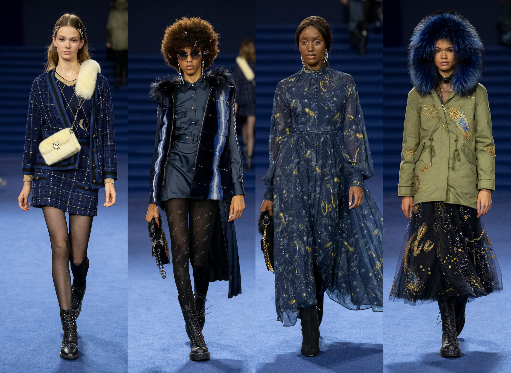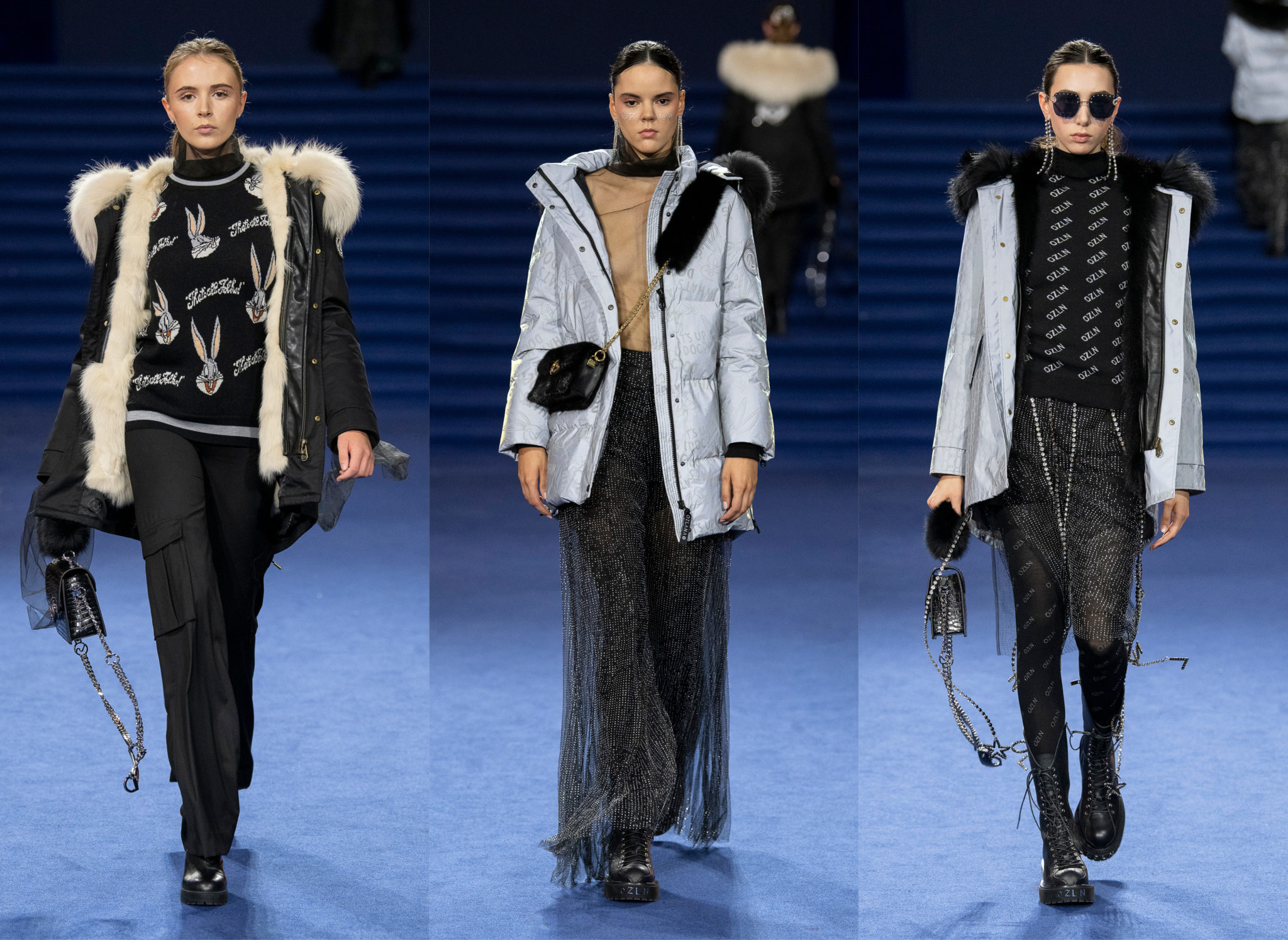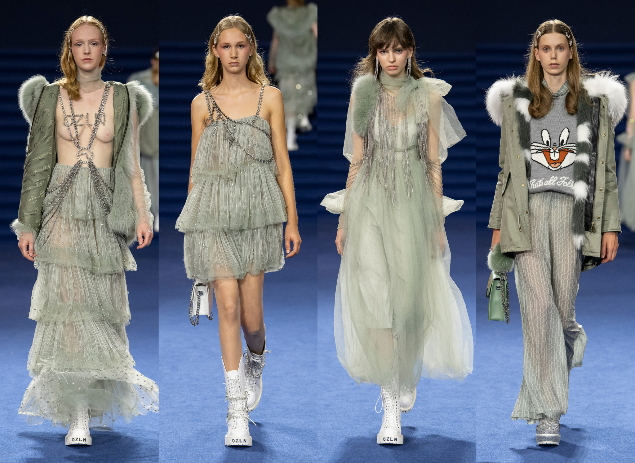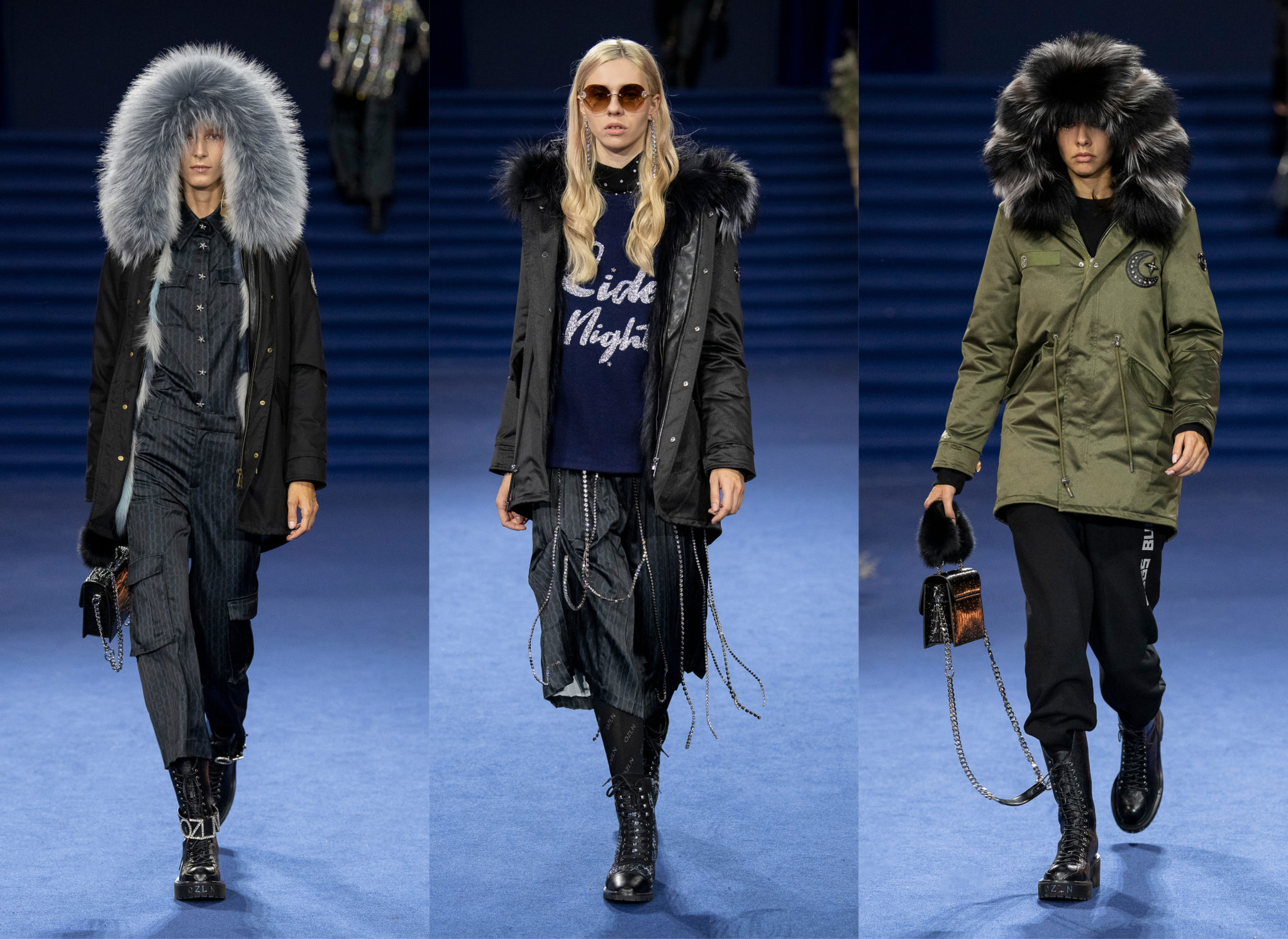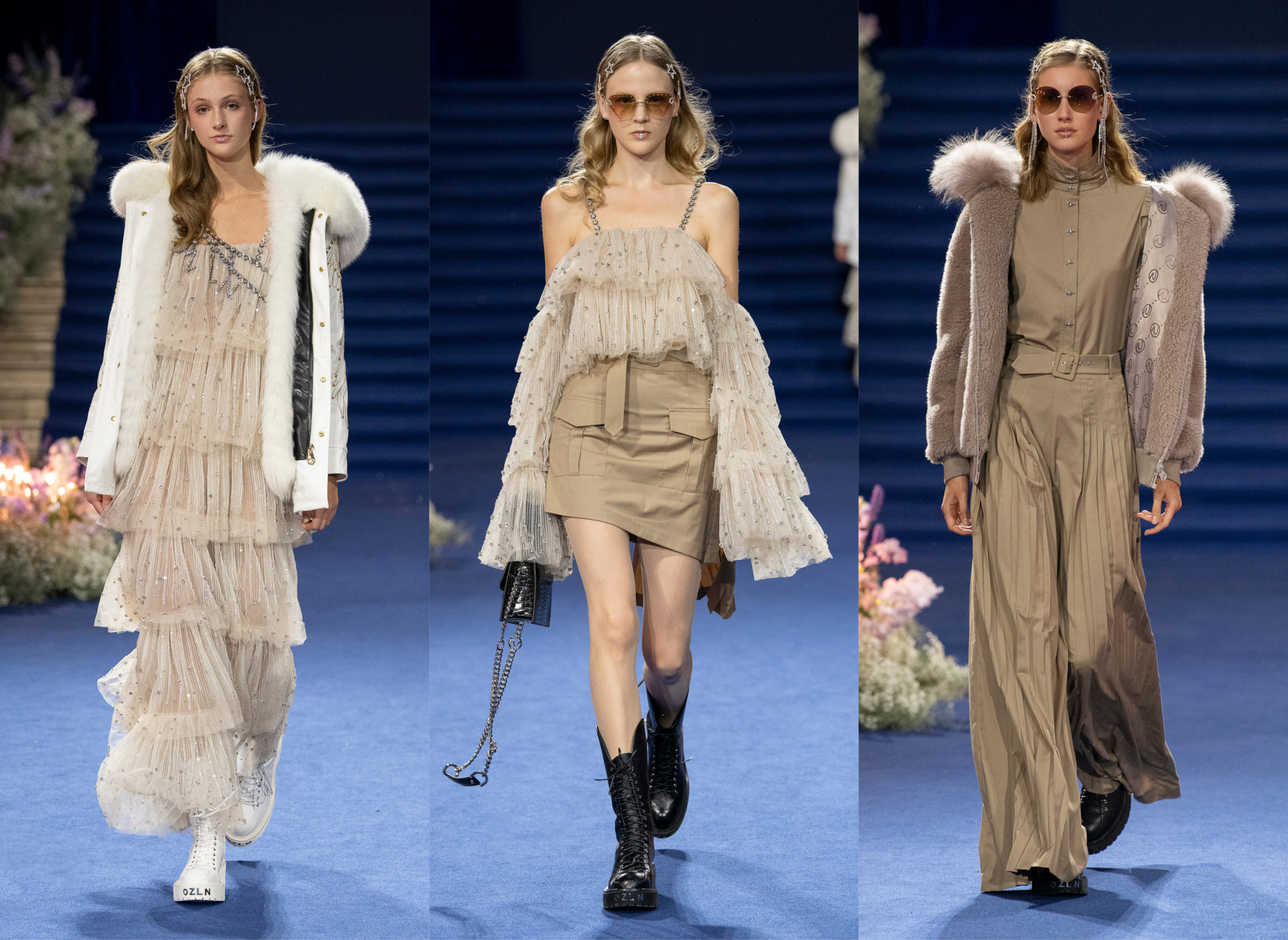 “We believe every woman, every girl, has a fairytale story within their heart – our aim is to fulfill her wonderous dreams and fantasy through the vision of OZLANA.” OZLANA is an Australian fashion brand with a romantic, playful personality, explored through story-telling inspired concepts. Devoted to quality fabrications, glimmering embellishments, & brand collaborations, the brand embodies a style of youthful & modern femininity, channelled through the signature Fur Parka, a traditional piece updated with the classic OZLANA touch. “The Neverland” Collection is the next chapter of the OZLANA story, a celebration of the surreal and enigmatic. OZLANA opens this world to the audience through their set, music composition, runway garments & brand collaborations, seeking to immerse them in their world, engaging all the senses, from the scent of the fresh florals, the bespoke music that swelled as guests took their place, to the Chupa Chups VIPs found amongst the gift bags. Collaborating with other artists, brands, and characters allow OZLANA to explore more story telling avenues, widening their world with every connection. The Neverland is a theatrical opera – the audience were invited to witness, watching live as magic happens before their eyes as the models cross the runway, in the boundary between reality & the surreal. The set indulges this fantasy, creating the world with navy velvet curtains hanging thick behind the runway & audience. The runway sparkles with chandeliers laid on navy carpet, as if fallen from the sky itself, with wild purple & white flowers organically placed across the runway & stairs of the grand Palais de la Decouverte space, elevated by the traditional French architecture. The Neverland collection revolved around five elements – the practical & lush fur parka, with decadent fur spilling over the collar & from inside. Crystal star showered tulles in soft ivory, sage, and light twilight blue. Structured asymmetrical wool suiting’s, pleats framing the body. Prints by Australian artist Victoria Garcia told the fable of The Neverland, rippling across voluminous dresses and western shirts in soft georgette, windblown as she crossed the heavens. The journey through the stars is reflected in the crystals & constellation prints that grace the collection, cascading off the bodies of the models, harnessed to them, wrapped entirely in this glimmering celestial dream. Even the buttons – tiny stars in silver & bronze, punctuating the waists & shoulders. The collection moves through stages, changing as the OZLANA girl grows through her flight. She finds her way to the neverland through the skies – she crosses constellations, galloping through the heavens. She begins her journey, determined and strong, marching to a dark electronic beat. The music settles, falling to a sweet serenity littered with the sounds of angelic starfall, bells chiming in a celestial melody. As she reaches the door to neverland, the music swells, building to an operatic crescendo, and the garments darken again, taking on a deep midnight hue with golden accents – signifying her conquest of the skies, her dream fulfilled. The audience never witnesses the neverland – they only witness her journey, and her growth, from naivety to strong confidence, but as the music builds to it’s climax, the finale march of models drop their hood, signifying their destination reached. As each model marches past – sweet sensibilities of her soft blue, ivory tulles giving way to the darkest hues of night – her pilgrimage is clear. The collection includes collaborations with Looney Tunes’ Bugs Bunny & Chupa Chups, defining a childlike naivety, and also introduces a collaboration with Kopenhagen Fur, creating artisanal parka and fur vest showpieces for the collection. By inviting Bugs Bunny & Chupa Chups into our Neverland world, the garments are playful & self aware of the childhood motifs throughout the collection, whilst also ensuring the garments are accessible by blurring the lines between commercial & artistic design. OZLANA created a SS20 Sunglasses collection with CARIN, a sunglasses brand from Korea. Following on from their collaboration in NYFW SS19, this collection included the first custom designs by OZLANA, featuring styles that reflected The Neverland collection, in light gold & dark navy tones. Swarovski crystals and smooth matte gold hardware formed two new styles to be released in October 2019. The Neverland also debuts a collaboration with world renowned Kopenhagen Fur. This collaboration includes the highest European standard of artisan creations for The Neverland runway, as well as an exclusive first commercial mink fur collection for OZLANA. Kopenhagen Fur is the leafing provider of fur, recognised for it’s exceptional quality & welfare. Kopenhagen Studio, the creative centre & development lab for Kopenhagen Fur is a centre of inspiration, innovation & creativity. Designers, fashion houses and key industry figures around the world come to Kopenhagen Studio to work with the highly skilled in-house artisan. As such, Kopenhagen Studio created two artisan fur vests for the runway, created with the utmost skill in Denmark & Greece, take advantage of the highest quality techniques around the world. As an outerwear brand, OZLANA’s parkas are on the outside practical and sensible, with a hint of the luxurious dreams rippling on the lush fur collar. Once zipped open, however, and fully enveloped in the pastel, dreamy fur inside – the experience is forever changed.
