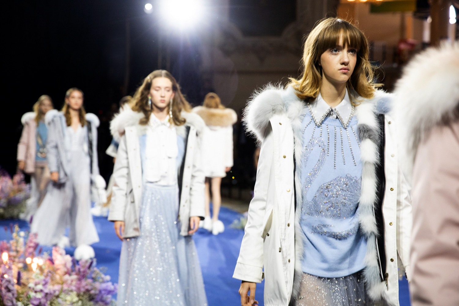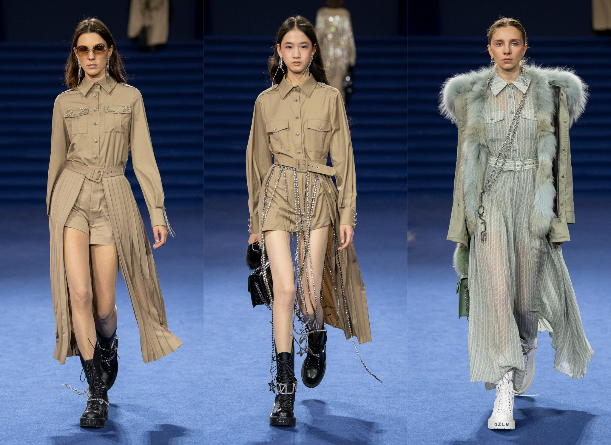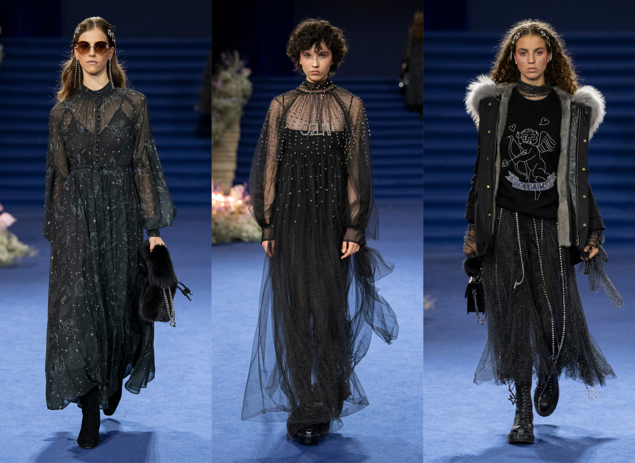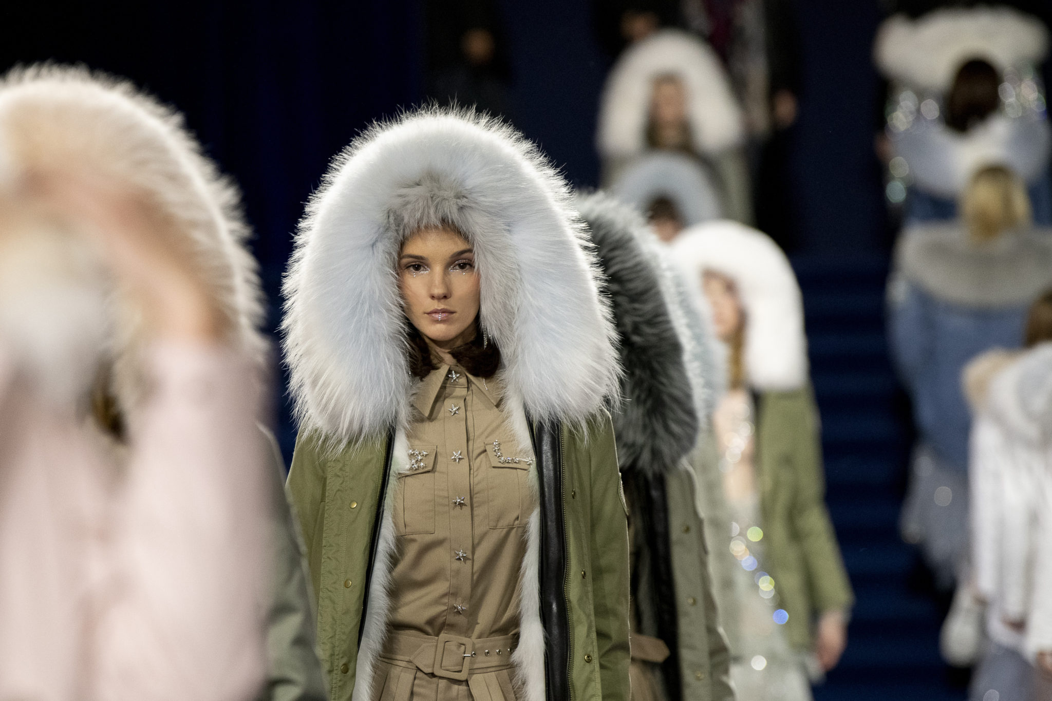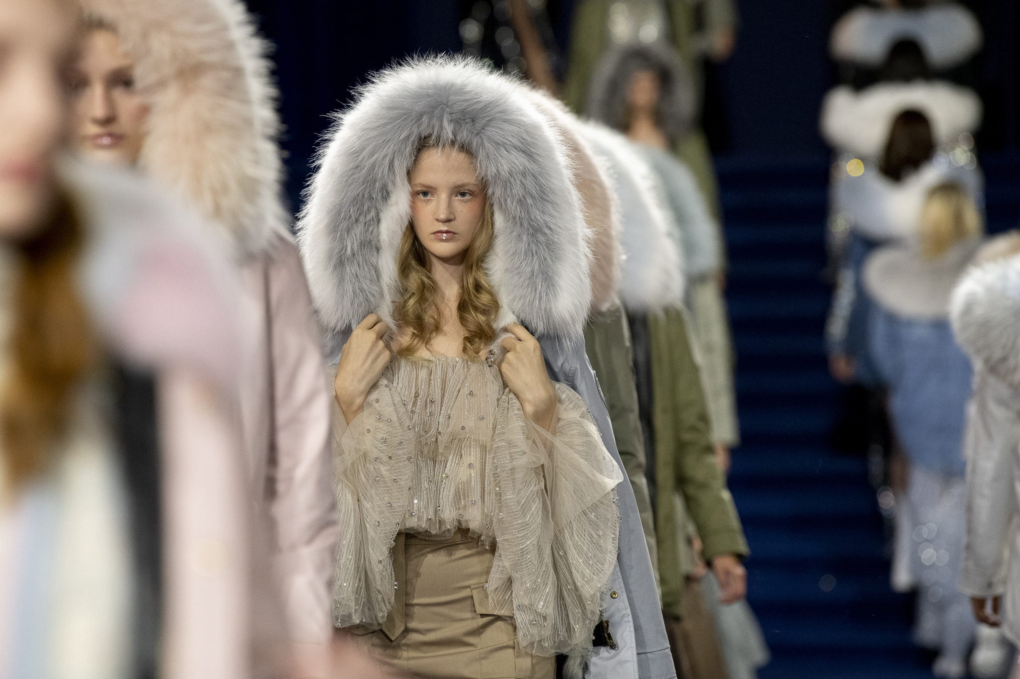 “We believe every woman, every girl, has a fairytale story within their heart – our aim is to fulfill her wonderous dreams and fantasy through the vision of OZLANA.” OZLANA is an Australian fashion brand with a romantic, playful personality, explored through story-telling inspired concepts. Devoted to quality fabrications, glimmering embellishments, & brand collaborations, the brand embodies a style of youthful & modern femininity, channelled through the signature Fur Parka, a traditional piece updated with the classic OZLANA touch. “The Neverland” Collection is the next chapter of the OZLANA story, a celebration of the surreal and enigmatic. OZLANA opens this world to the audience through their set, music composition, runway garments & brand collaborations, seeking to immerse them in their world, engaging all the senses, from the scent of the fresh florals, the bespoke music that swelled as guests took their place, to the Chupa Chups VIPs found amongst the gift bags. Collaborating with other artists, brands, and characters allow OZLANA to explore more story telling avenues, widening their world with every connection. The Neverland is a theatrical opera – the audience were invited to witness, watching live as magic happens before their eyes as the models cross the runway, in the boundary between reality & the surreal. The set indulges this fantasy, creating the world with navy velvet curtains hanging thick behind the runway & audience. The runway sparkles with chandeliers laid on navy carpet, as if fallen from the sky itself, with wild purple & white flowers organically placed across the runway & stairs of the grand Palais de la Decouverte space, elevated by the traditional French architecture. The Neverland collection revolved around five elements – the practical & lush fur parka, with decadent fur spilling over the collar & from inside. Crystal star showered tulles in soft ivory, sage, and light twilight blue. Structured asymmetrical wool suiting’s, pleats framing the body. Prints by Australian artist Victoria Garcia told the fable of The Neverland, rippling across voluminous dresses and western shirts in soft georgette, windblown as she crossed the heavens. The journey through the stars is reflected in the crystals & constellation prints that grace the collection, cascading off the bodies of the models, harnessed to them, wrapped entirely in this glimmering celestial dream. Even the buttons – tiny stars in silver & bronze, punctuating the waists & shoulders. The collection moves through stages, changing as the OZLANA girl grows through her flight. She finds her way to the neverland through the skies – she crosses constellations, galloping through the heavens. She begins her journey, determined and strong, marching to a dark electronic beat. The music settles, falling to a sweet serenity littered with the sounds of angelic starfall, bells chiming in a celestial melody. As she reaches the door to neverland, the music swells, building to an operatic crescendo, and the garments darken again, taking on a deep midnight hue with golden accents – signifying her conquest of the skies, her dream fulfilled. The audience never witnesses the neverland – they only witness her journey, and her growth, from naivety to strong confidence, but as the music builds to it’s climax, the finale march of models drop their hood, signifying their destination reached. As each model marches past – sweet sensibilities of her soft blue, ivory tulles giving way to the darkest hues of night – her pilgrimage is clear. The collection includes collaborations with Looney Tunes’ Bugs Bunny & Chupa Chups, defining a childlike naivety, and also introduces a collaboration with Kopenhagen Fur, creating artisanal parka and fur vest showpieces for the collection. By inviting Bugs Bunny & Chupa Chups into our Neverland world, the garments are playful & self aware of the childhood motifs throughout the collection, whilst also ensuring the garments are accessible by blurring the lines between commercial & artistic design. OZLANA created a SS20 Sunglasses collection with CARIN, a sunglasses brand from Korea. Following on from their collaboration in NYFW SS19, this collection included the first custom designs by OZLANA, featuring styles that reflected The Neverland collection, in light gold & dark navy tones. Swarovski crystals and smooth matte gold hardware formed two new styles to be released in October 2019. The Neverland also debuts a collaboration with world renowned Kopenhagen Fur. This collaboration includes the highest European standard of artisan creations for The Neverland runway, as well as an exclusive first commercial mink fur collection for OZLANA. Kopenhagen Fur is the leafing provider of fur, recognised for it’s exceptional quality & welfare. Kopenhagen Studio, the creative centre & development lab for Kopenhagen Fur is a centre of inspiration, innovation & creativity. Designers, fashion houses and key industry figures around the world come to Kopenhagen Studio to work with the highly skilled in-house artisan. As such, Kopenhagen Studio created two artisan fur vests for the runway, created with the utmost skill in Denmark & Greece, take advantage of the highest quality techniques around the world. As an outerwear brand, OZLANA’s parkas are on the outside practical and sensible, with a hint of the luxurious dreams rippling on the lush fur collar. Once zipped open, however, and fully enveloped in the pastel, dreamy fur inside – the experience is forever changed.