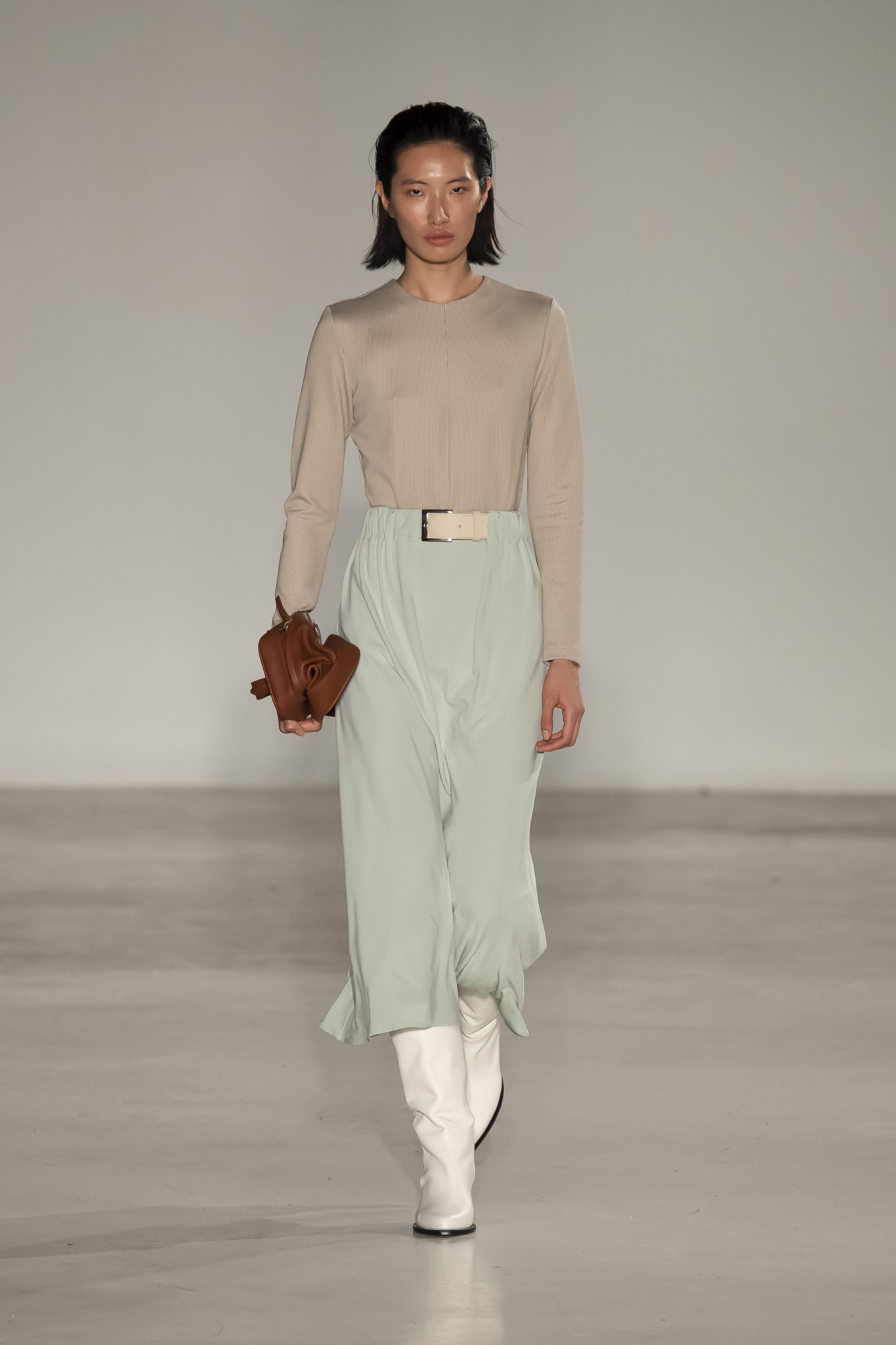 The unexpected use of jersey across categories is a fresh venture that emphasises the idea of fluidity penetrating all aspects of the collection. An important element of inspiration is Claire McCardell’s legacy of radical comfort, which NEHERA embodies in the use of menswear details, high-waisted voluminous bottoms and matching separates with a modern twist.