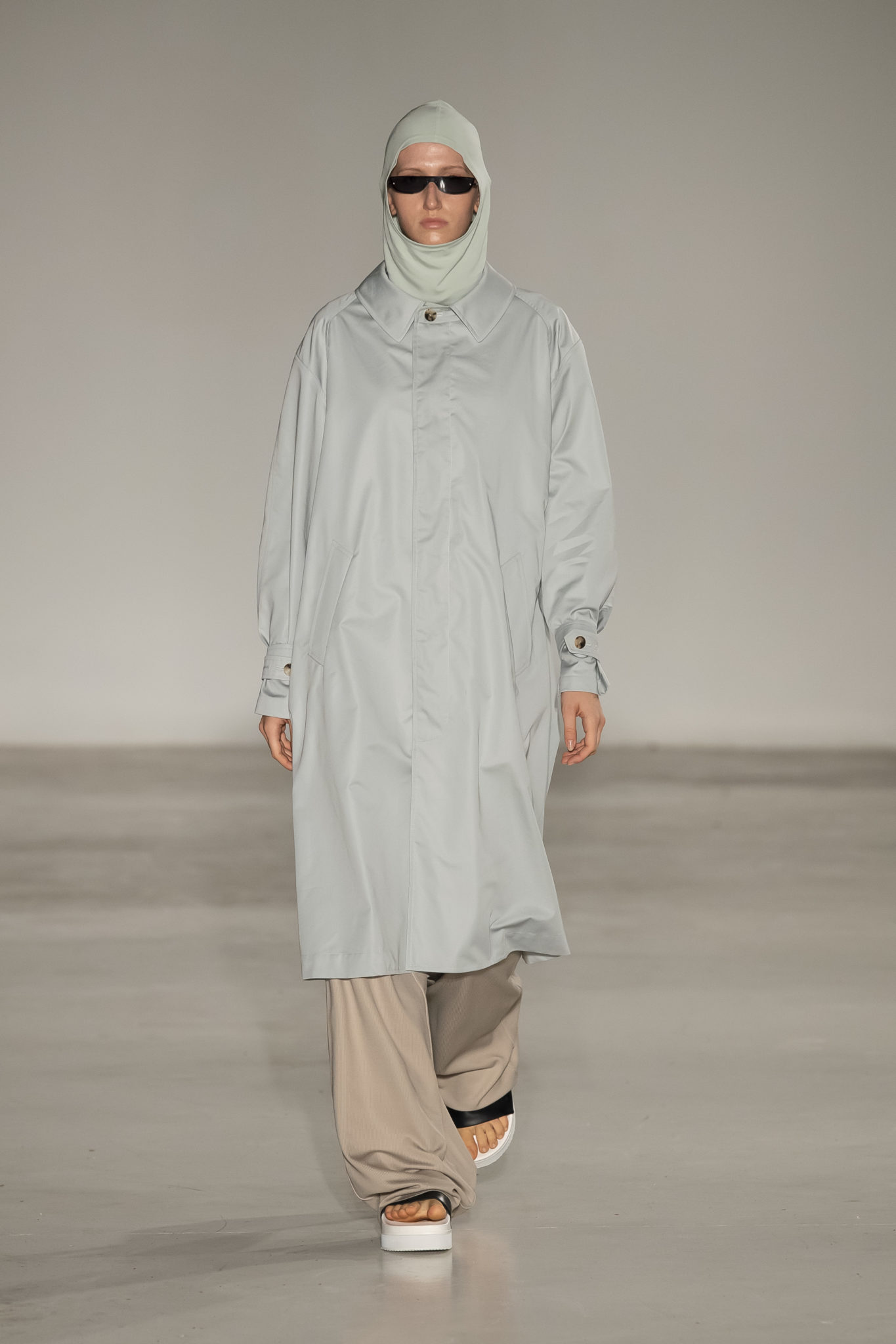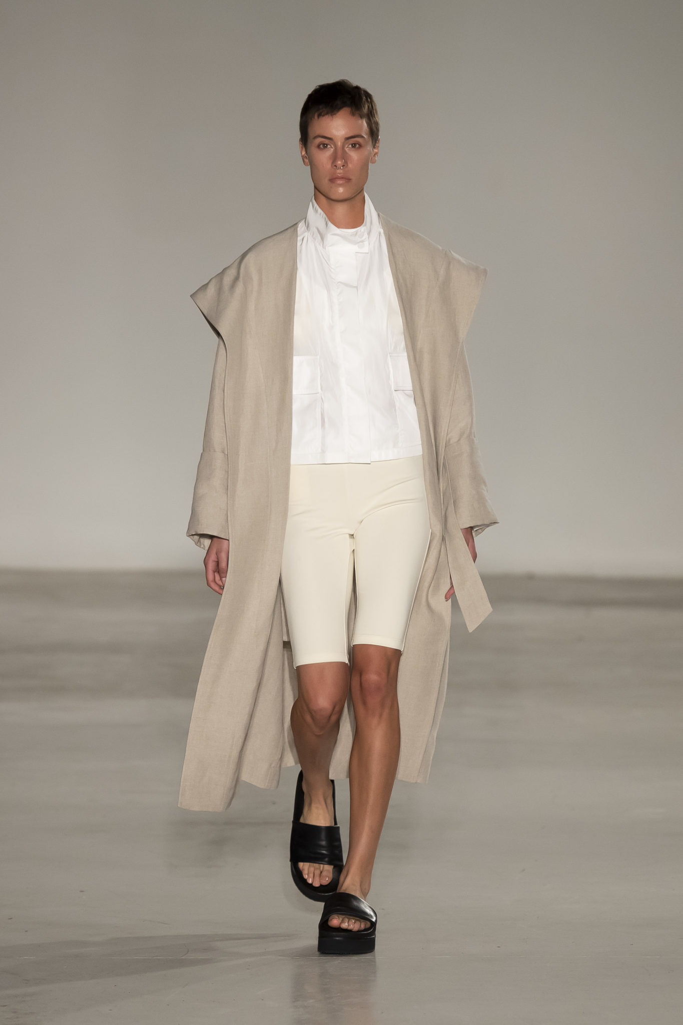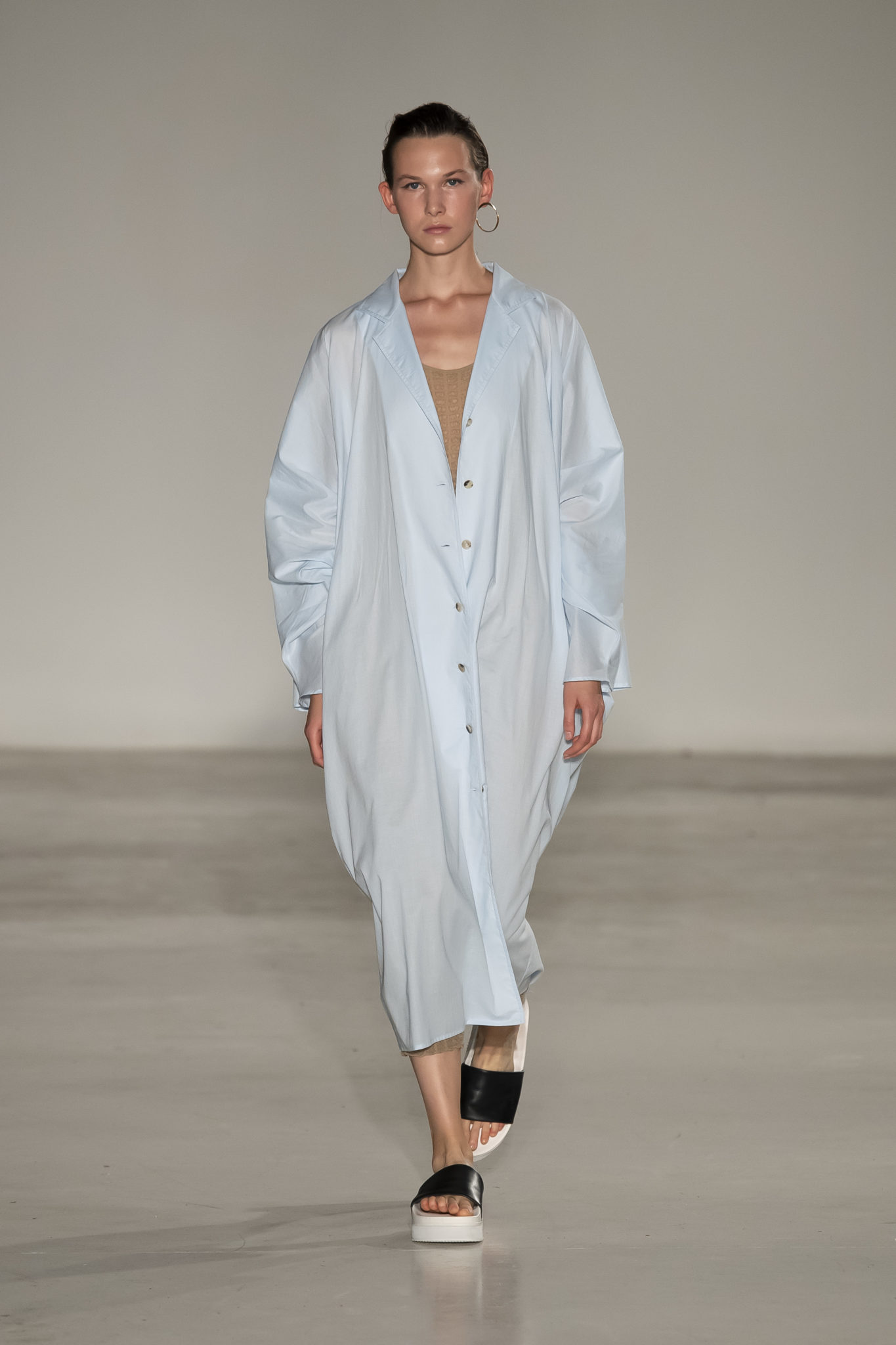 Outerwear, jackets and fabrics as wool, poplin, linen are always among NEHERA ́s essential stories, representing codes of function and lightness. The back slits on the classic NEHERA gabardine trench coat and linen jacket add a sense of depth to the garment offering many styling variations. Continued use of airy technical fabrics are seen in the extra light overcoat with a draped parachute detail, as well as the tentlike dress that hangs loosely. When fixed with a belt, these garments hug a woman ́s figure