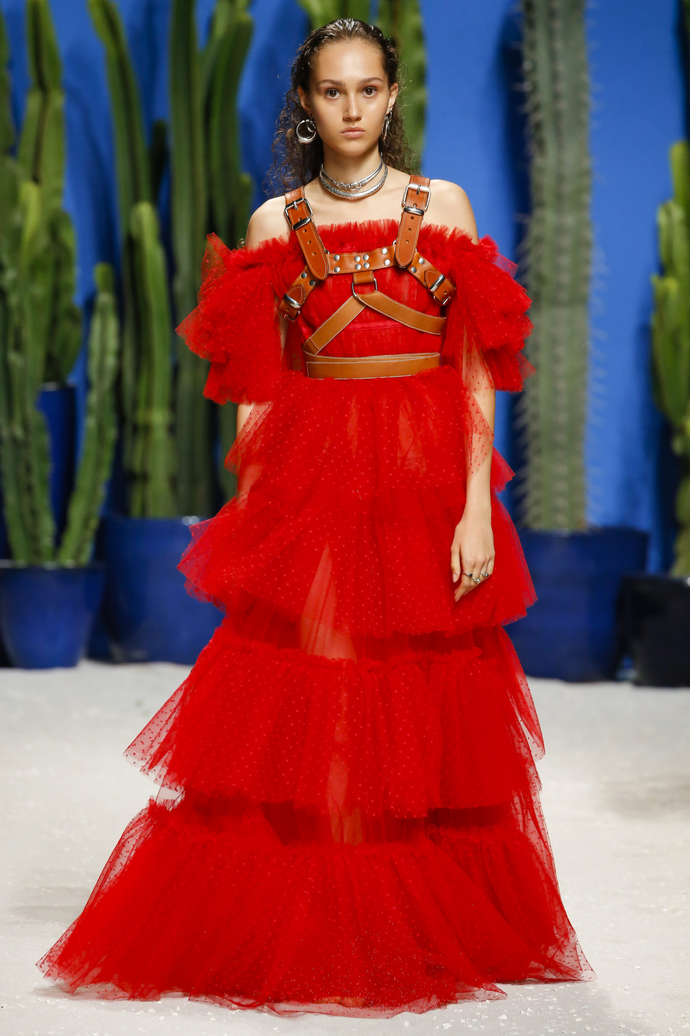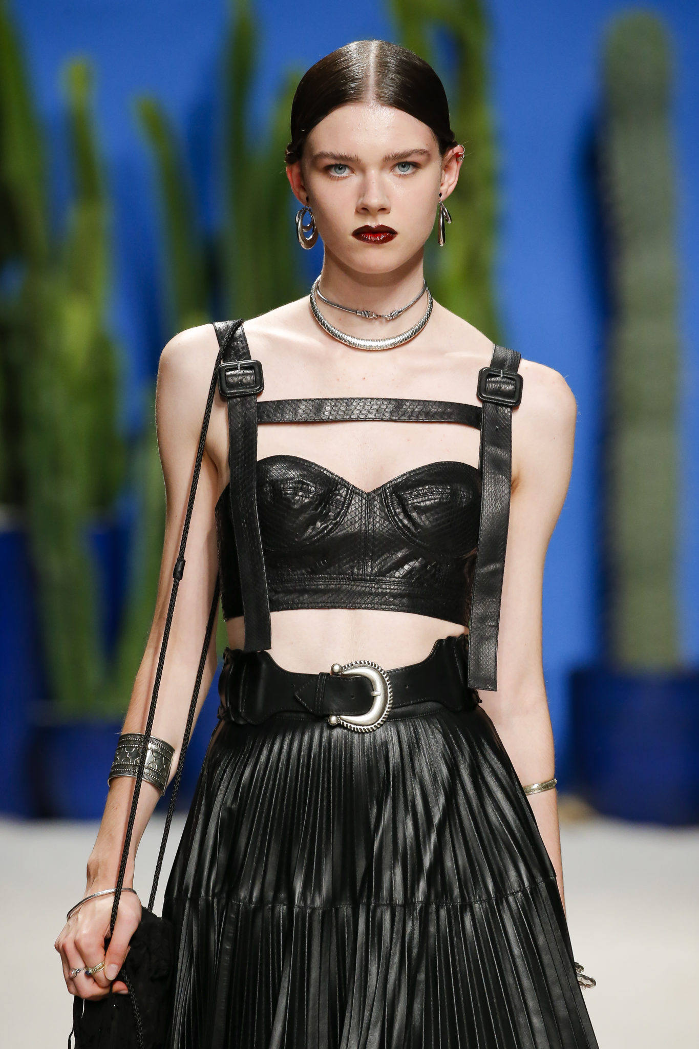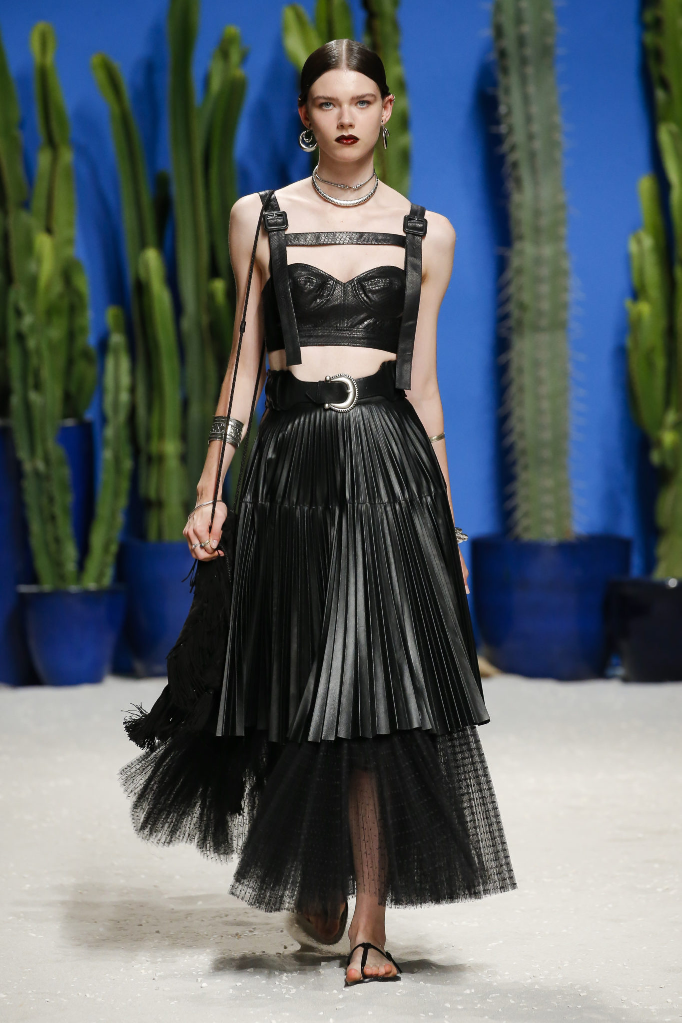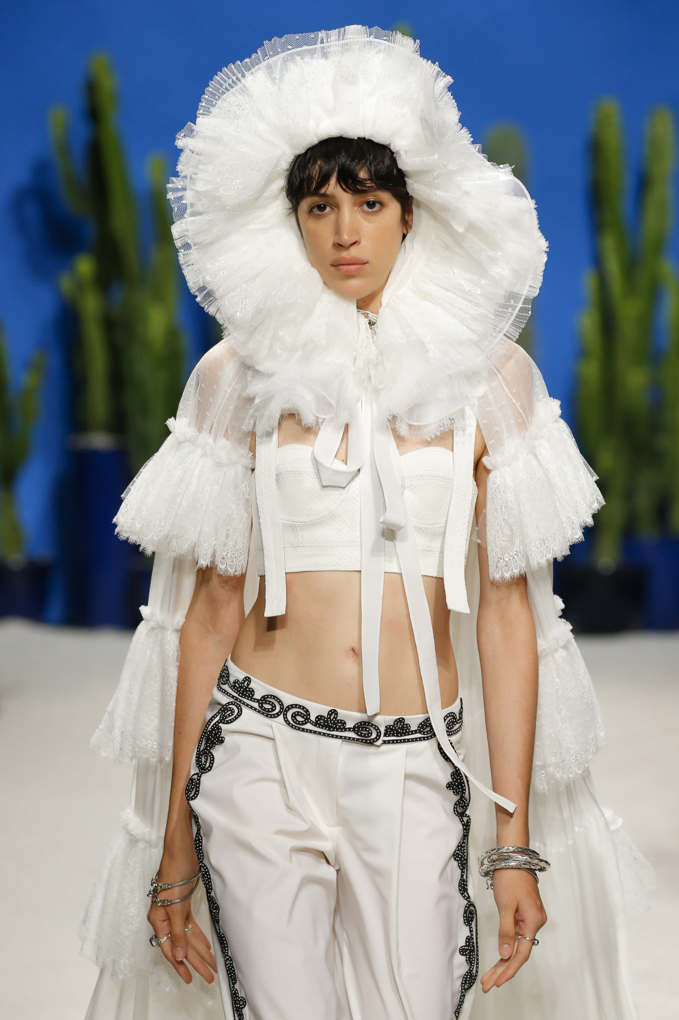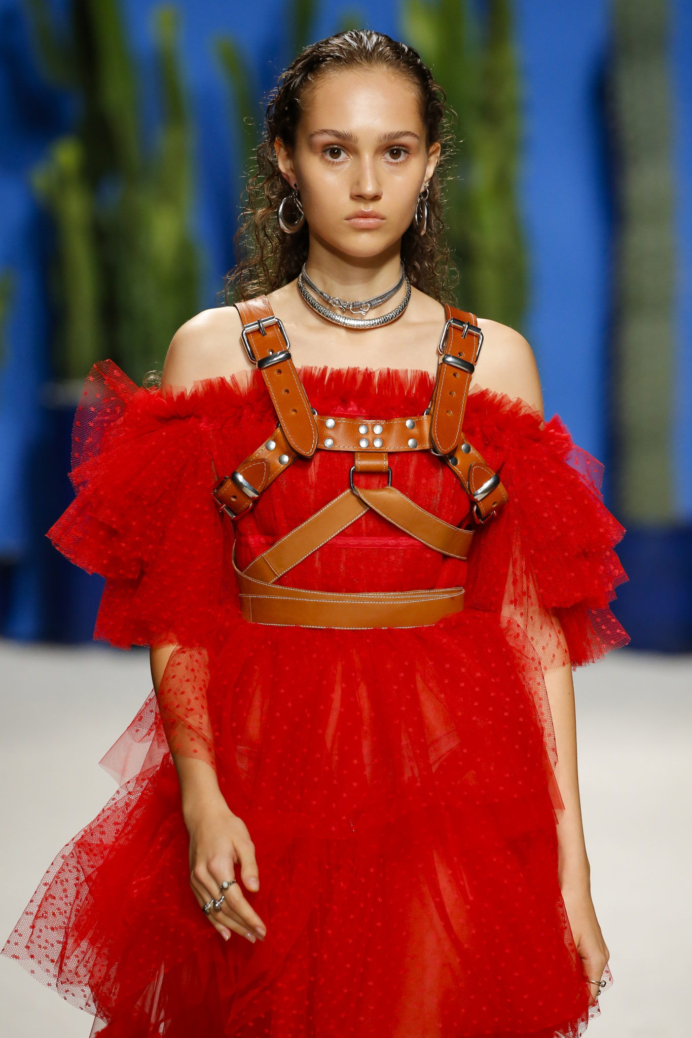 The new collection comprises a plethora of structured bustiers in pleated plumetis and leather harnesses, with a wide-ranging proposal of fluid, long, strapless dresses and imposing skirts adorned with ruffles, ribbons, lace or macramé. An ultra-short boned mini-dress combined with many other structured pieces, shirts with voluminous sleeves, a long jacket cinched at the waist with double seams, a jacket worn over wide-legged pants and a tiered ruffle cape, are all emblematic of the seasonal inspiration.