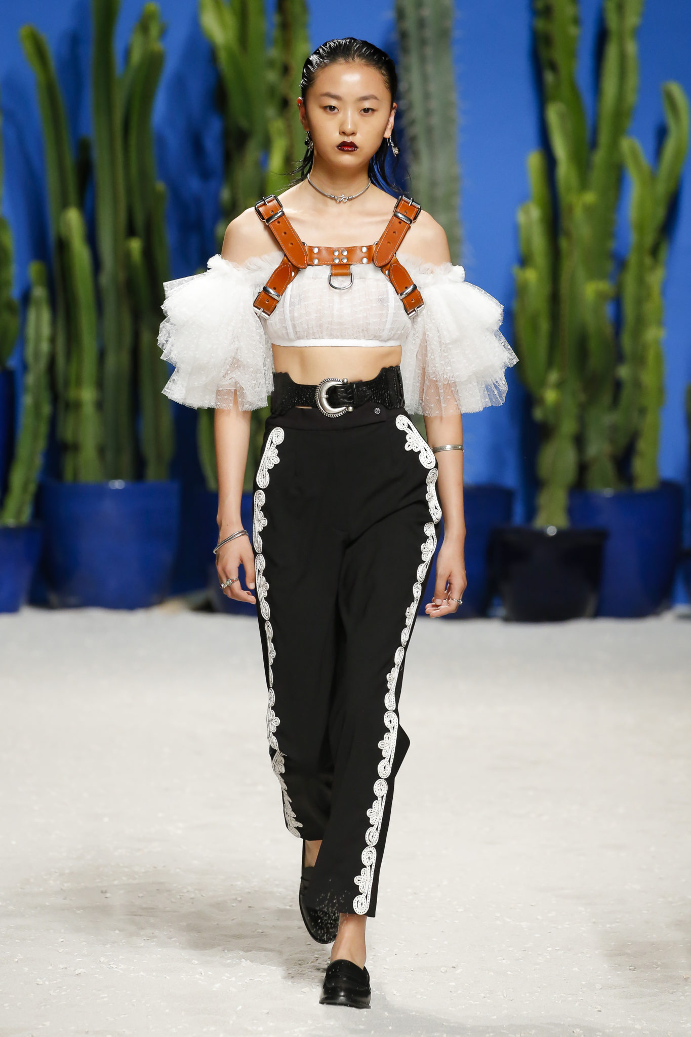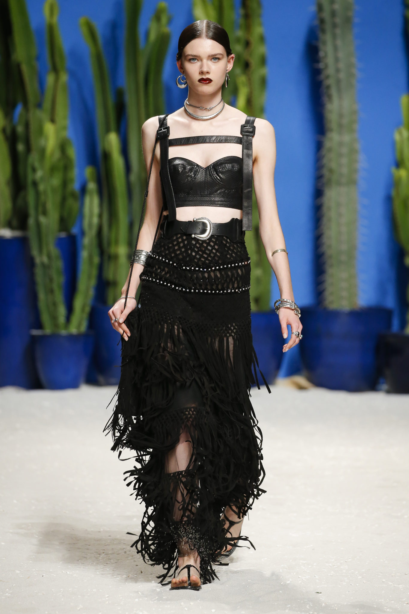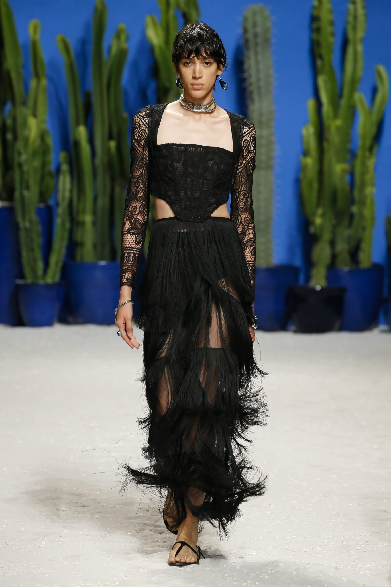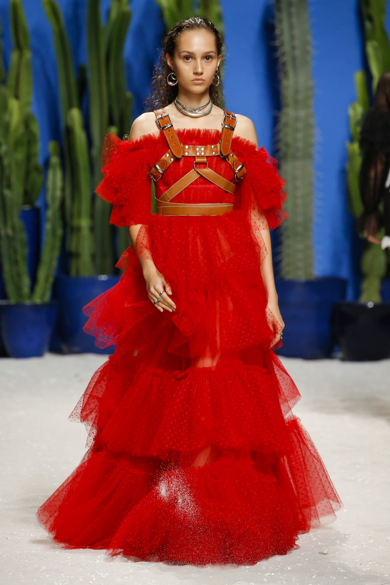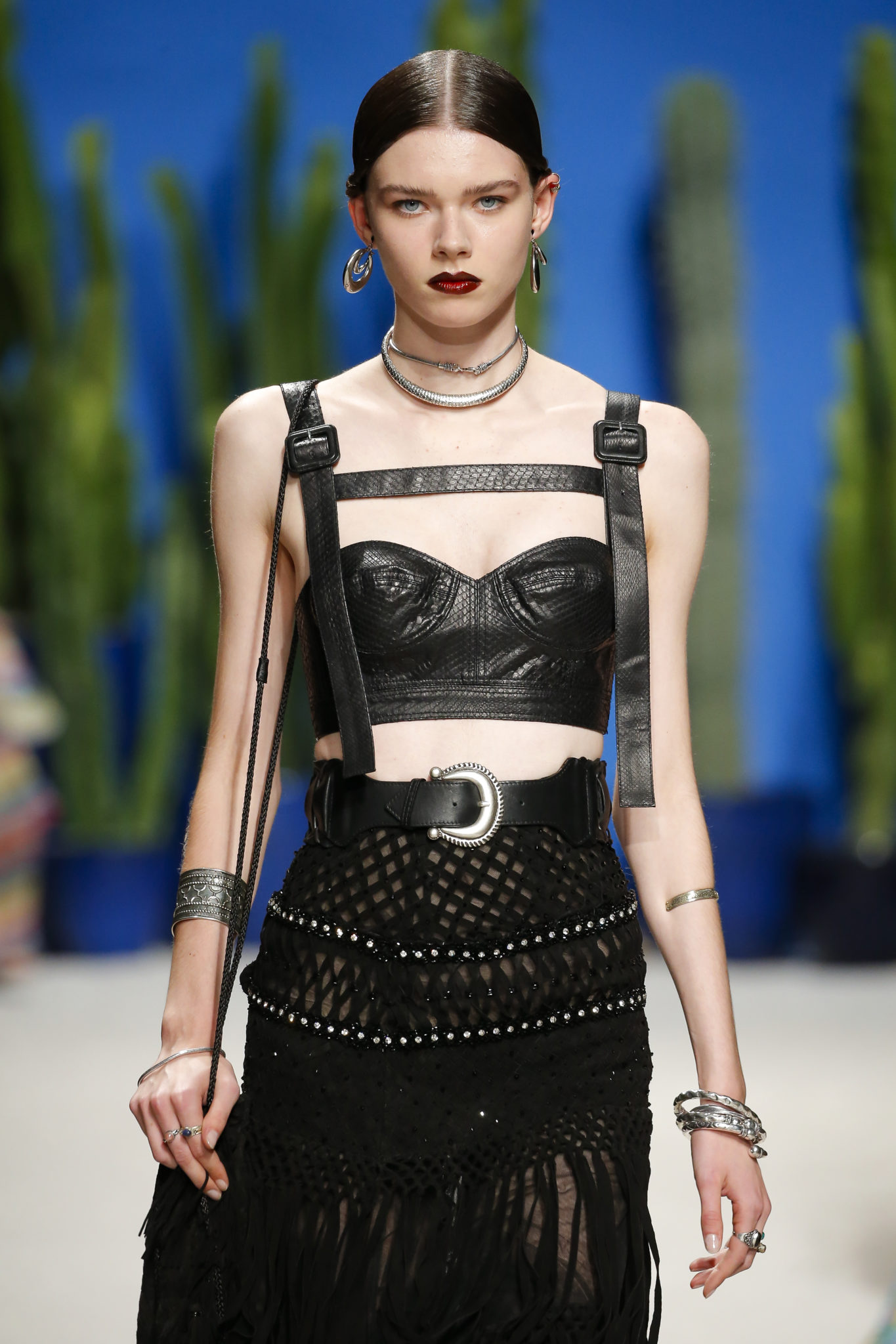 The new collection comprises a plethora of structured bustiers in pleated plumetis and leather harnesses, with a wide-ranging proposal of fluid, long, strapless dresses and imposing skirts adorned with ruffles, ribbons, lace or macramé. An ultra-short boned mini-dress combined with many other structured pieces, shirts with voluminous sleeves, a long jacket cinched at the waist with double seams, a jacket worn over wide-legged pants and a tiered ruffle cape, are all emblematic of the seasonal inspiration.