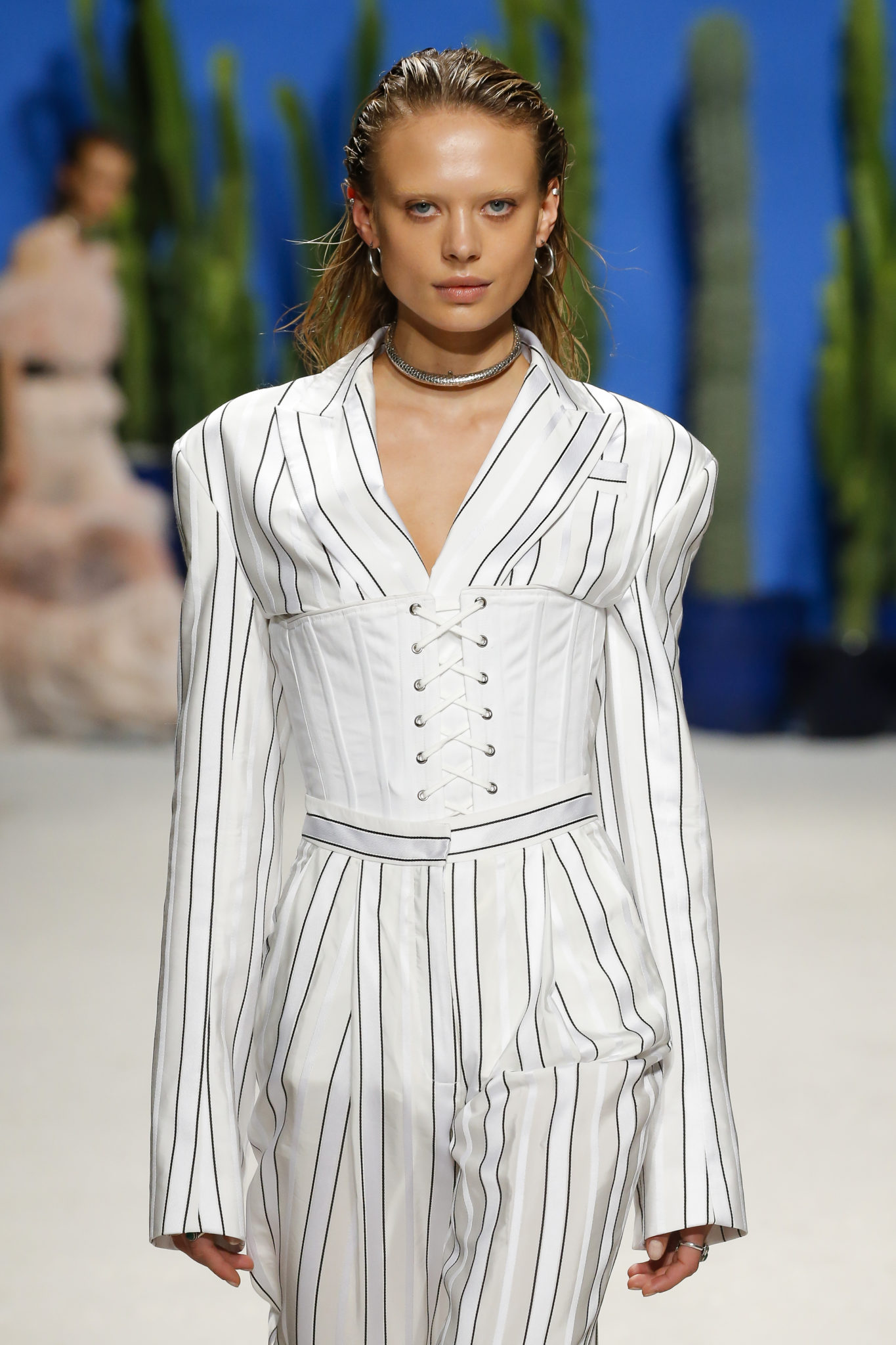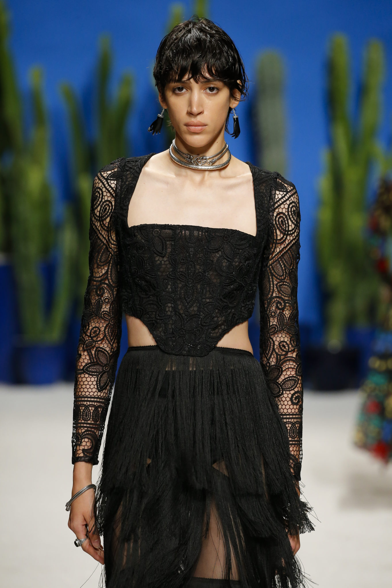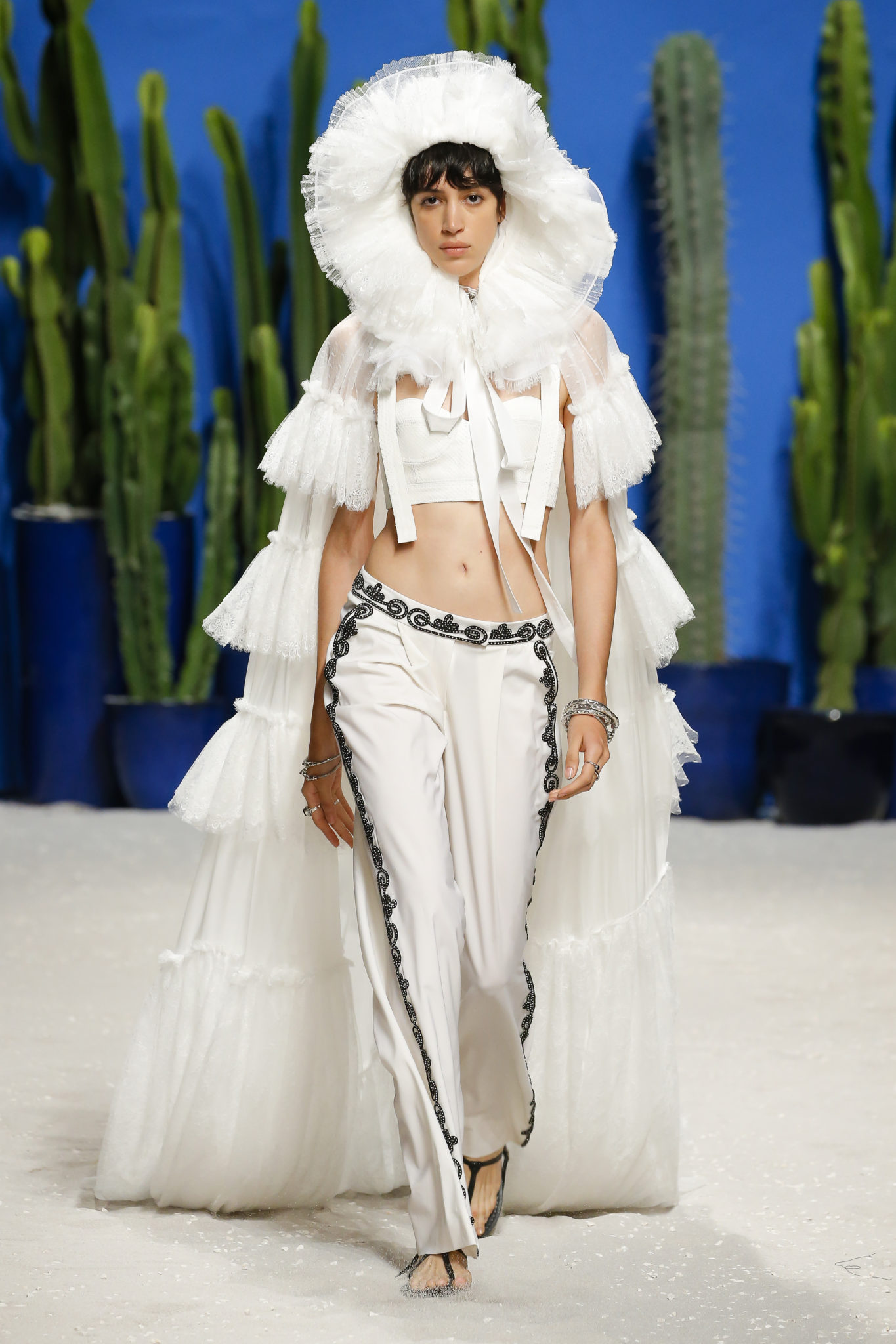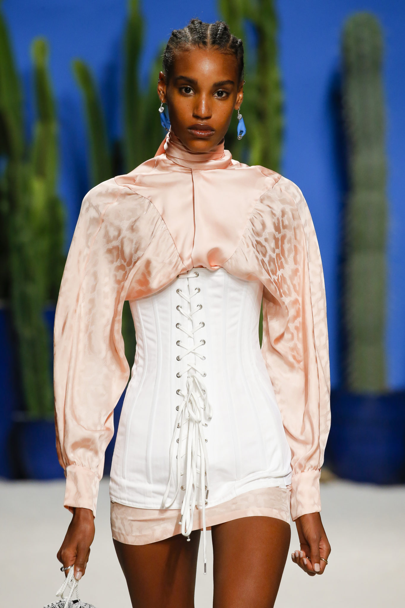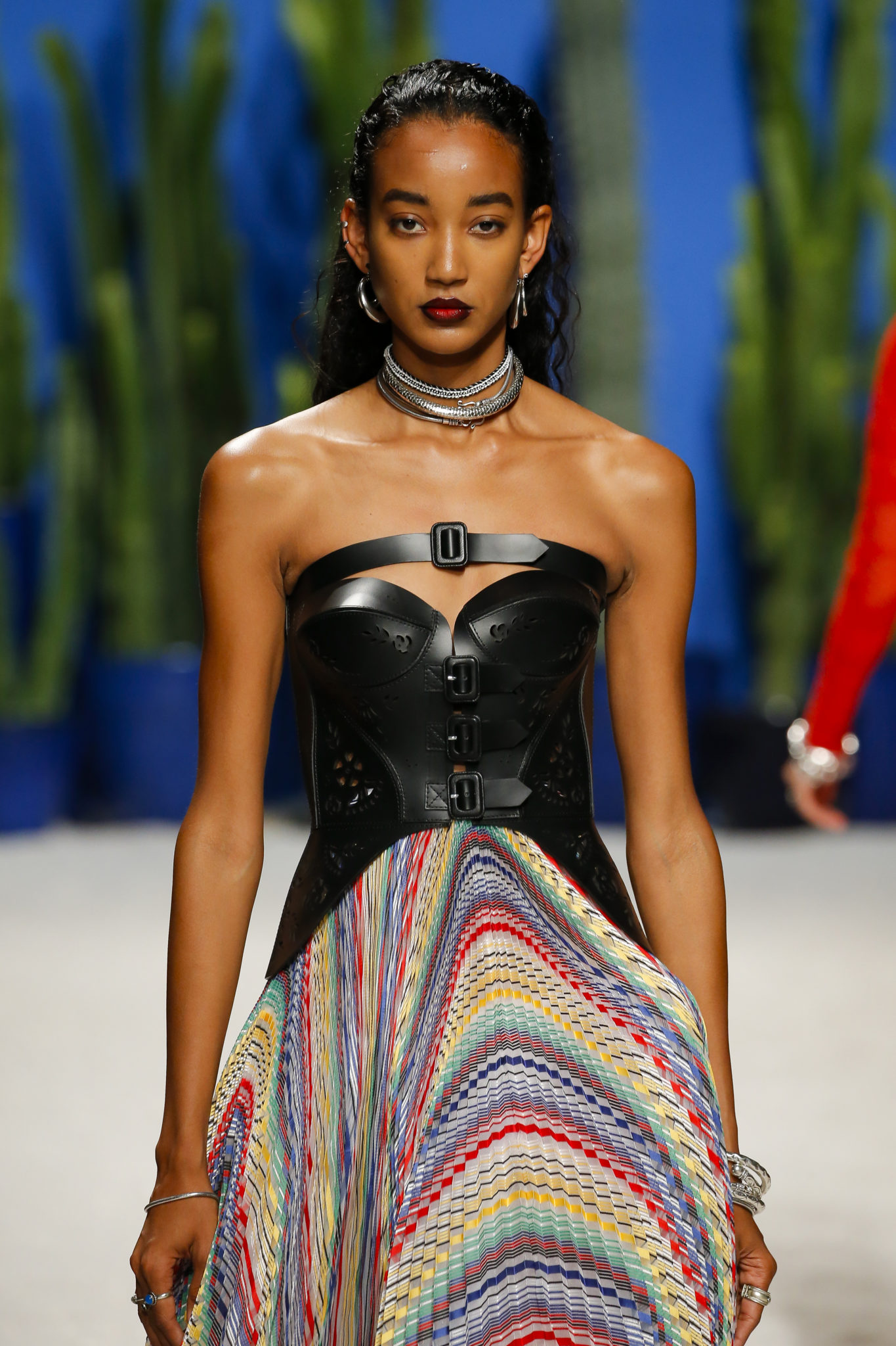 The new collection comprises a plethora of structured bustiers in pleated plumetis and leather harnesses, with a wide-ranging proposal of fluid, long, strapless dresses and imposing skirts adorned with ruffles, ribbons, lace or macramé. An ultra-short boned mini-dress combined with many other structured pieces, shirts with voluminous sleeves, a long jacket cinched at the waist with double seams, a jacket worn over wide-legged pants and a tiered ruffle cape, are all emblematic of the seasonal inspiration.