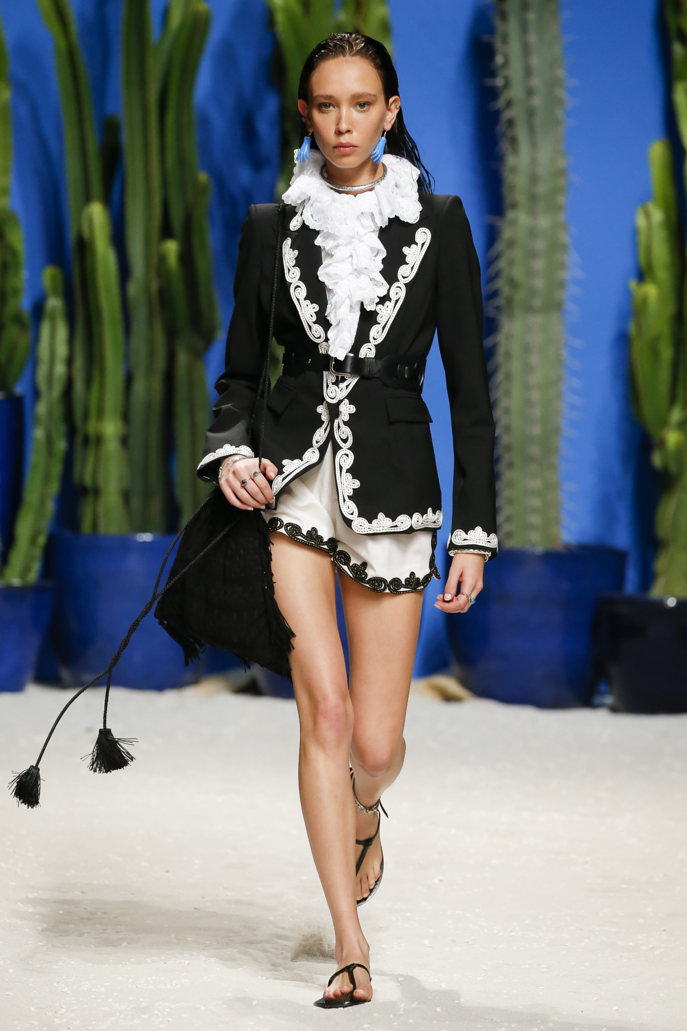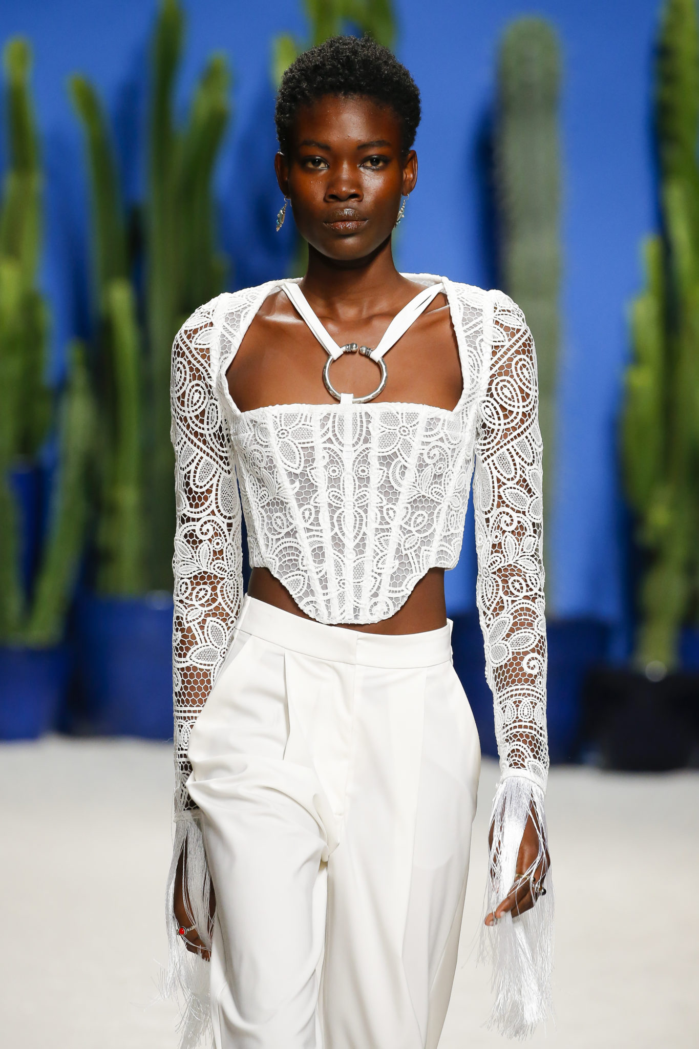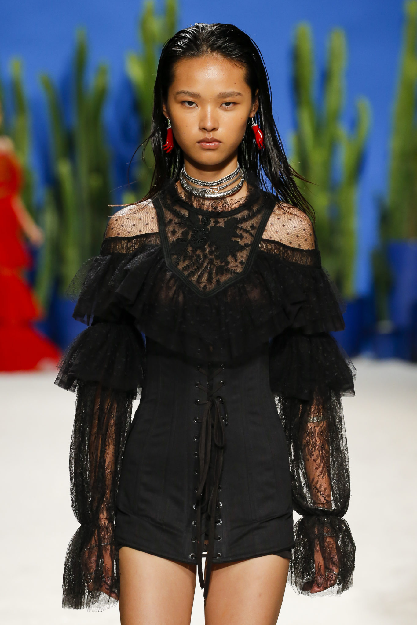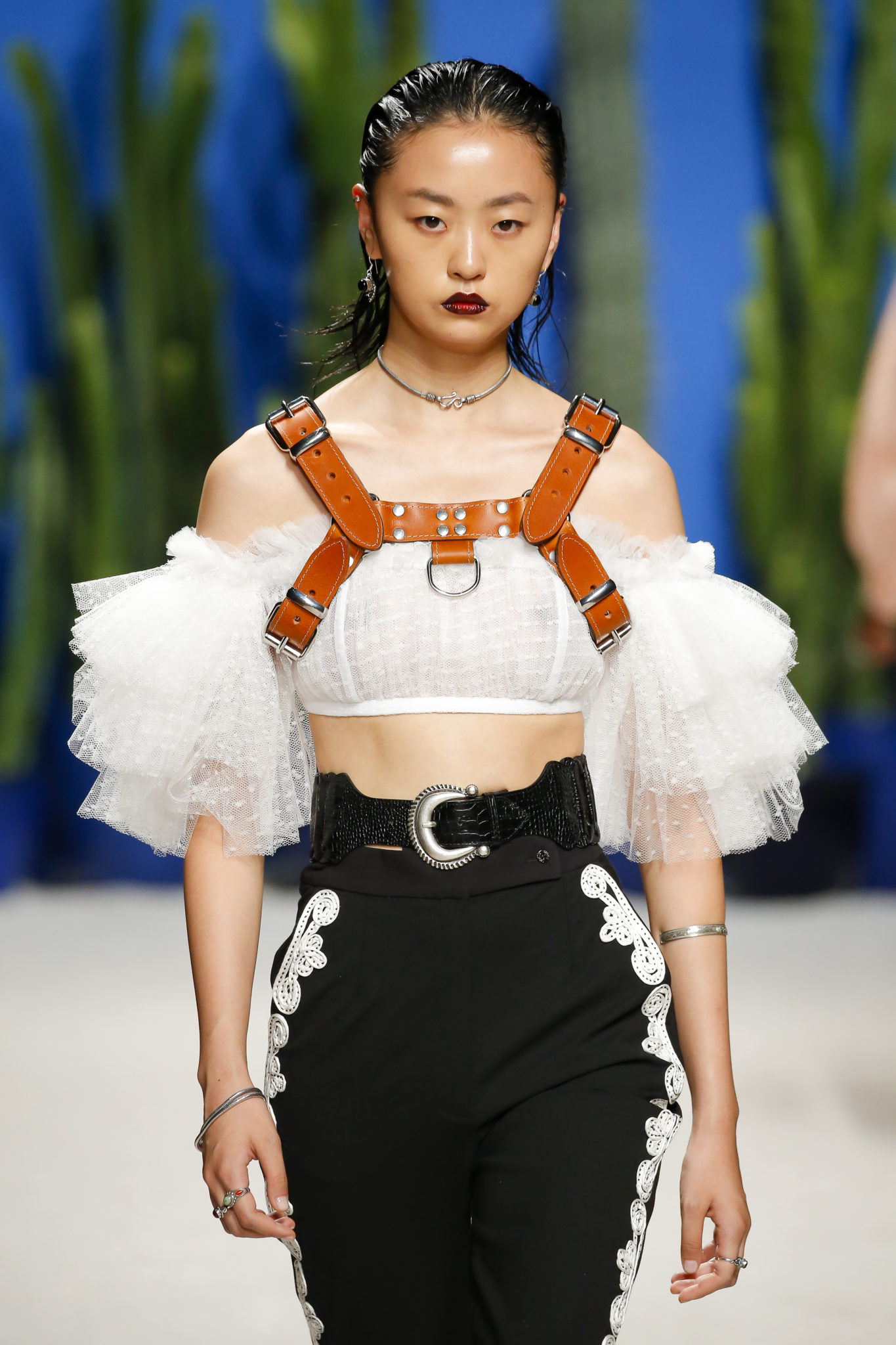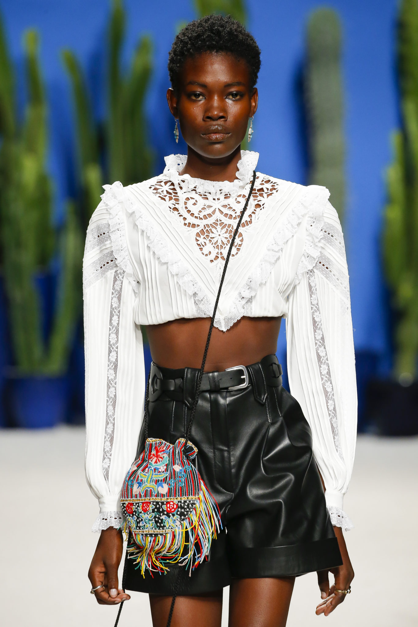 The new collection comprises a plethora of structured bustiers in pleated plumetis and leather harnesses, with a wide-ranging proposal of fluid, long, strapless dresses and imposing skirts adorned with ruffles, ribbons, lace or macramé. An ultra-short boned mini-dress combined with many other structured pieces, shirts with voluminous sleeves, a long jacket cinched at the waist with double seams, a jacket worn over wide-legged pants and a tiered ruffle cape, are all emblematic of the seasonal inspiration.