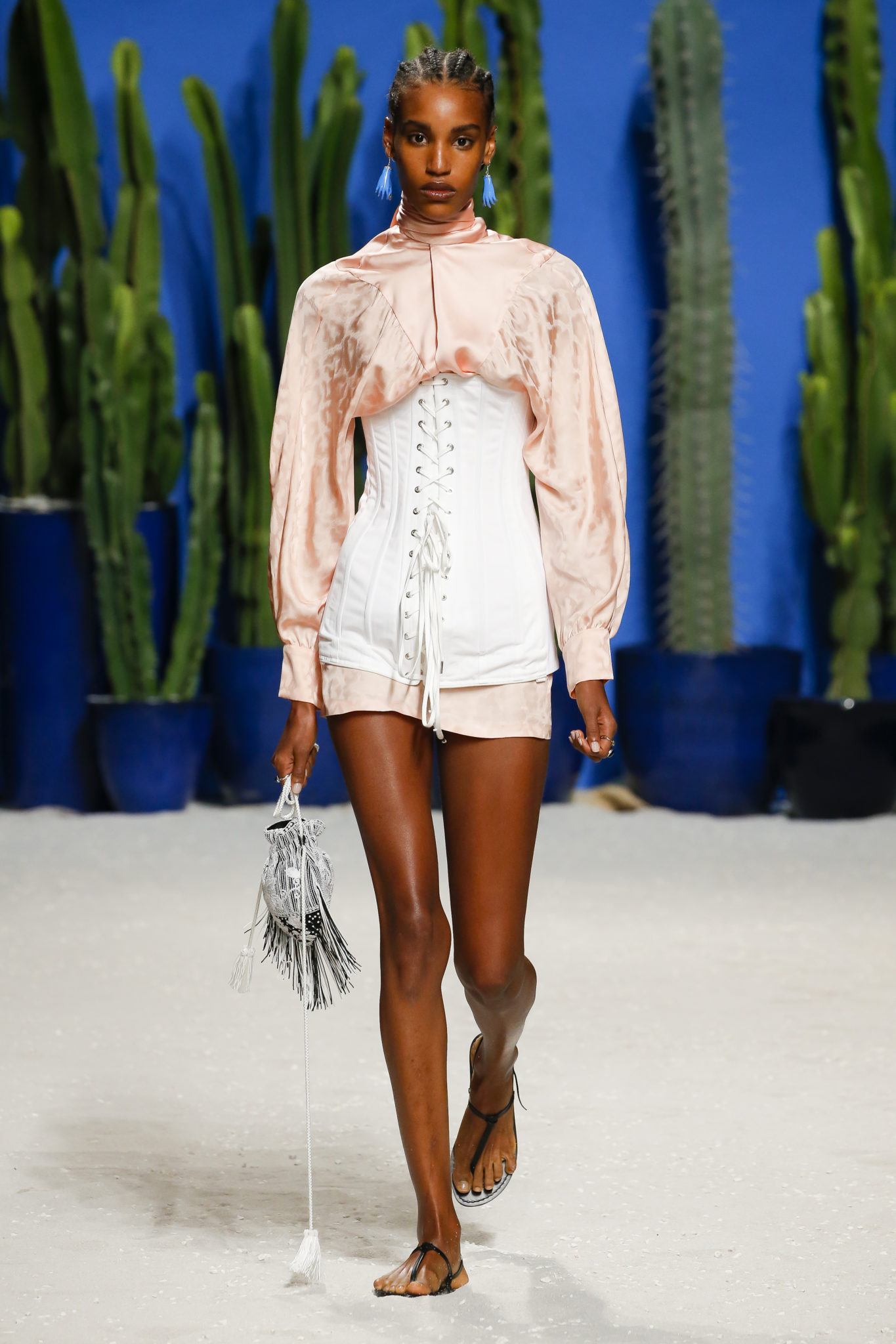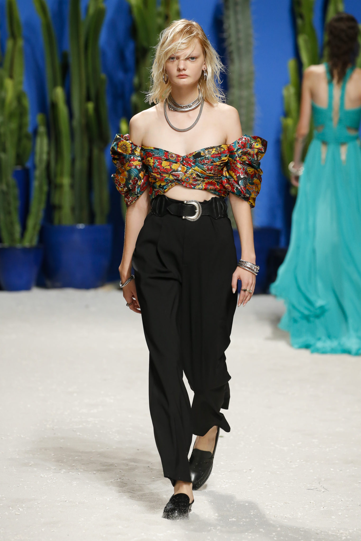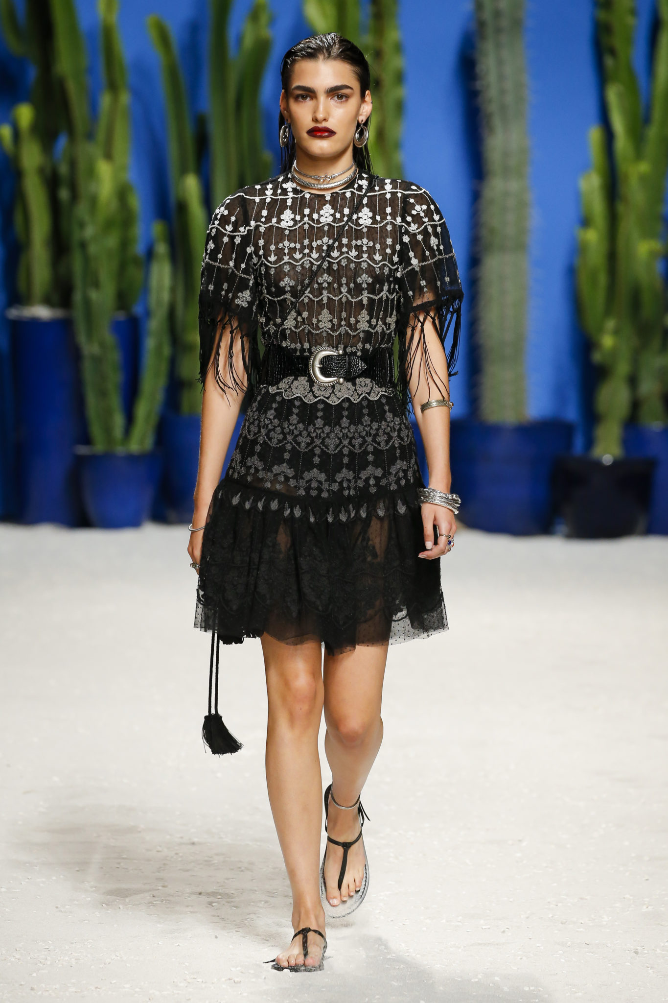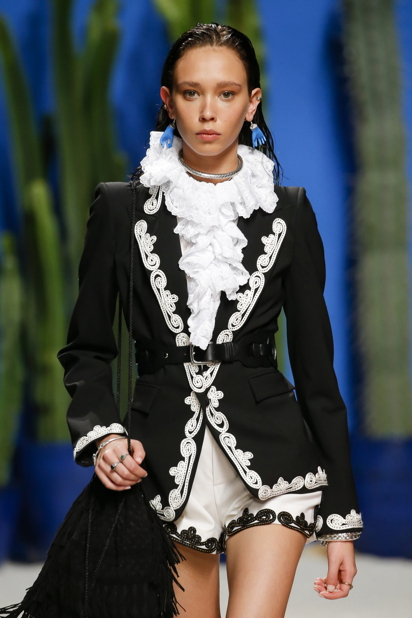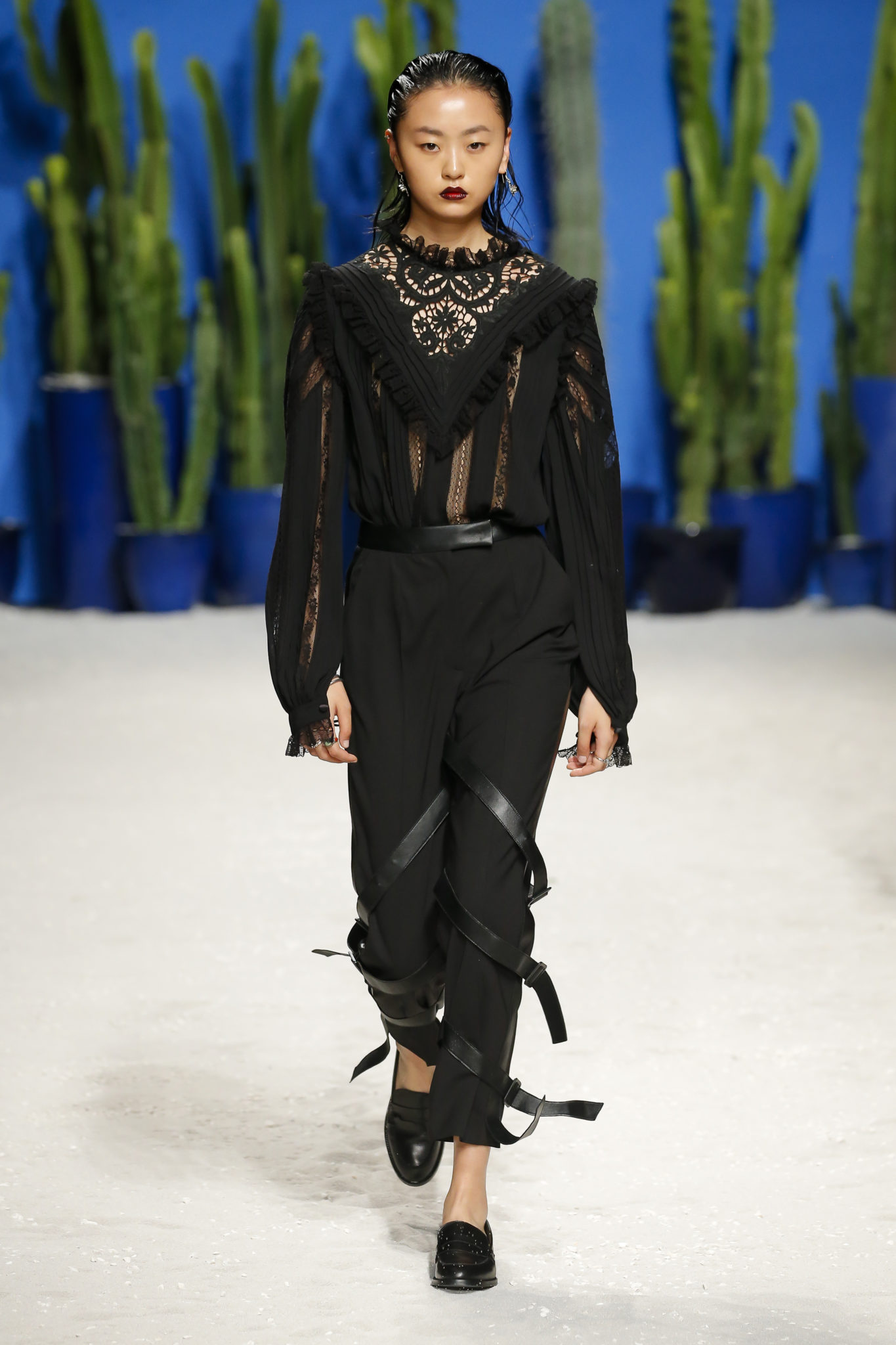 The new collection comprises a plethora of structured bustiers in pleated plumetis and leather harnesses, with a wide-ranging proposal of fluid, long, strapless dresses and imposing skirts adorned with ruffles, ribbons, lace or macramé. An ultra-short boned mini-dress combined with many other structured pieces, shirts with voluminous sleeves, a long jacket cinched at the waist with double seams, a jacket worn over wide-legged pants and a tiered ruffle cape, are all emblematic of the seasonal inspiration.