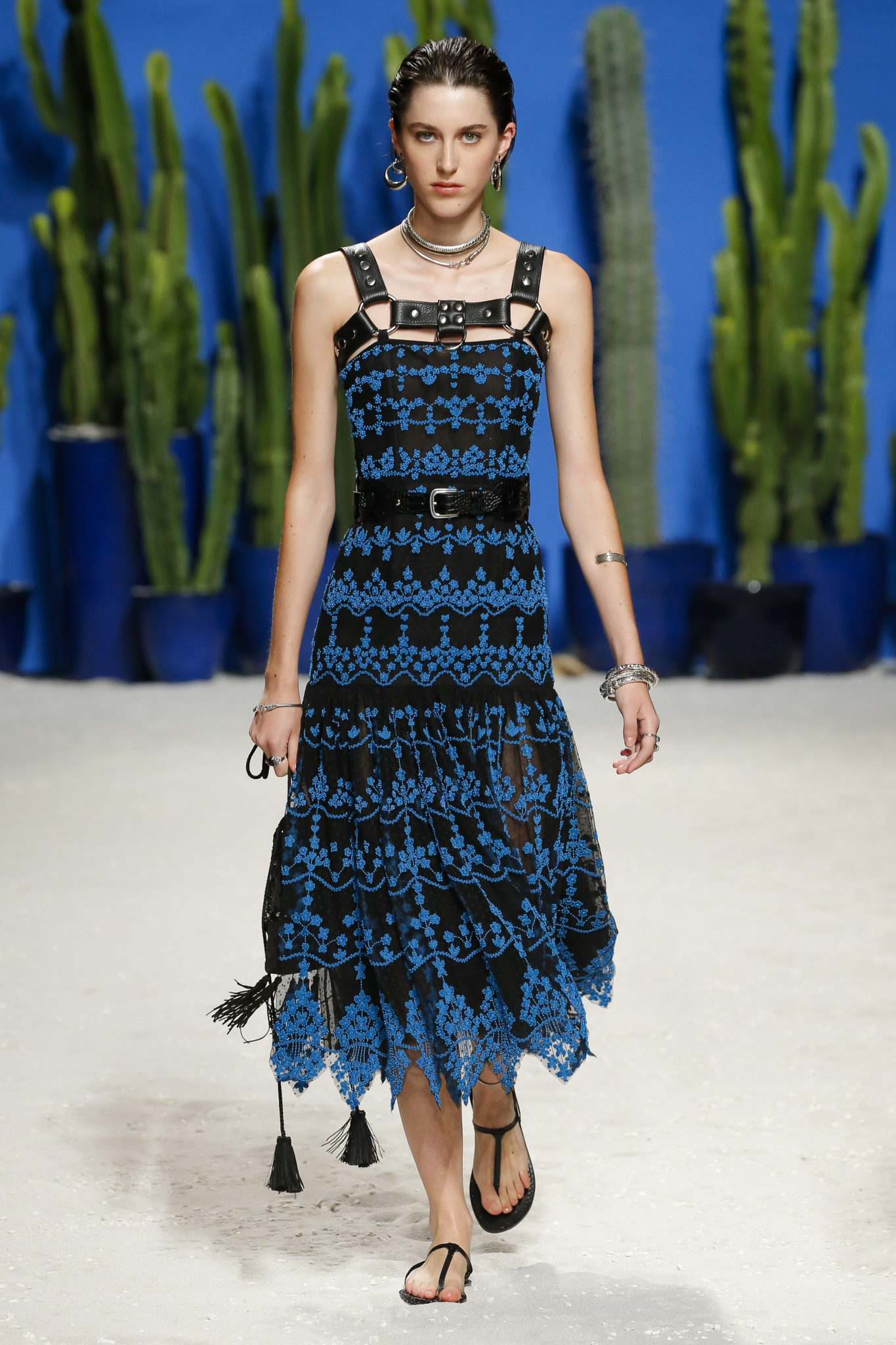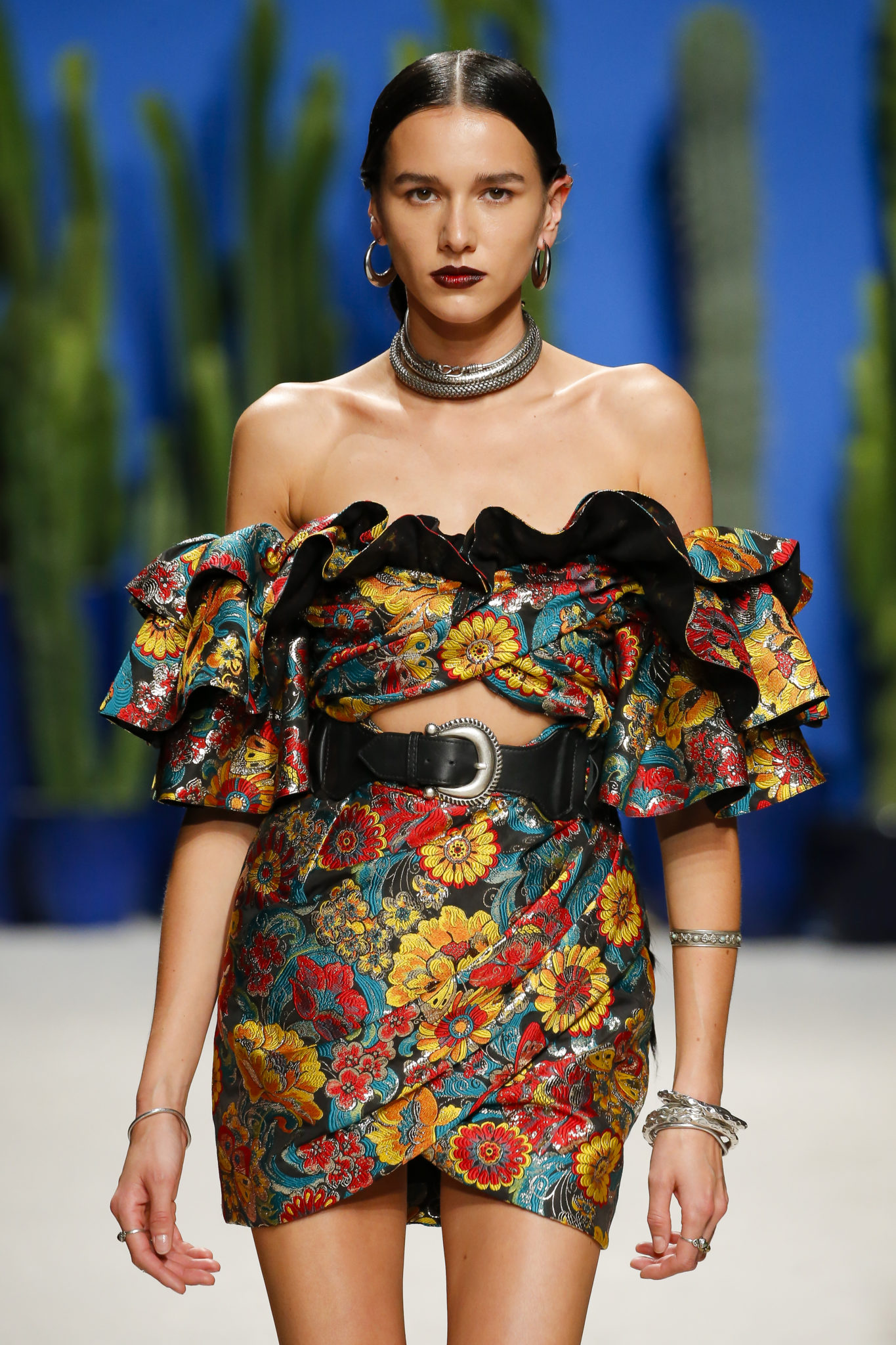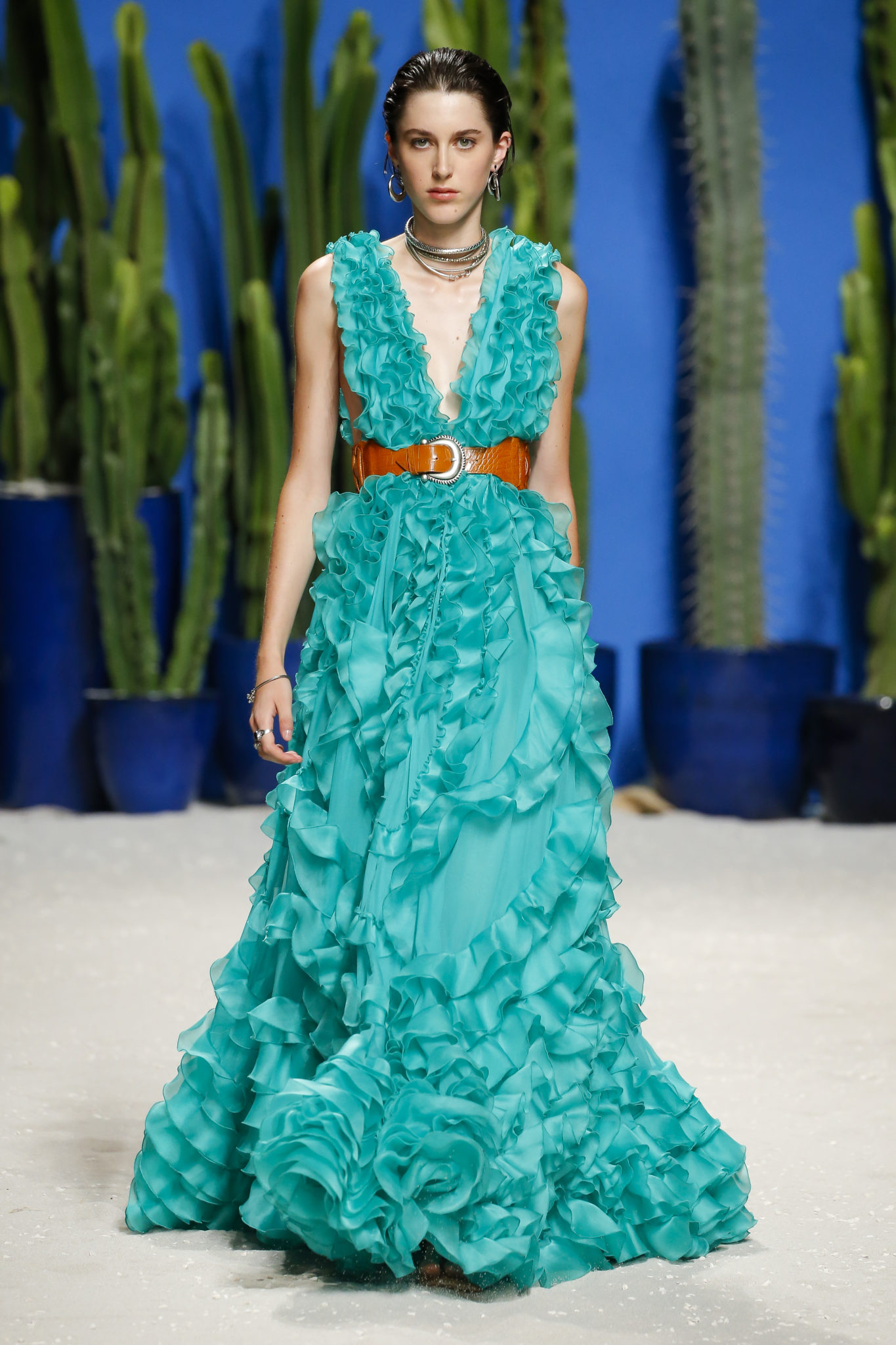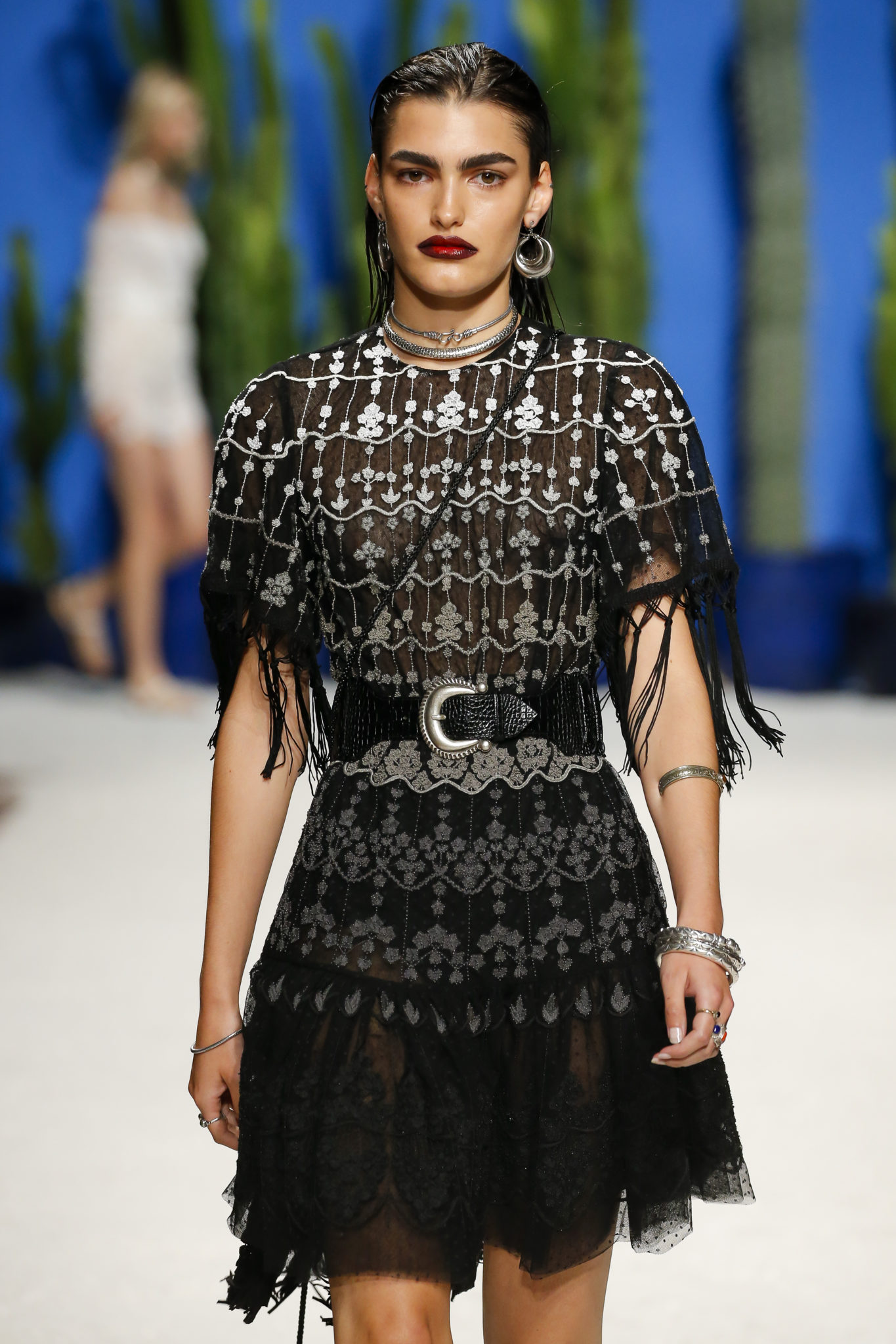 The new collection comprises a plethora of structured bustiers in pleated plumetis and leather harnesses, with a wide-ranging proposal of fluid, long, strapless dresses and imposing skirts adorned with ruffles, ribbons, lace or macramé. An ultra-short boned mini-dress combined with many other structured pieces, shirts with voluminous sleeves, a long jacket cinched at the waist with double seams, a jacket worn over wide-legged pants and a tiered ruffle cape, are all emblematic of the seasonal inspiration.