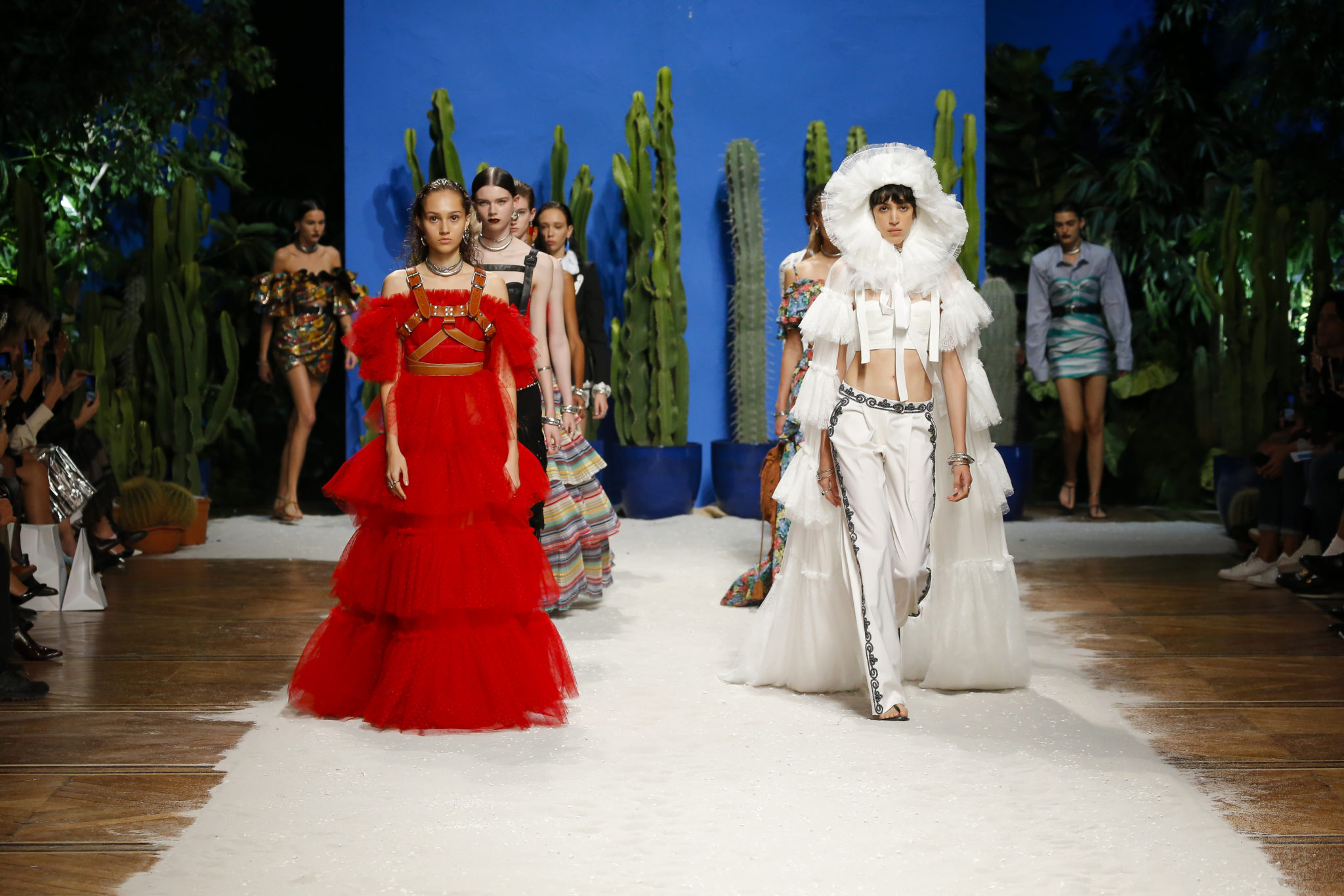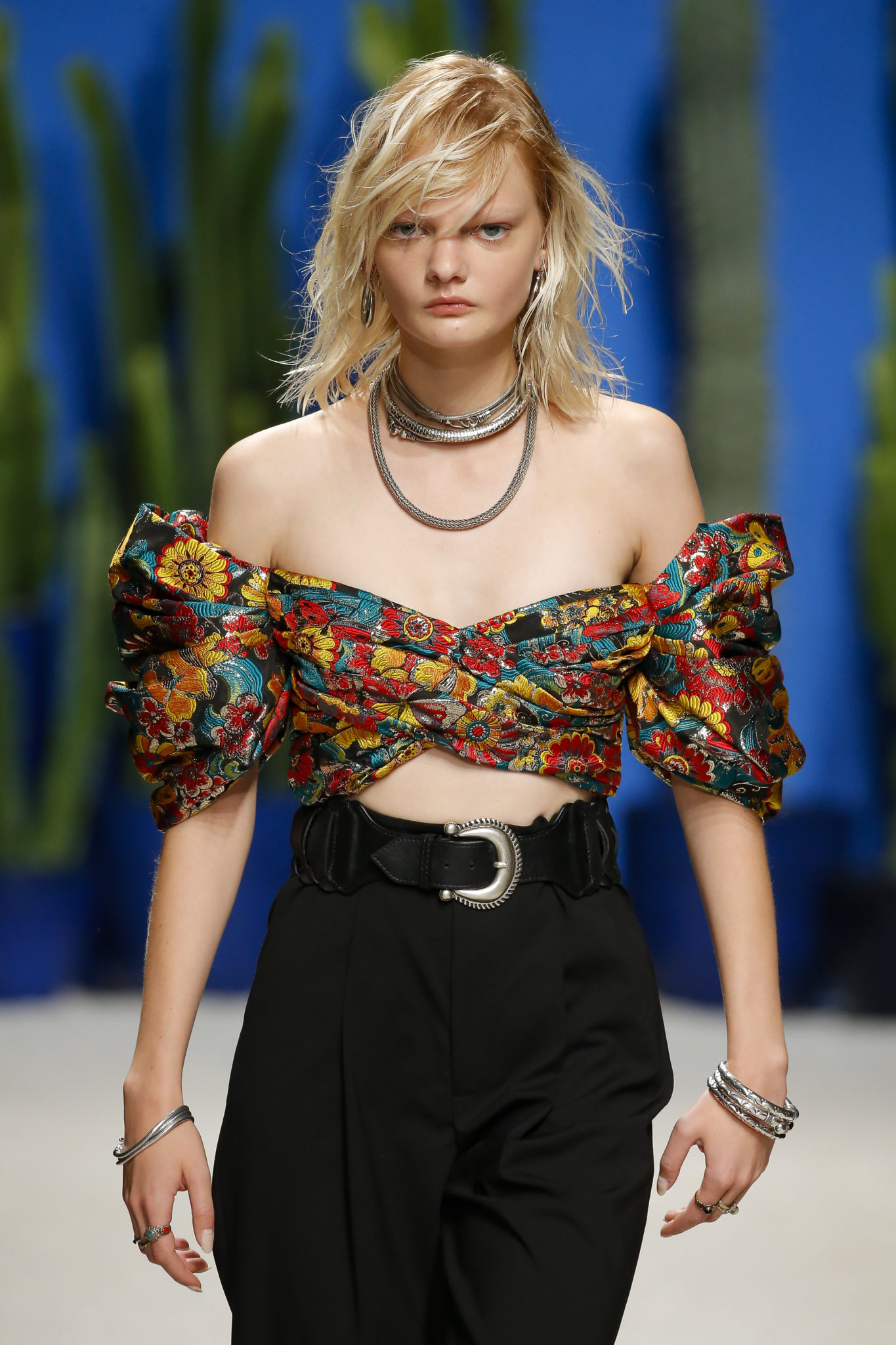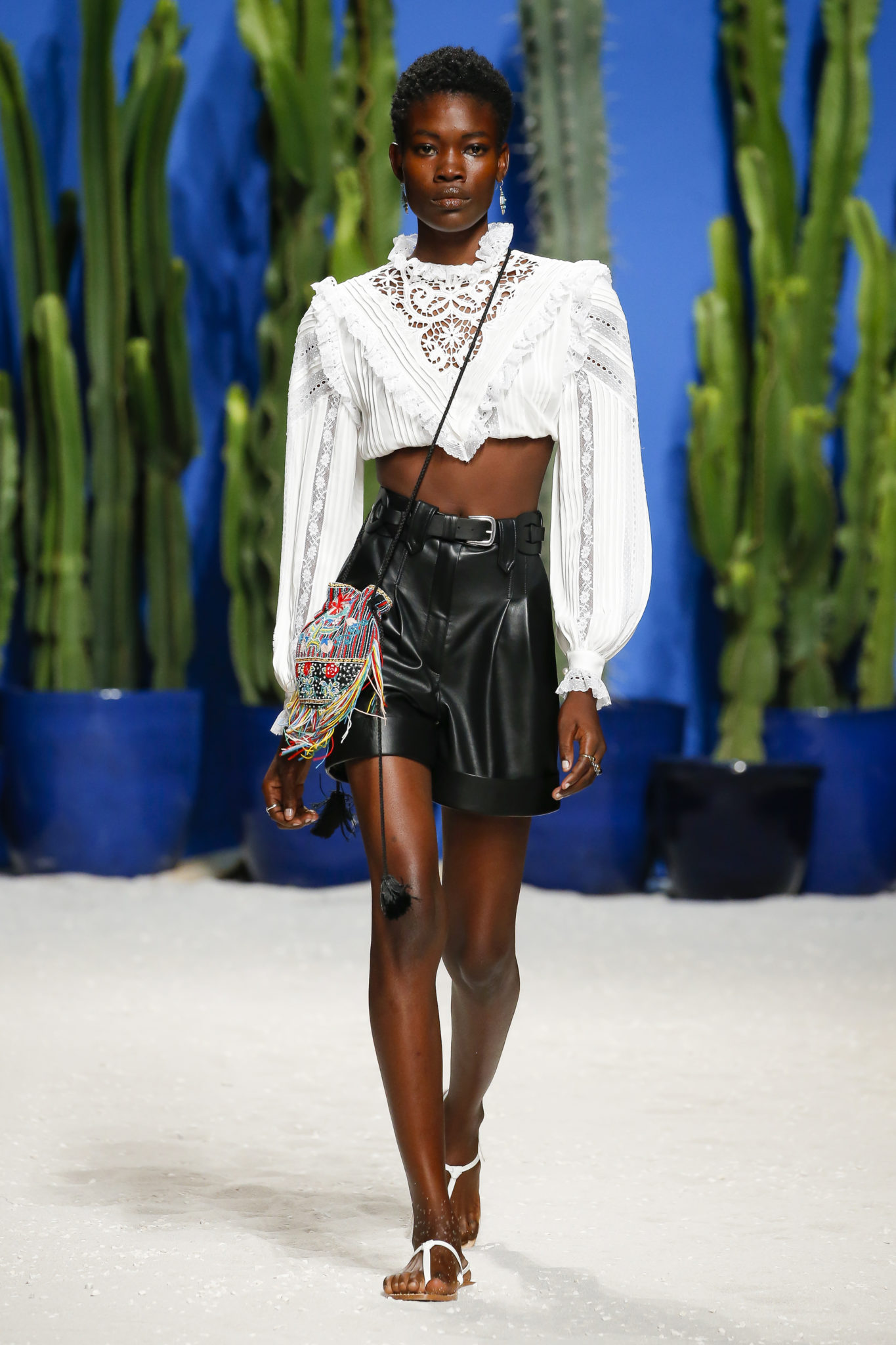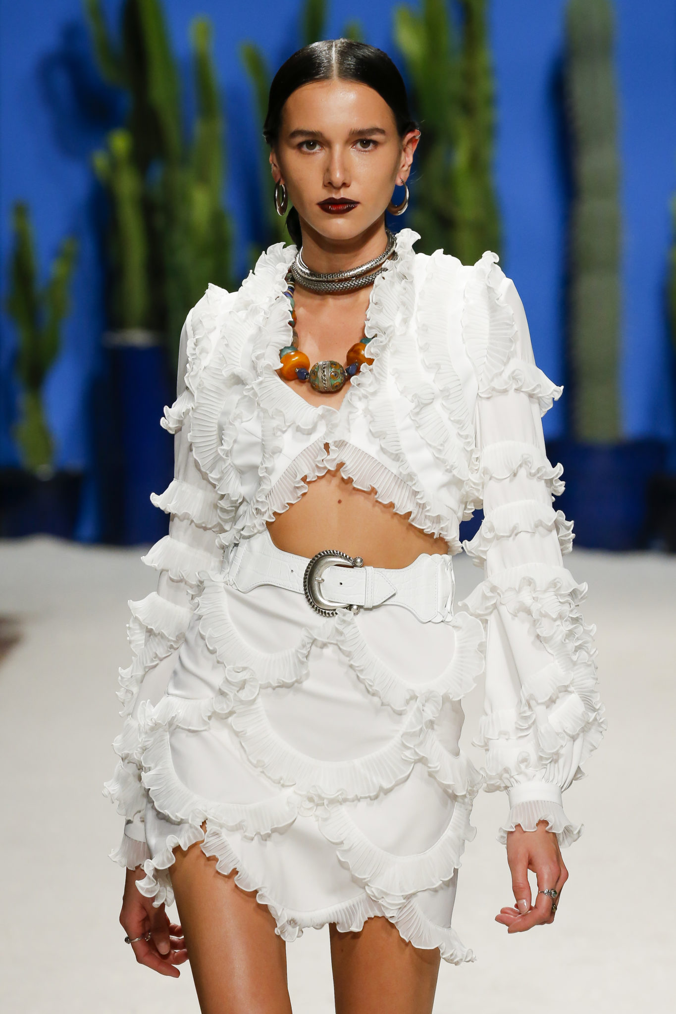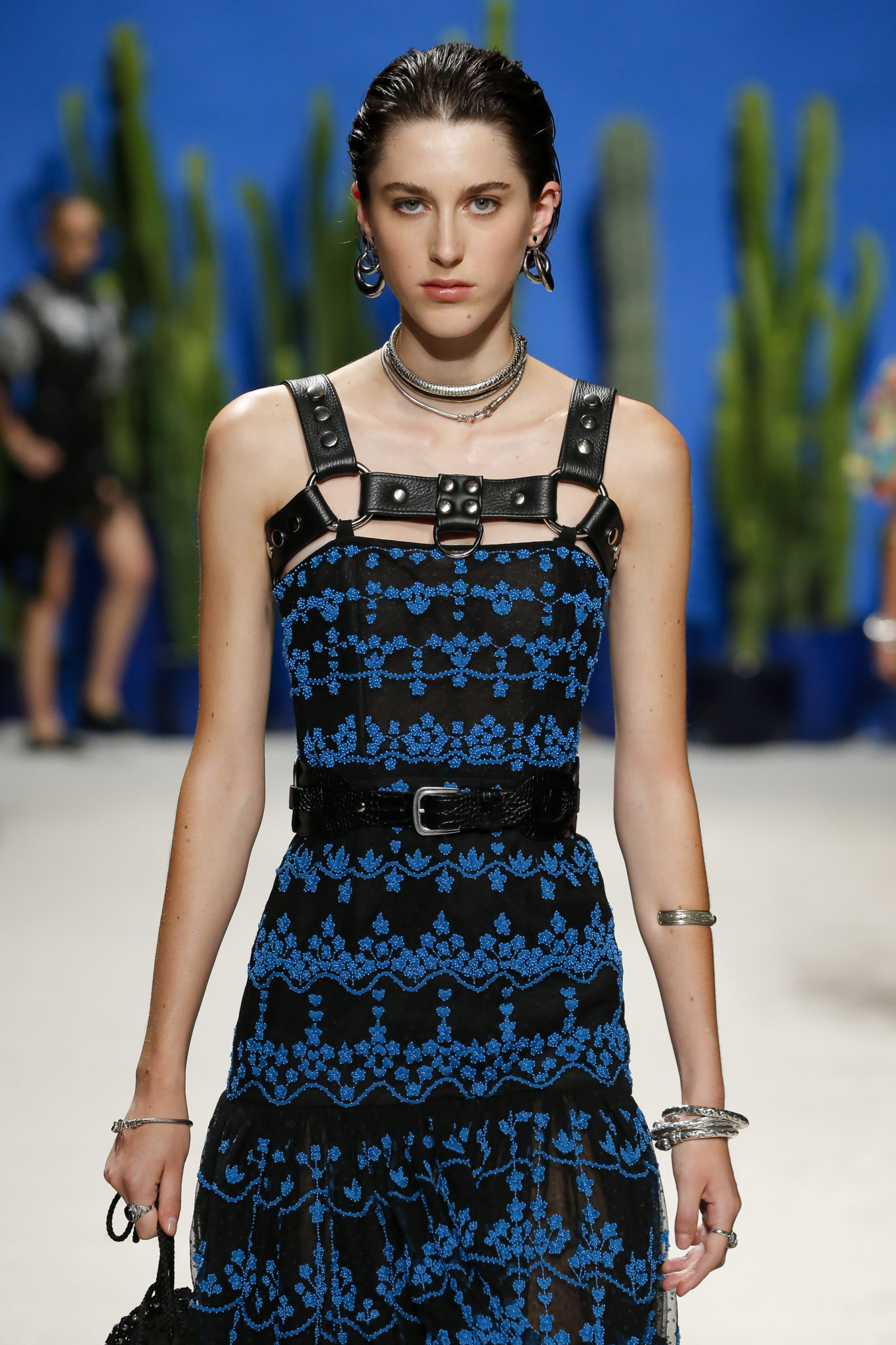 The new collection comprises a plethora of structured bustiers in pleated plumetis and leather harnesses, with a wide-ranging proposal of fluid, long, strapless dresses and imposing skirts adorned with ruffles, ribbons, lace or macramé. An ultra-short boned mini-dress combined with many other structured pieces, shirts with voluminous sleeves, a long jacket cinched at the waist with double seams, a jacket worn over wide-legged pants and a tiered ruffle cape, are all emblematic of the seasonal inspiration.