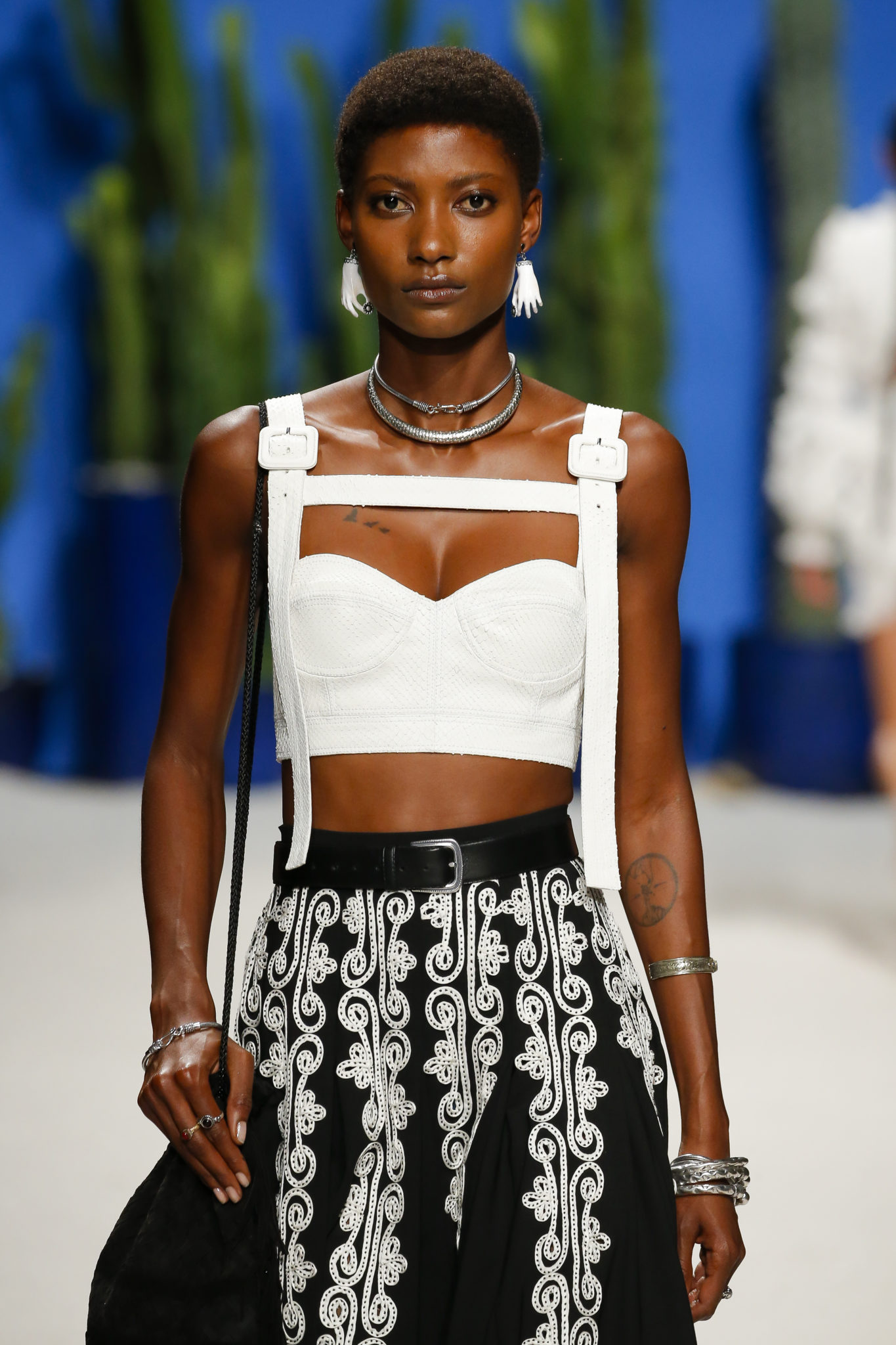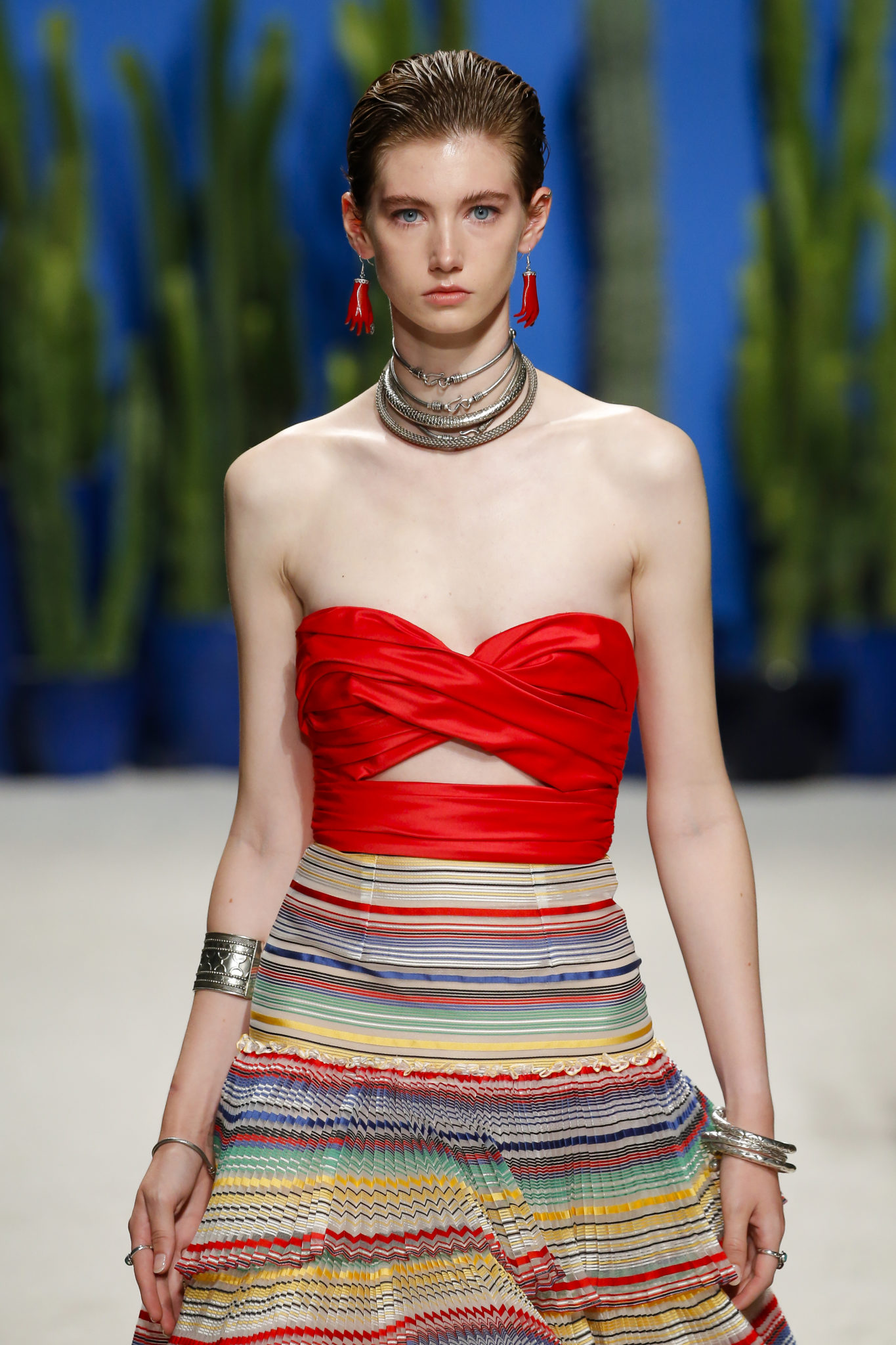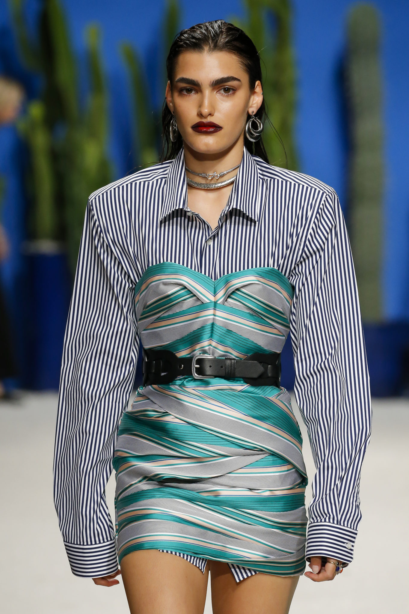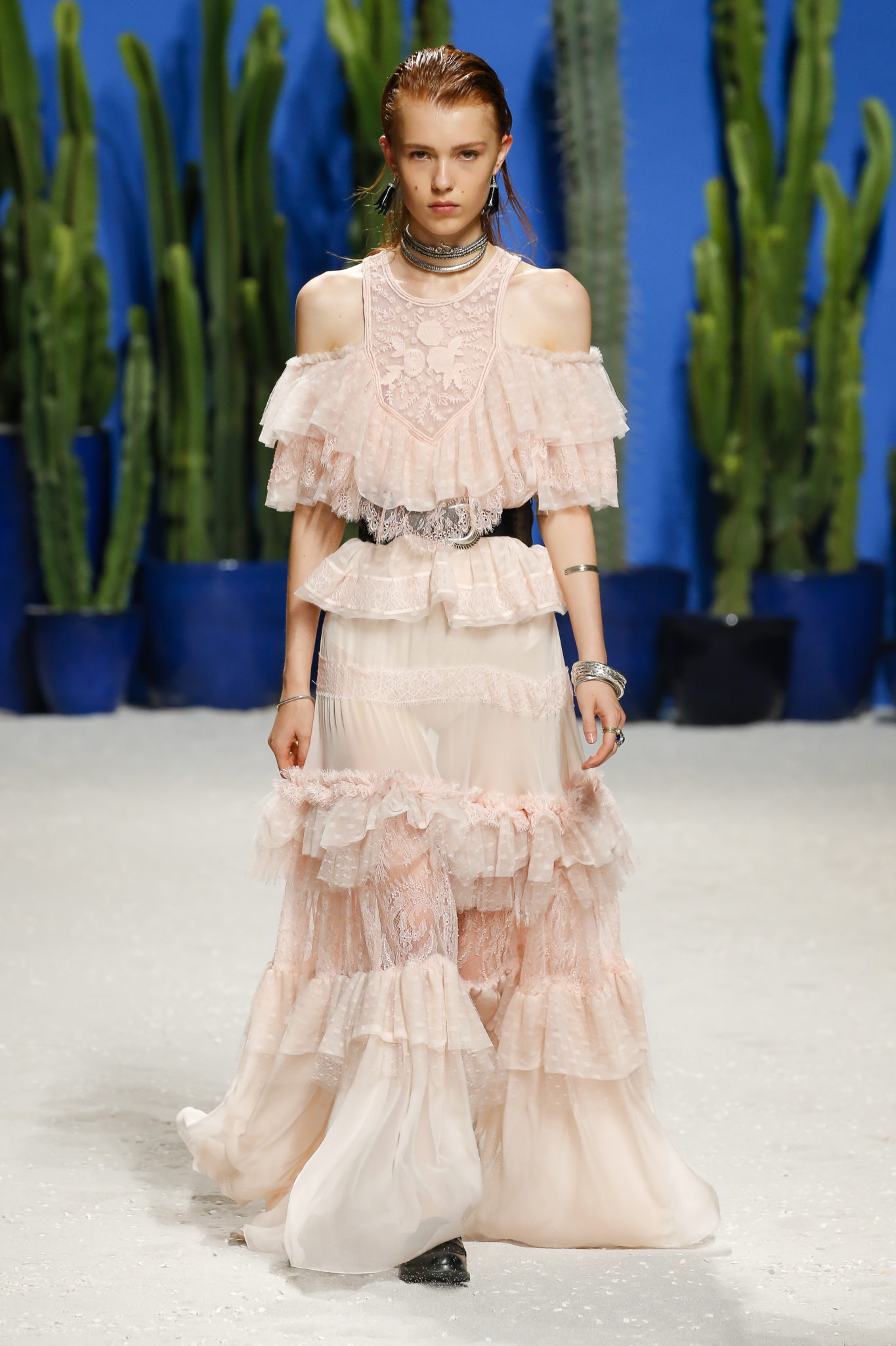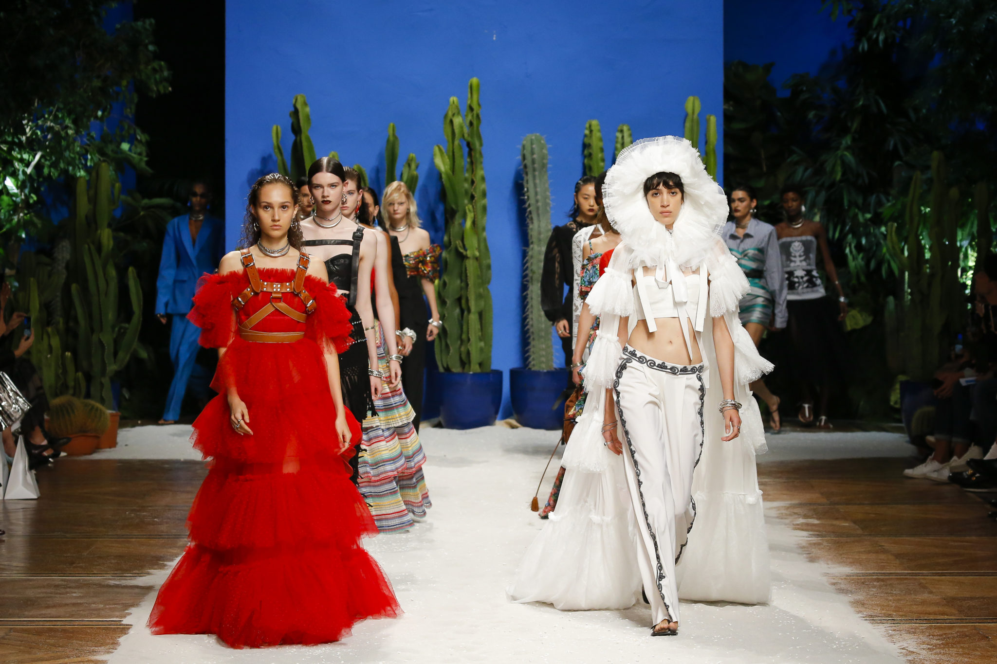 The new collection comprises a plethora of structured bustiers in pleated plumetis and leather harnesses, with a wide-ranging proposal of fluid, long, strapless dresses and imposing skirts adorned with ruffles, ribbons, lace or macramé. An ultra-short boned mini-dress combined with many other structured pieces, shirts with voluminous sleeves, a long jacket cinched at the waist with double seams, a jacket worn over wide-legged pants and a tiered ruffle cape, are all emblematic of the seasonal inspiration.