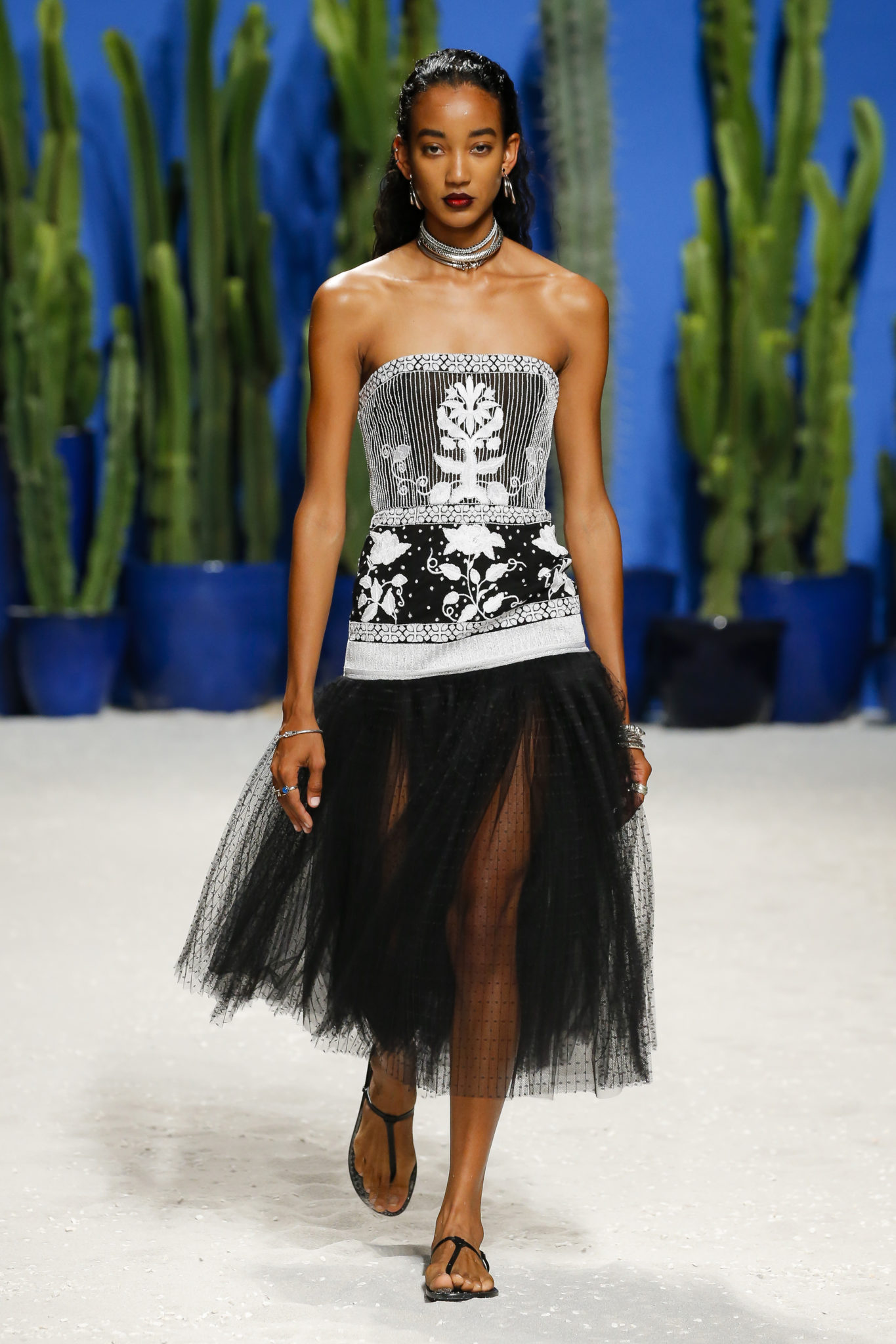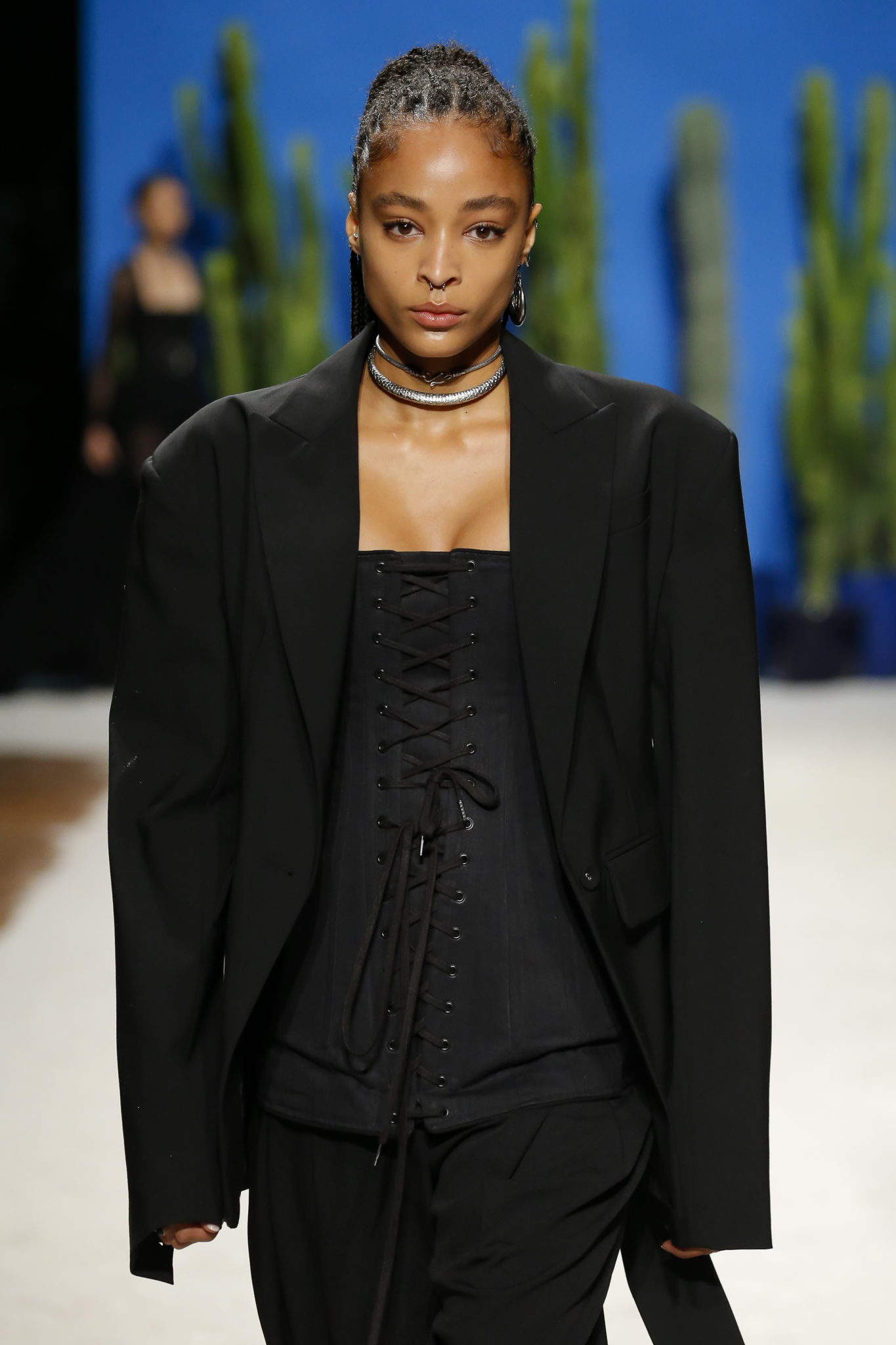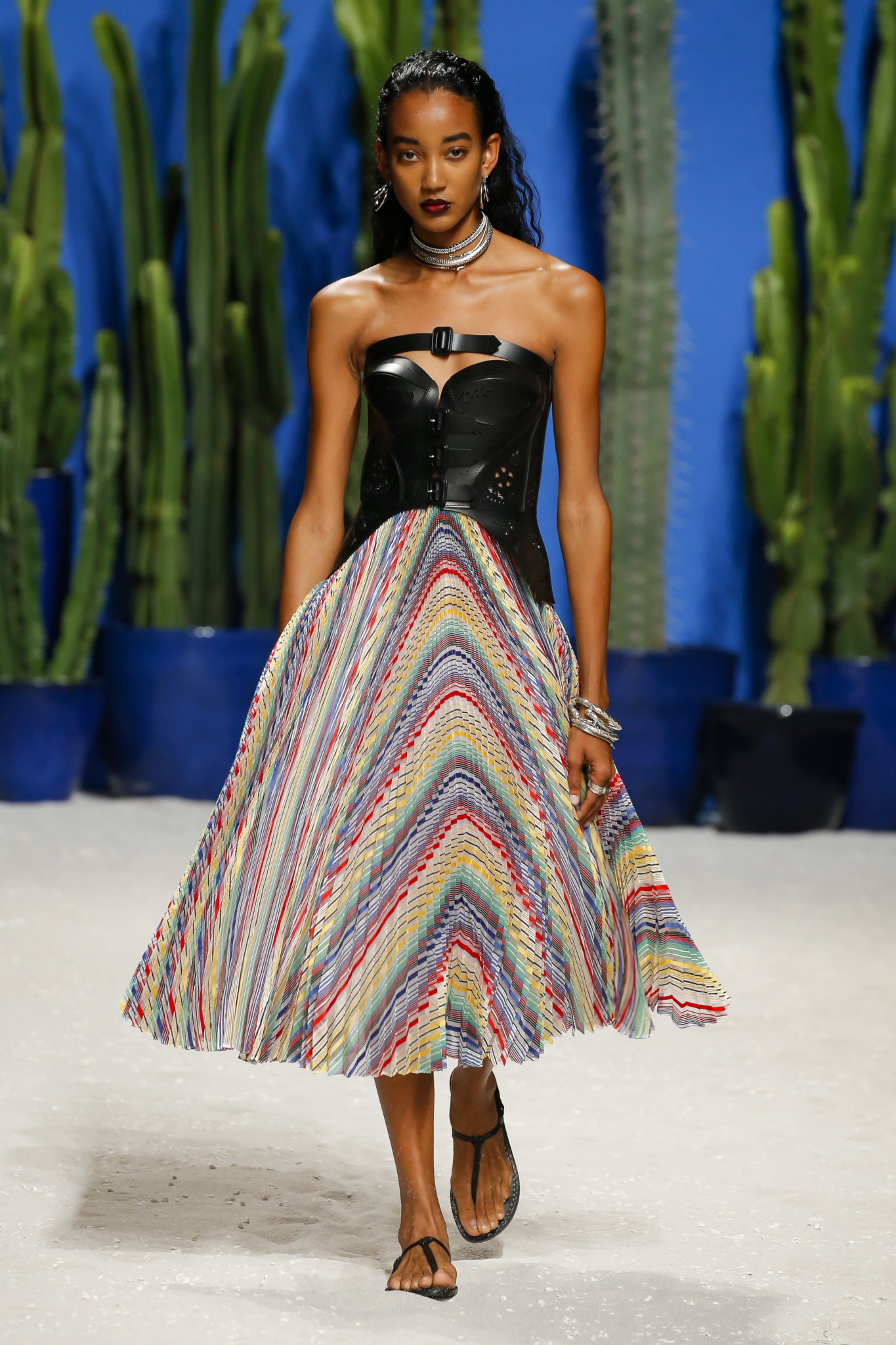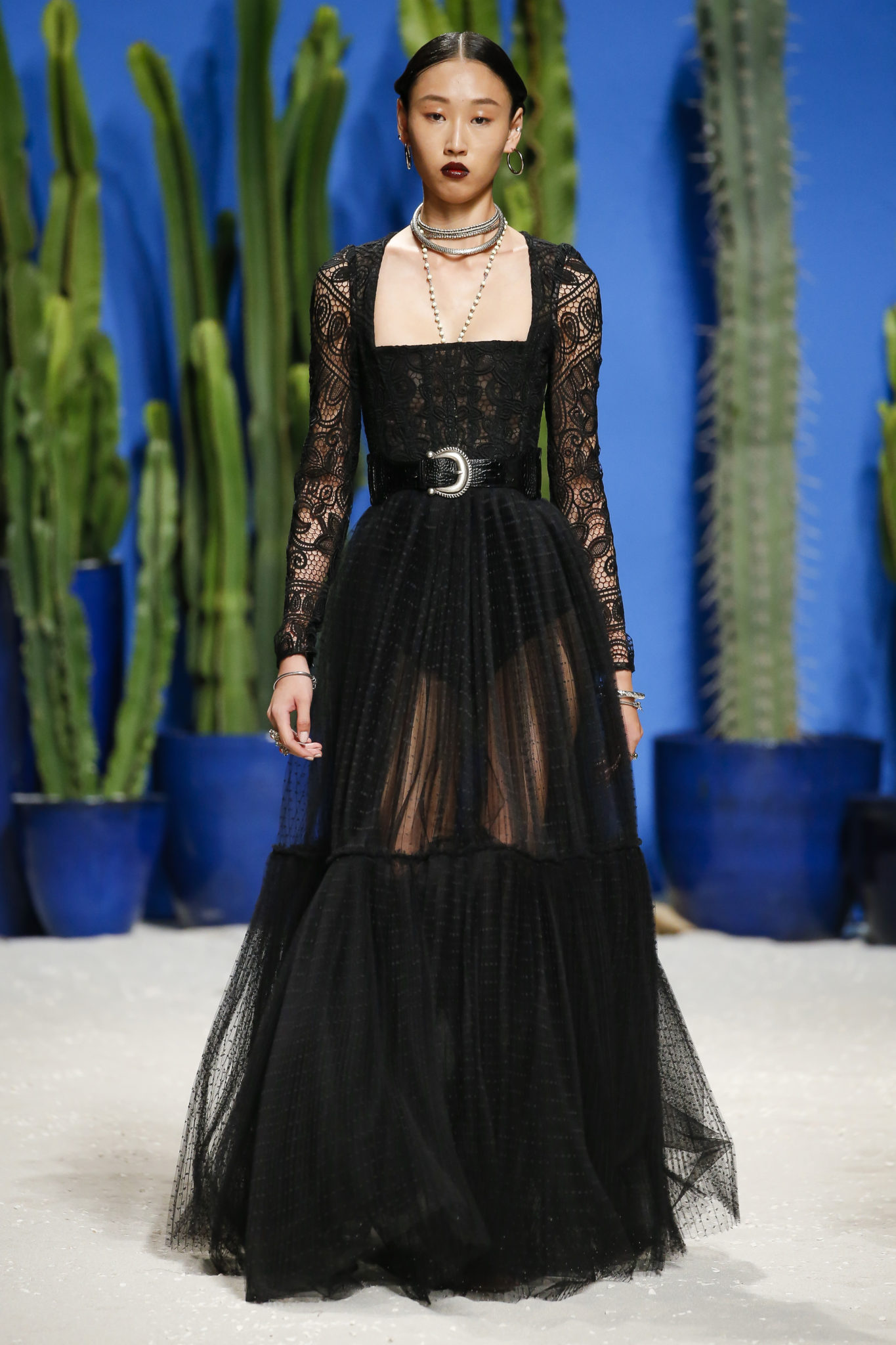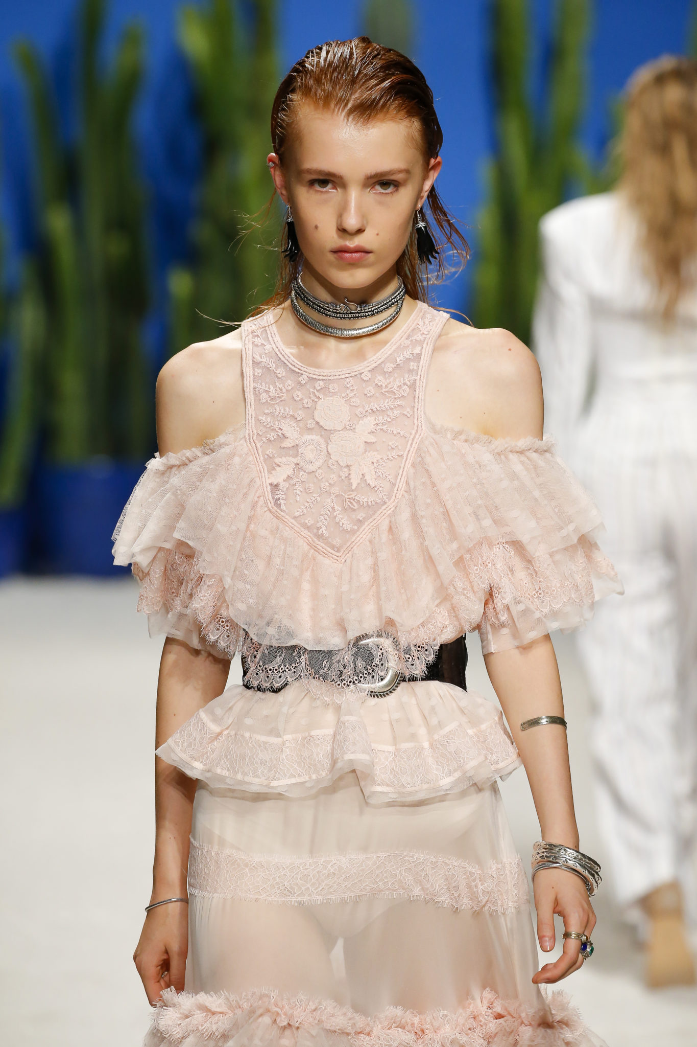 The new collection comprises a plethora of structured bustiers in pleated plumetis and leather harnesses, with a wide-ranging proposal of fluid, long, strapless dresses and imposing skirts adorned with ruffles, ribbons, lace or macramé. An ultra-short boned mini-dress combined with many other structured pieces, shirts with voluminous sleeves, a long jacket cinched at the waist with double seams, a jacket worn over wide-legged pants and a tiered ruffle cape, are all emblematic of the seasonal inspiration.
