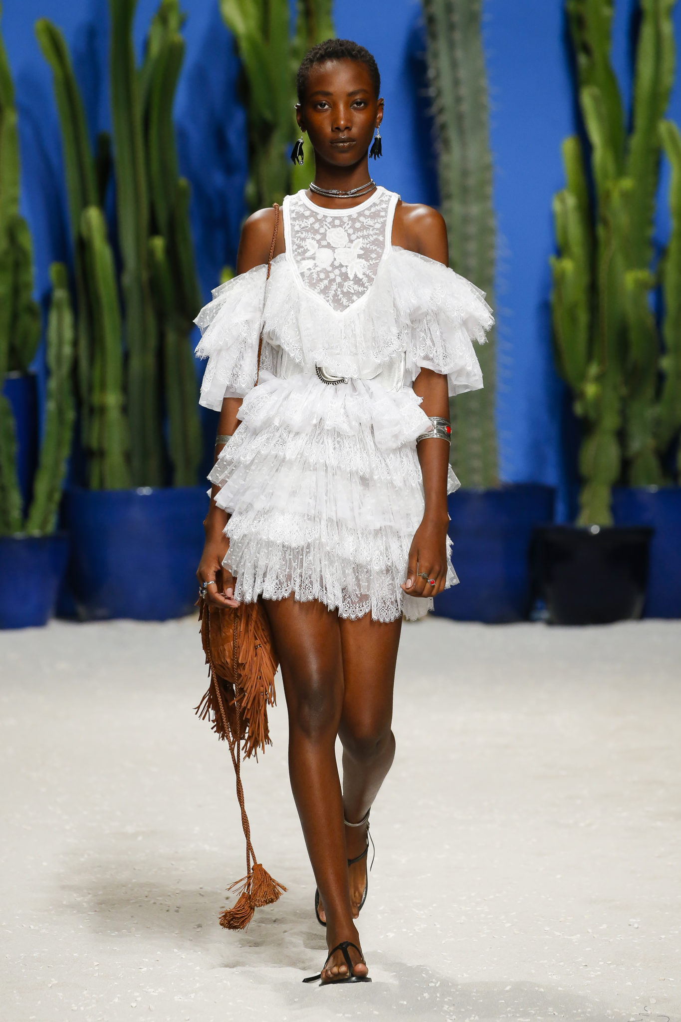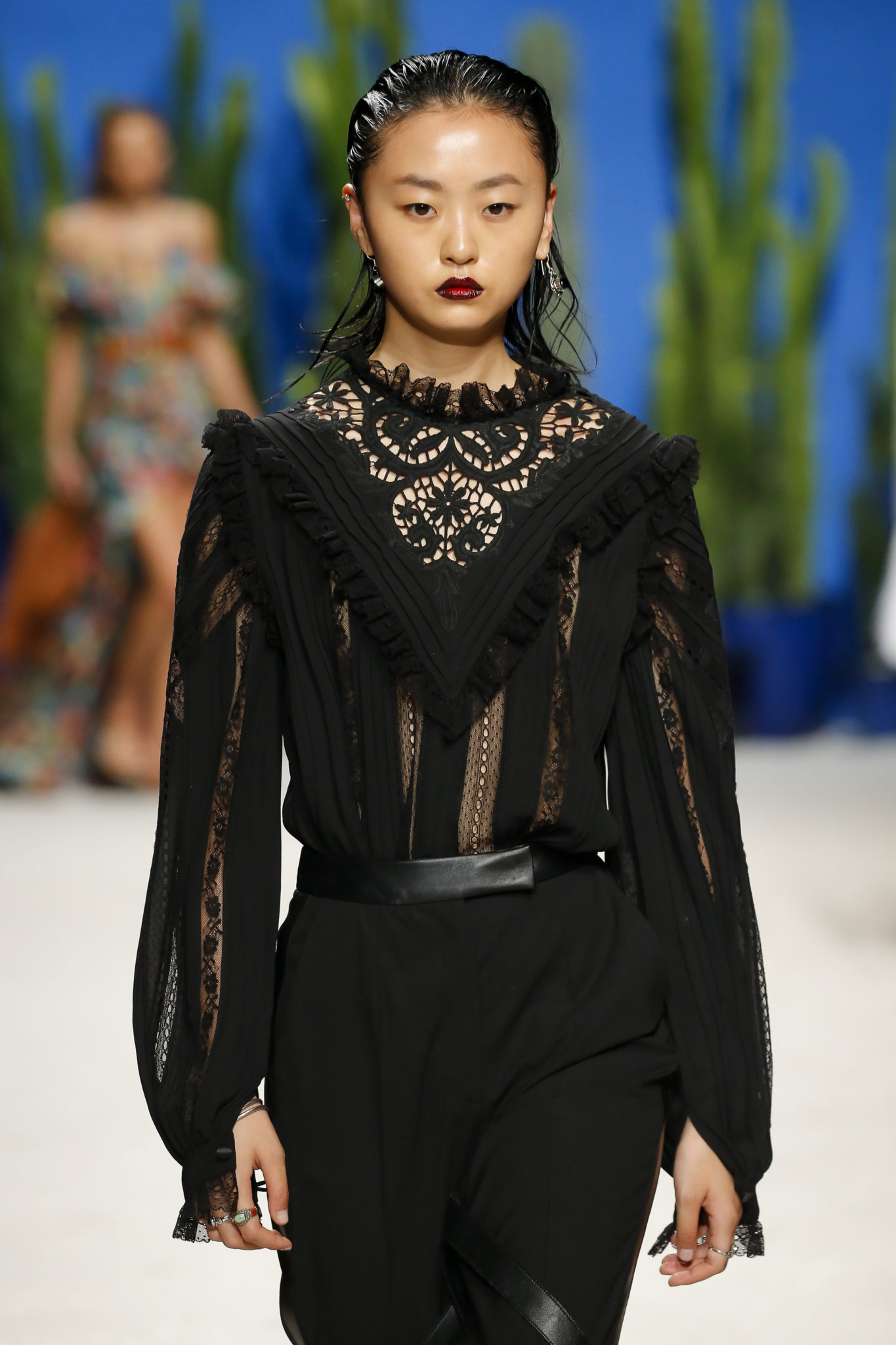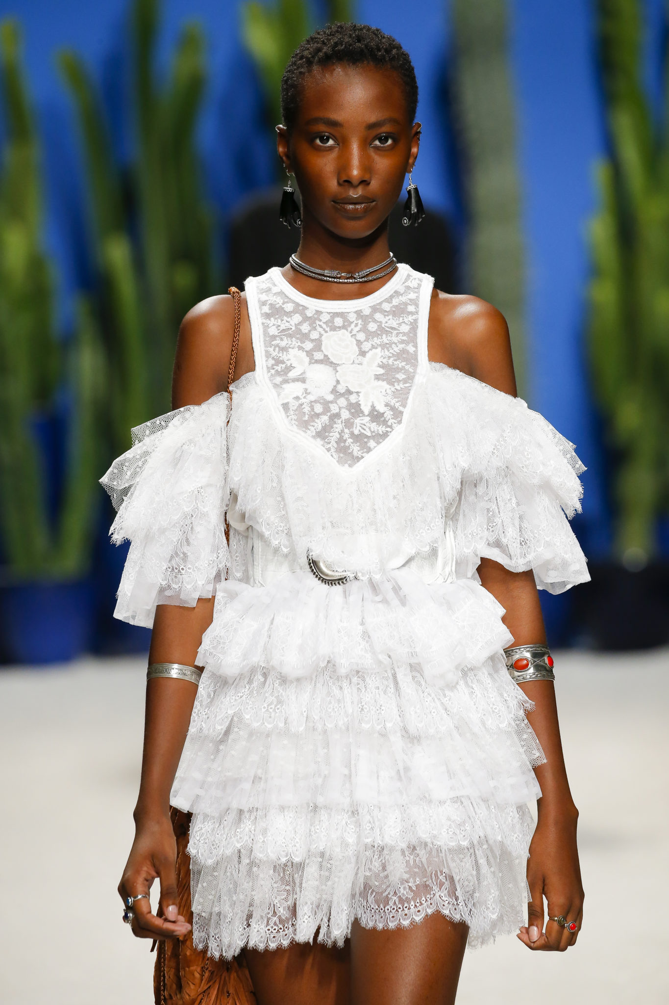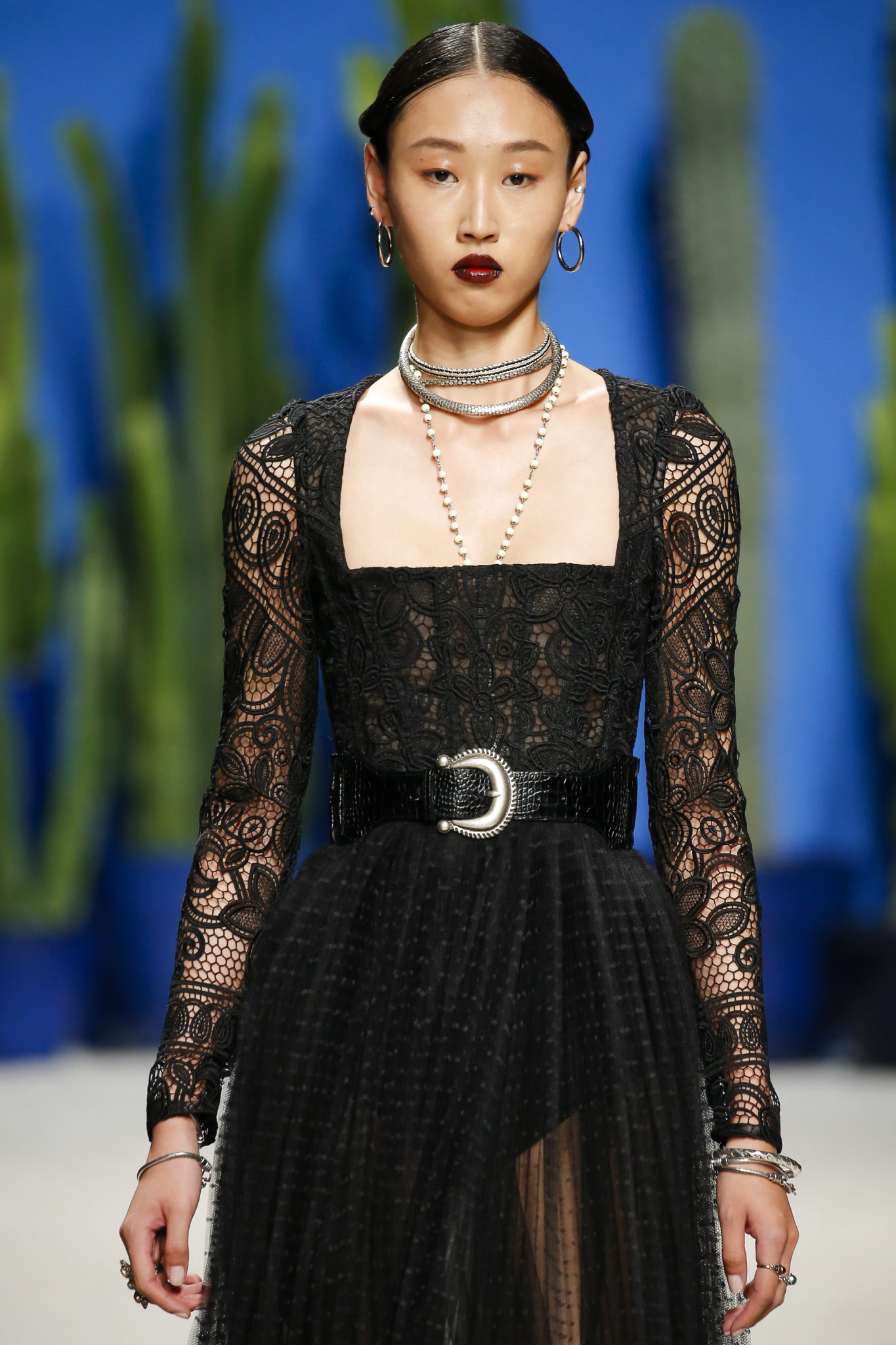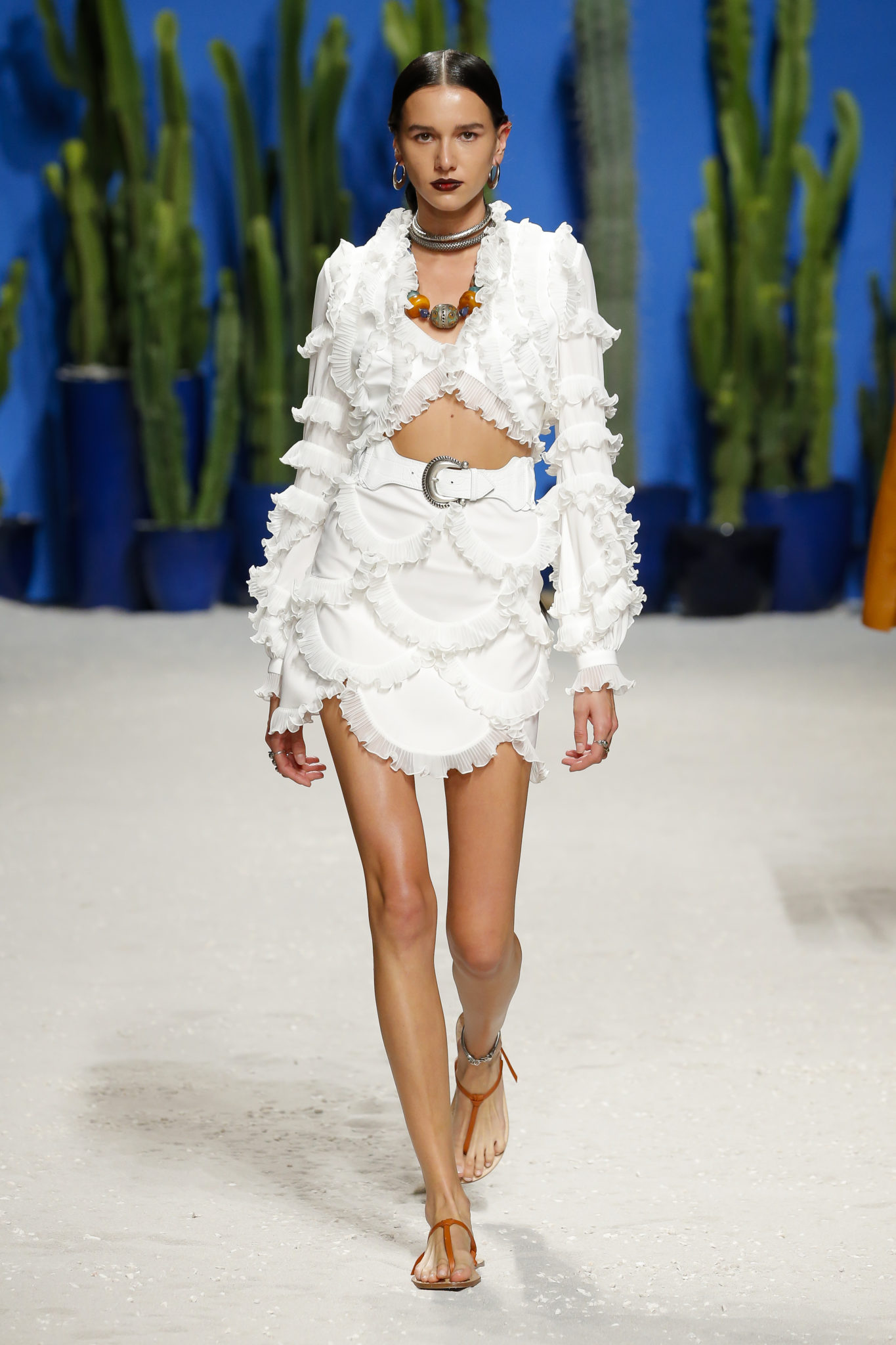The new collection comprises a plethora of structured bustiers in pleated plumetis and leather harnesses, with a wide-ranging proposal of fluid, long, strapless dresses and imposing skirts adorned with ruffles, ribbons, lace or macramé. An ultra-short boned mini-dress combined with many other structured pieces, shirts with voluminous sleeves, a long jacket cinched at the waist with double seams, a jacket worn over wide-legged pants and a tiered ruffle cape, are all emblematic of the seasonal inspiration.