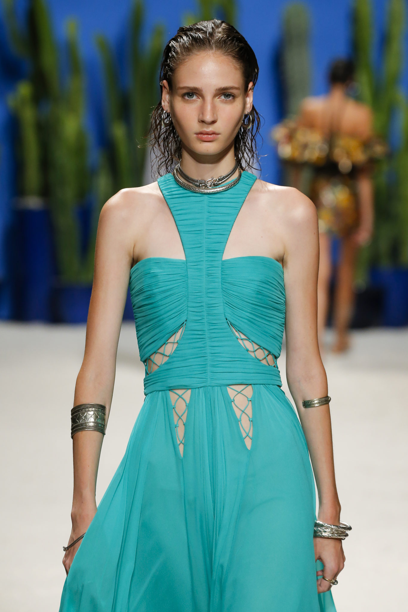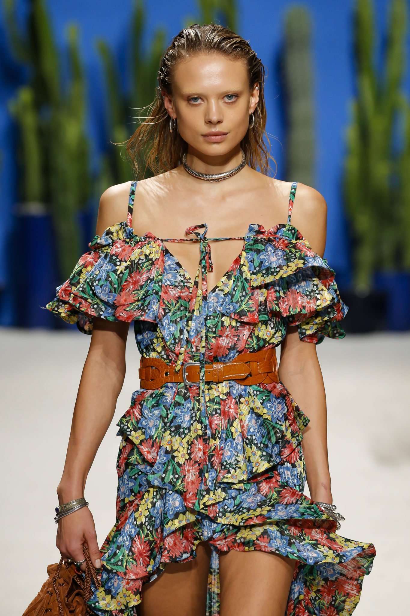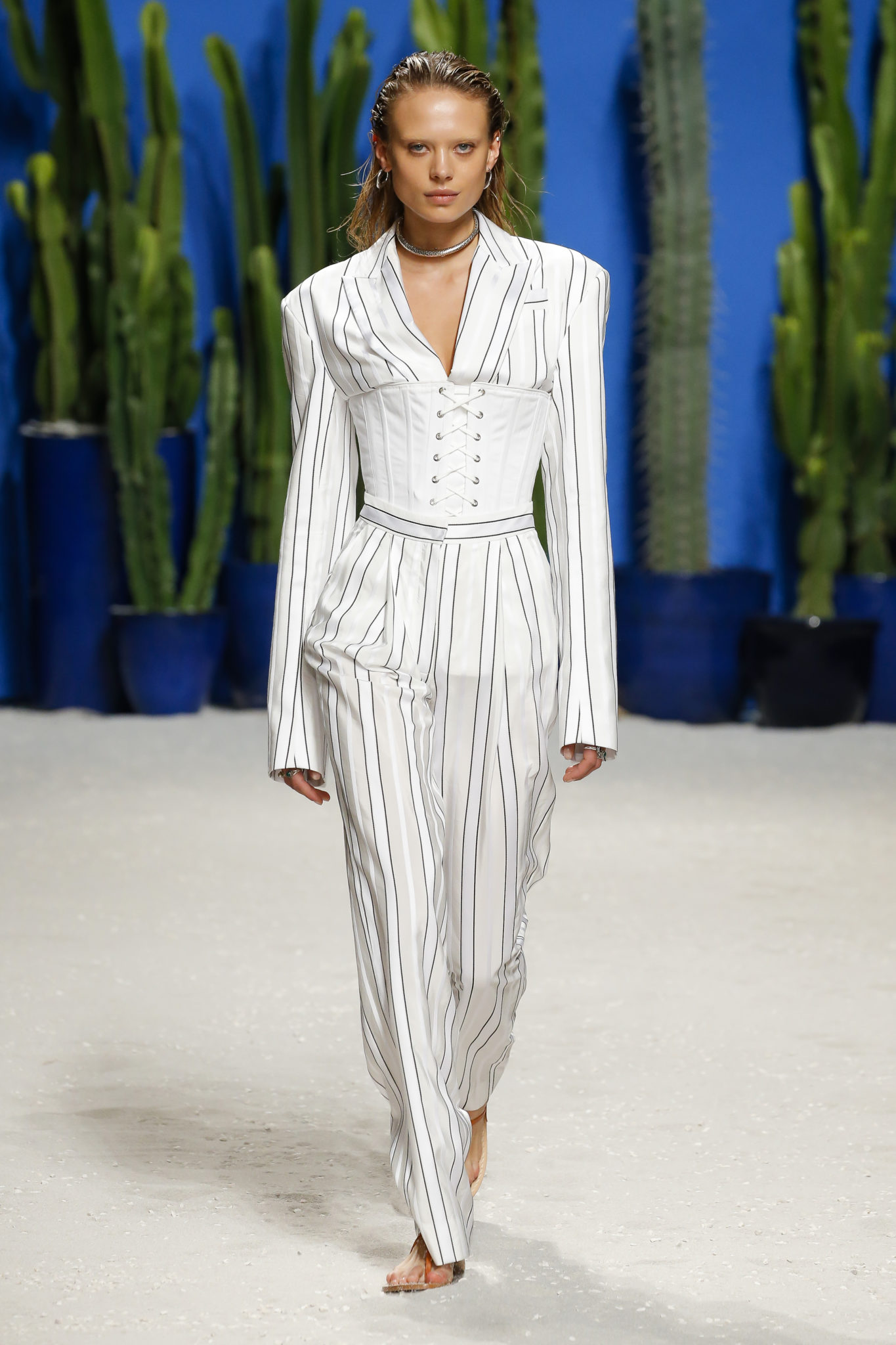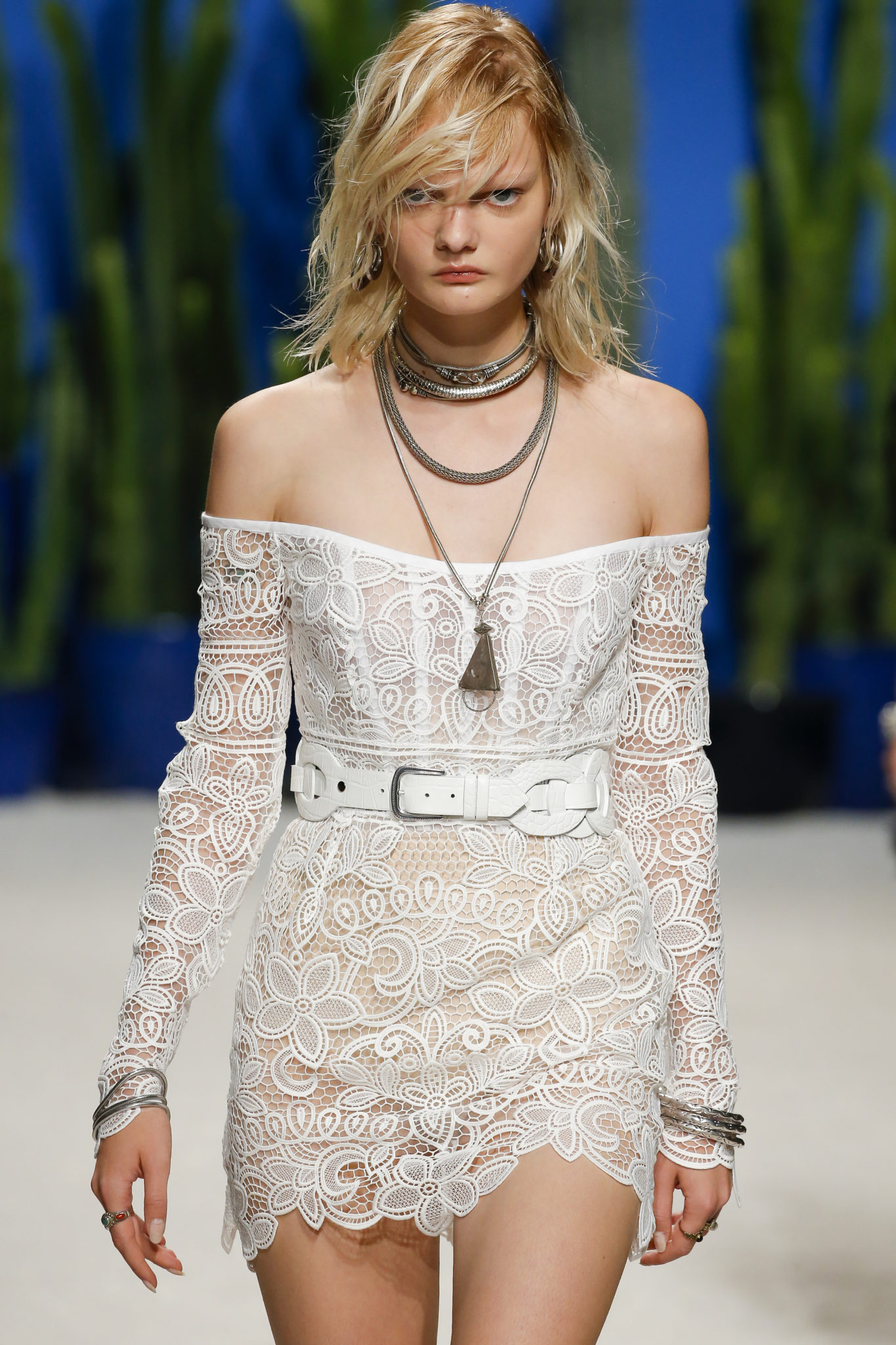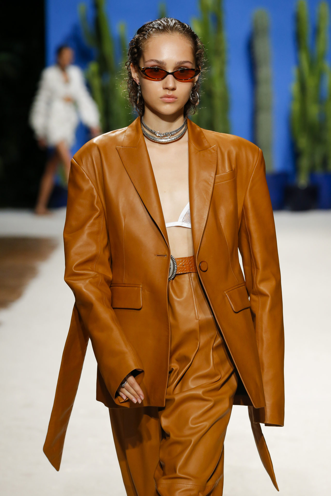 The new collection comprises a plethora of structured bustiers in pleated plumetis and leather harnesses, with a wide-ranging proposal of fluid, long, strapless dresses and imposing skirts adorned with ruffles, ribbons, lace or macramé. An ultra-short boned mini-dress combined with many other structured pieces, shirts with voluminous sleeves, a long jacket cinched at the waist with double seams, a jacket worn over wide-legged pants and a tiered ruffle cape, are all emblematic of the seasonal inspiration.