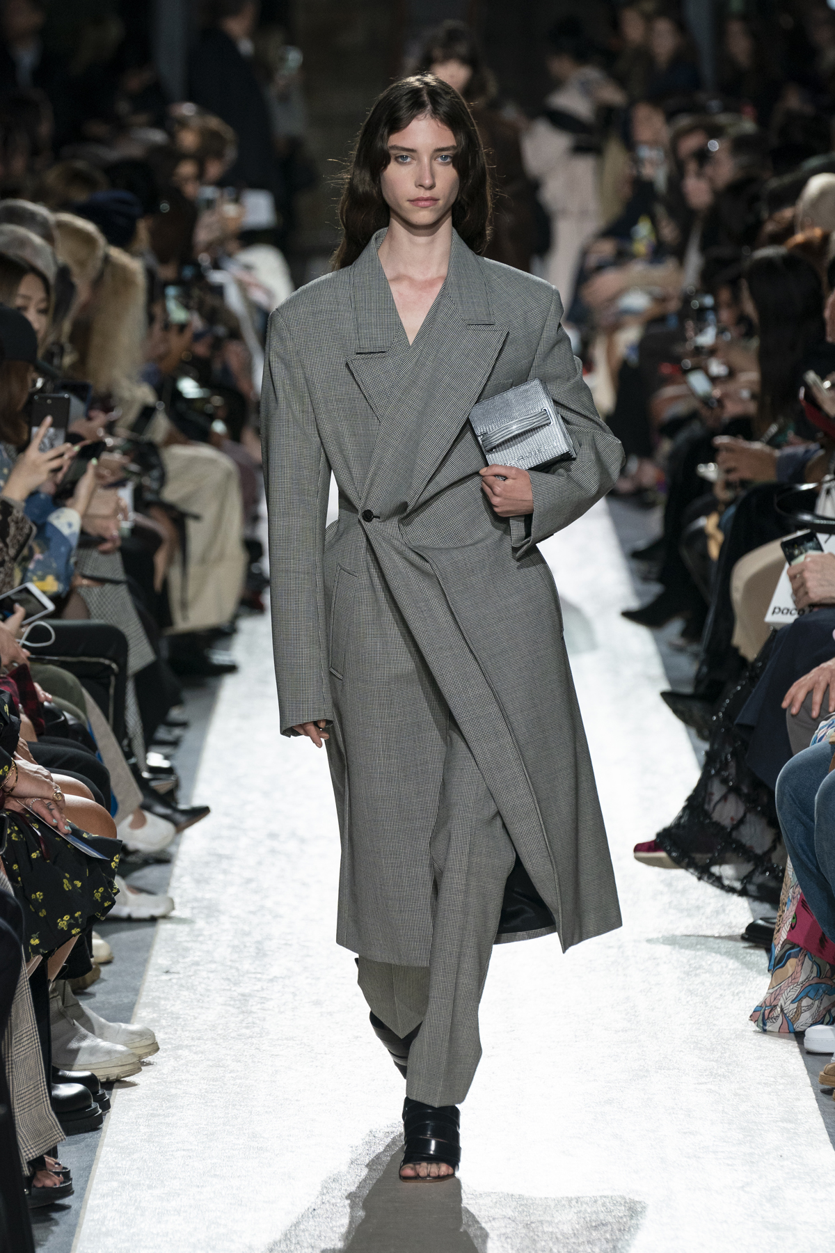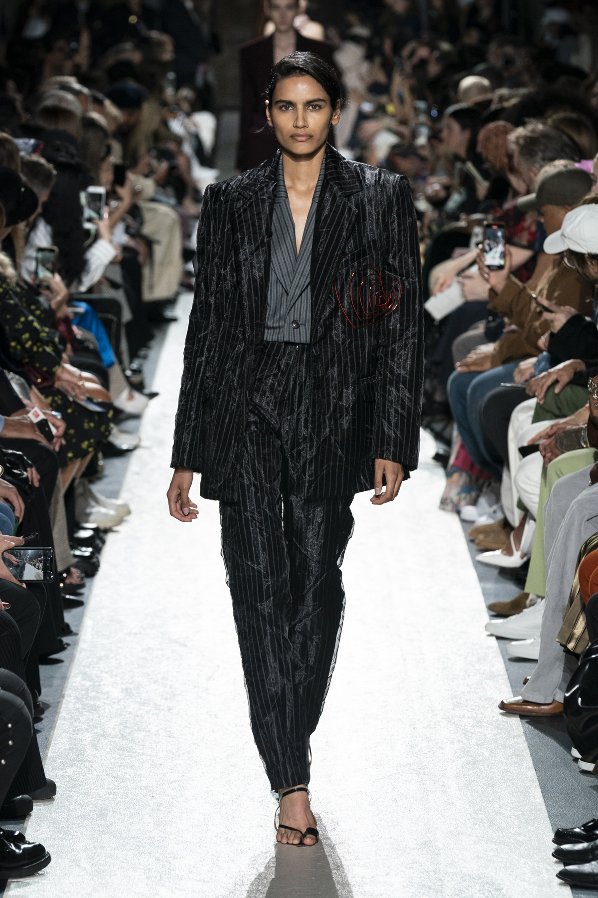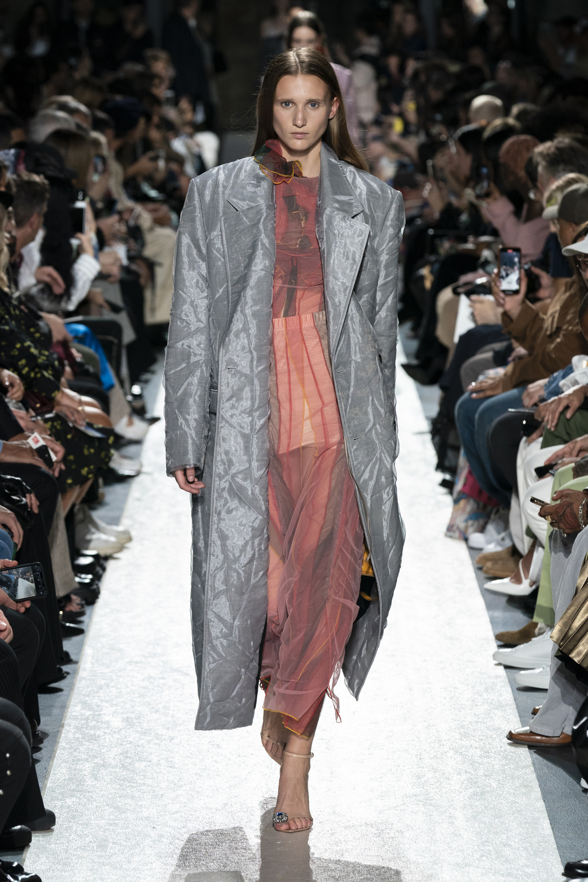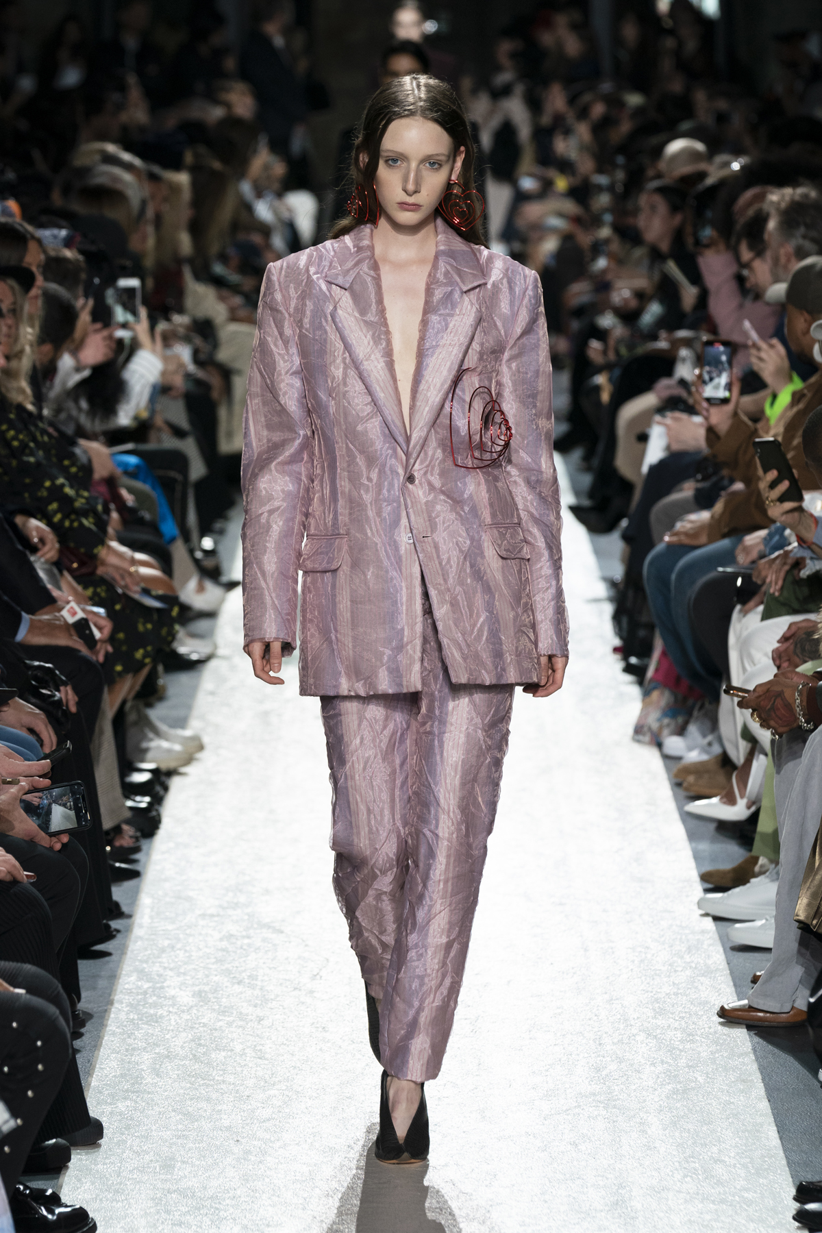 La dentelle est défaite de sa connotation romantique et devient l’objet d’expérimentations textiles. Le tailleur est également un des scénarios centraux de la collection : des veste spencer aux robe-blazers pop-up, des costumes à rayures tennis et recouverts de tulle aux manteaux ajustés à la boutonnière déformée.