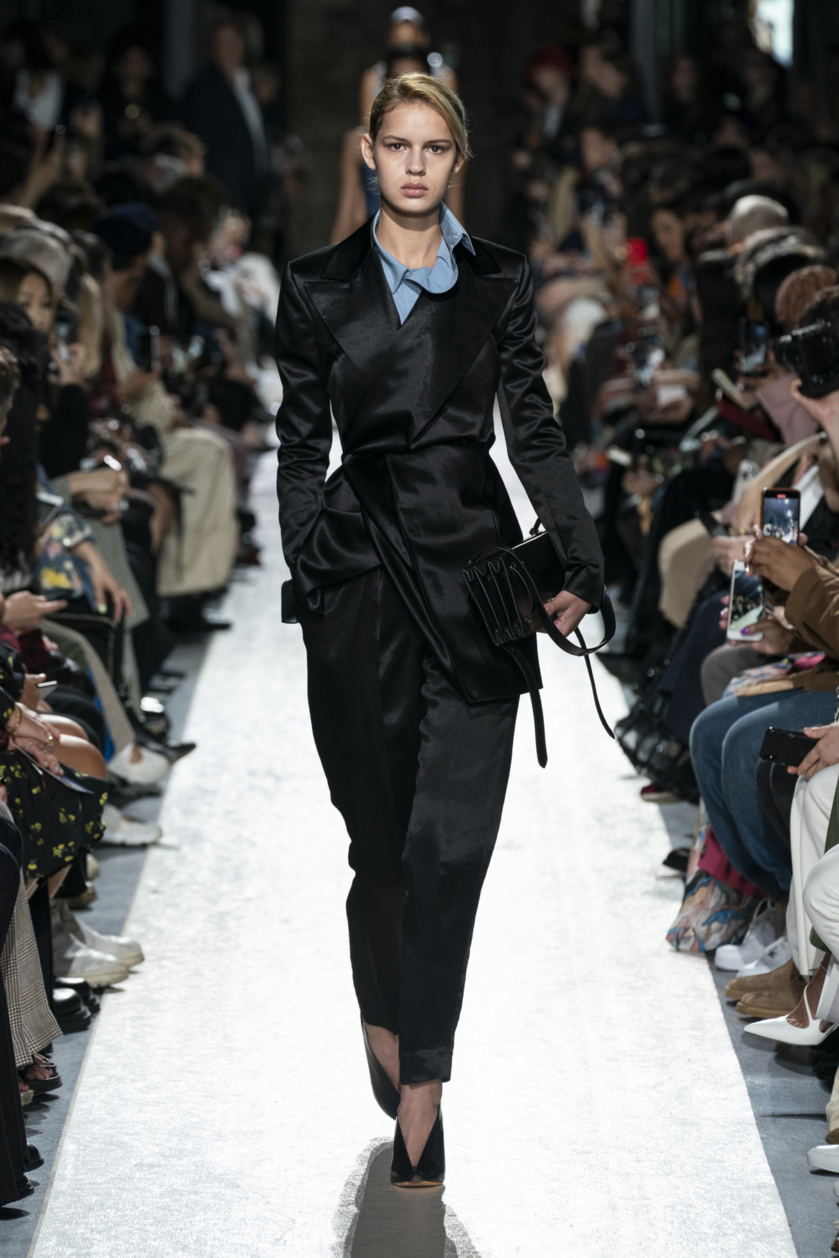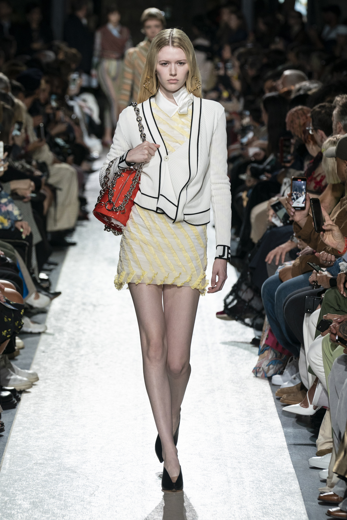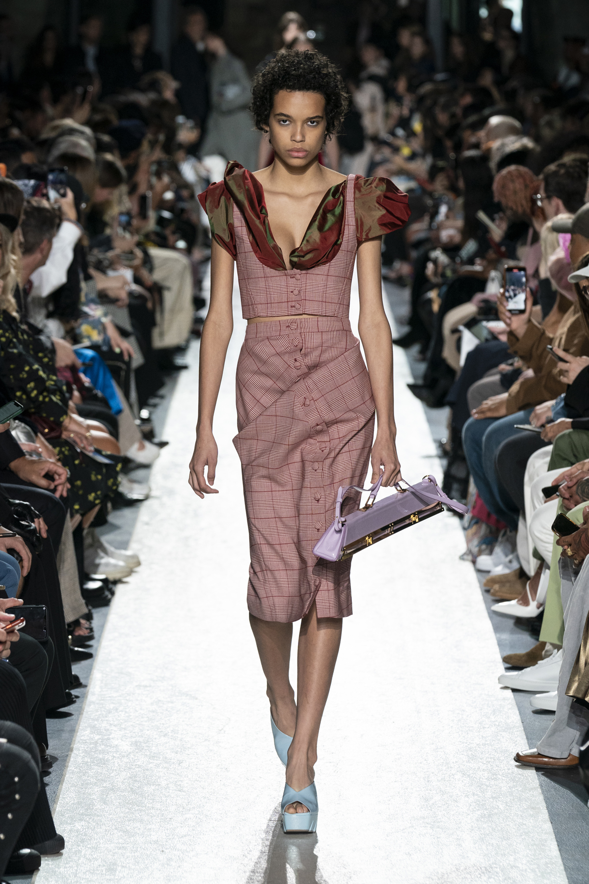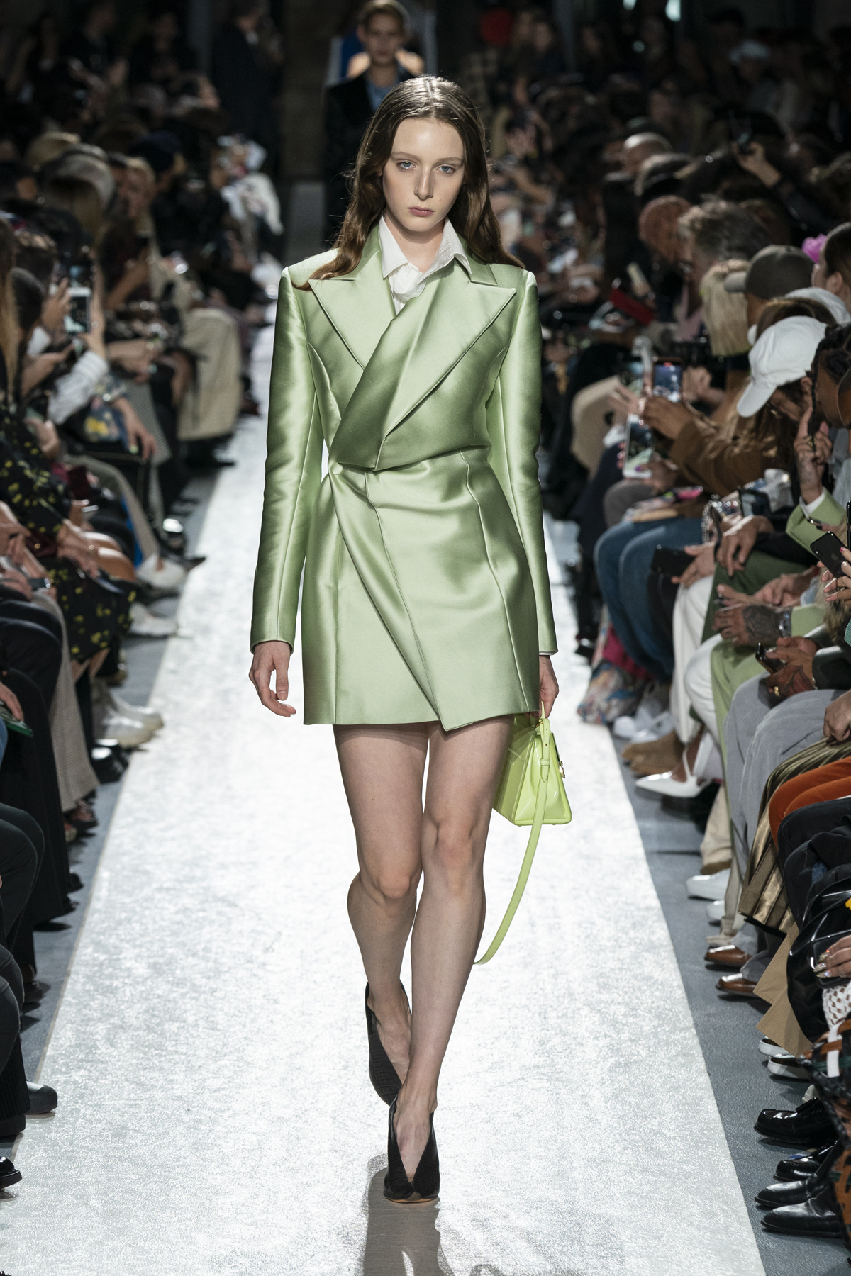 La dentelle est défaite de sa connotation romantique et devient l’objet d’expérimentations textiles. Le tailleur est également un des scénarios centraux de la collection : des veste spencer aux robe-blazers pop-up, des costumes à rayures tennis et recouverts de tulle aux manteaux ajustés à la boutonnière déformée.