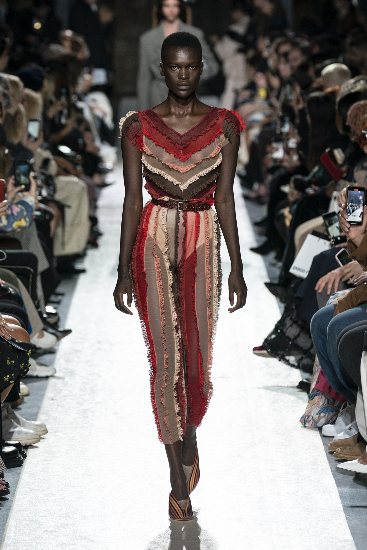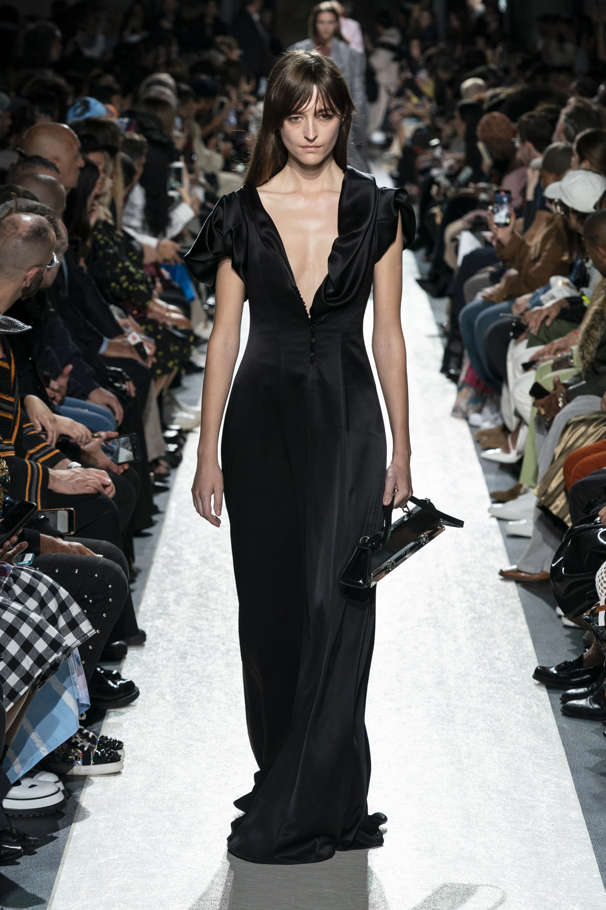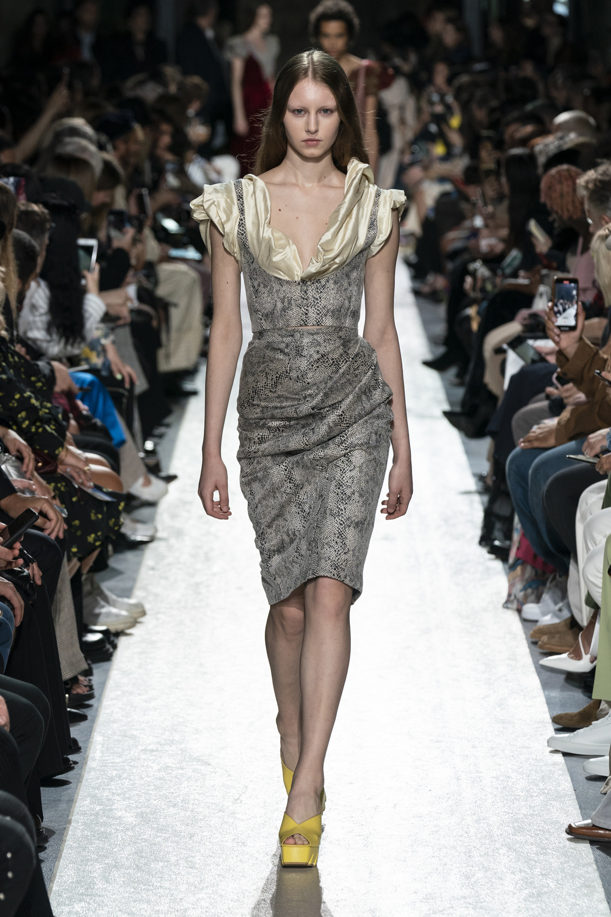 Les références historiques variées du créateur ancrent la collection dans des paysages artistiques éclectiques : les robes emphatiques aux accents théâtraux, désormais un moment attendu chaque saison, semble tout droit sorties du Moyen Âge ou de l’ère Tudor. Les corsets bavarois sont rehaussés par des effusion de taffeta qui dissimulent des décolletés généreux. L’optimisme et la profusion caractéristiques de la Belle Epoque irriguent toute la collection.