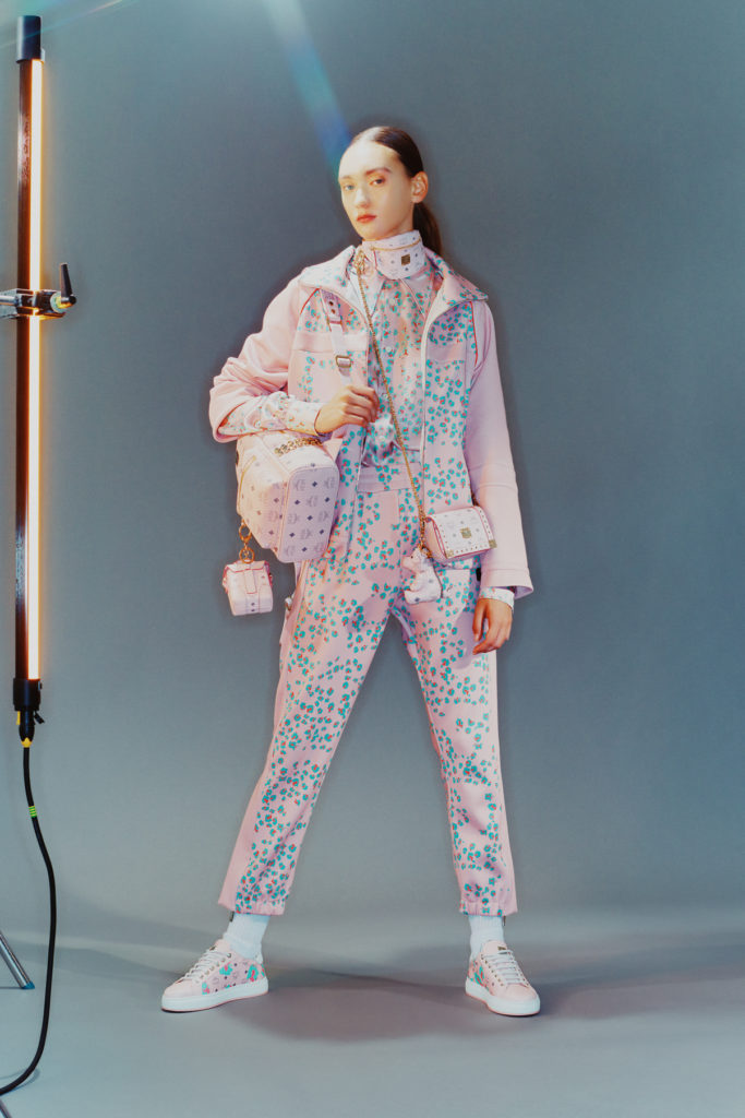 Le logo iconique MCM est réduit ou agrandit s’apparentant ainsi à un motif répétitif sur les survêtements, blousons, shorts et écharpes. Le logo est parfois coupé en deux mais reste toujours lisible et fort. Le motif léopard, un pillier du disco, est épuré dans une inspiration florale, et présent sur les hoodies, manteaux, sacs et chaussures. La boule à facette est réinterpétée de façon abstraite comme une demi-lune brillante apposée sur les sweatshirts et sacs fourre-tout. Le matellassé ajoute de la texture et attire l’œil. En hommage aux origines de MCM, le nouvel imprimé Disco Diamond réinterpète l’iconique motif Visetos avec des formes de diamants colorées qui font écho aux faiseaux de la boule à facettes.