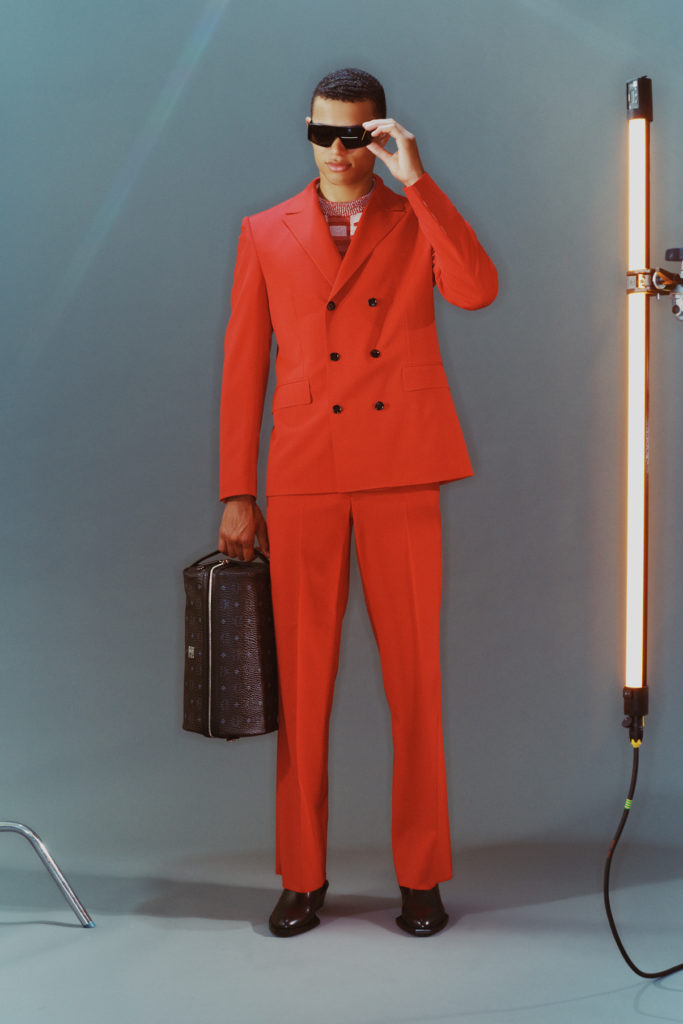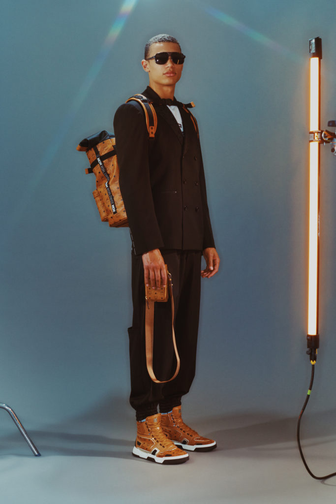 Le dialogue de Schoenberger entre le tailoring et le sportswear s’étend aussi aux accessoires. Les formes iconiques MCM comme le sac tambourin, sont réinterpétées dans un esprit plus sportif et pratique, créant ainsi une nouvelle génération de besaces. Ailleurs, les matières glossy, matelassées rencontrent les chaines dorées. Les sacs boîtes structurés sont élégants, et les sacs à dos sont poussés vers une nouvelle frontière de style, plus utilitaire. Les chaussures sont mixtes avec l’essentiel Chelsea boot – une contradiction par rapport aux éléments plus sportifs de la collection. La fameuse sneaker est réinterpétée dans de nouvelles formes, couleurs et textures.