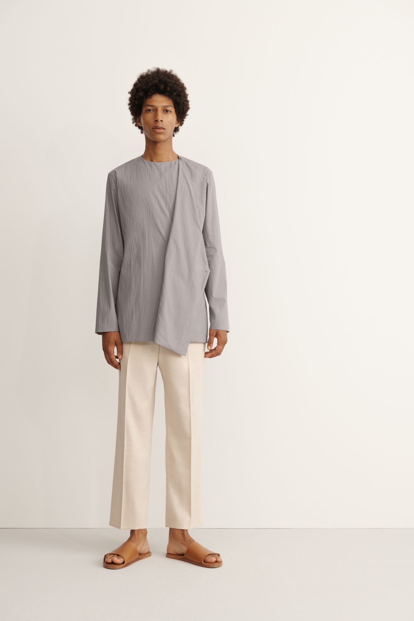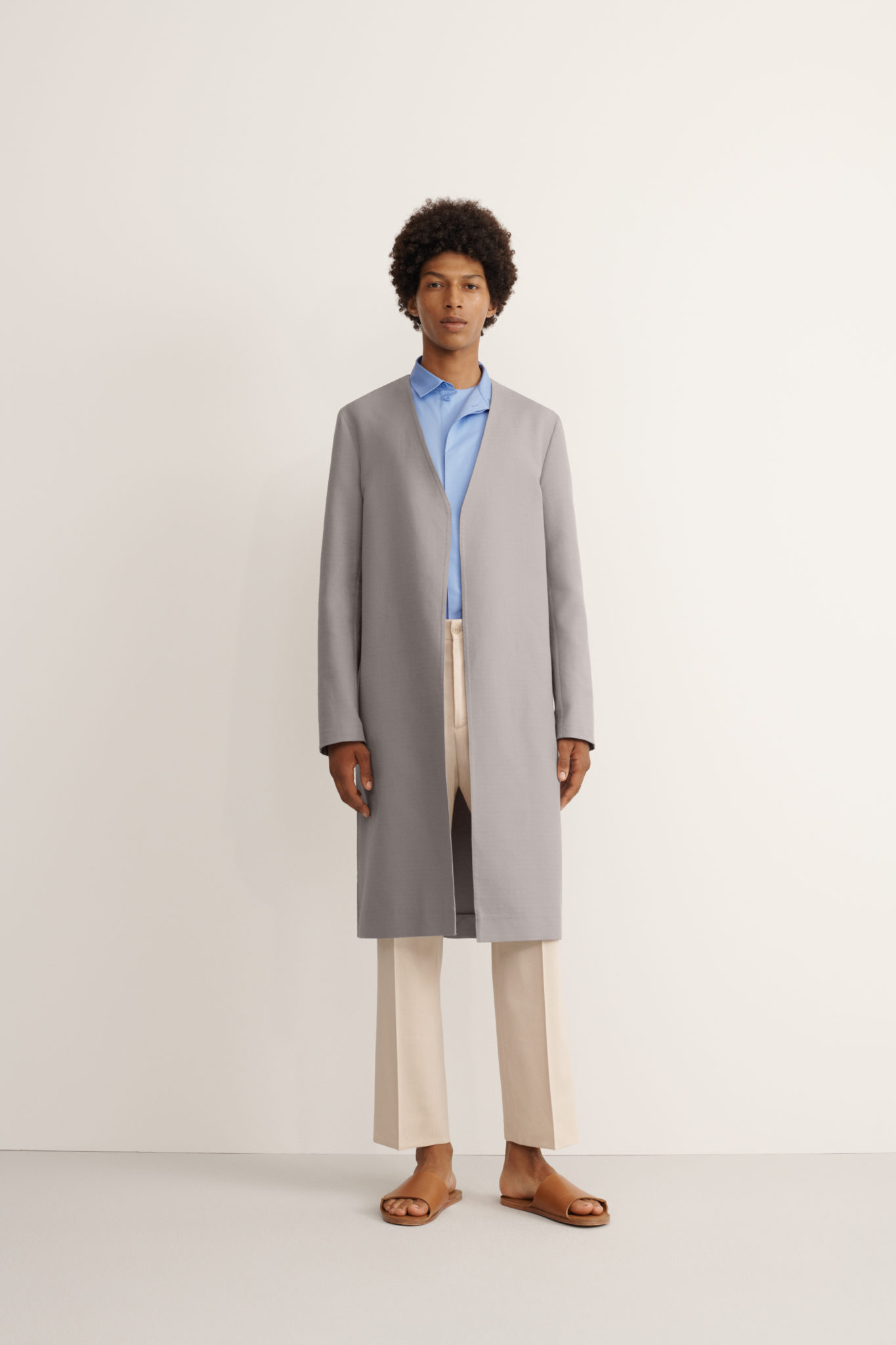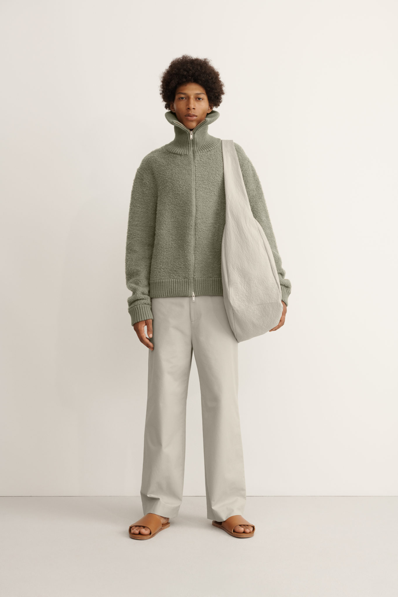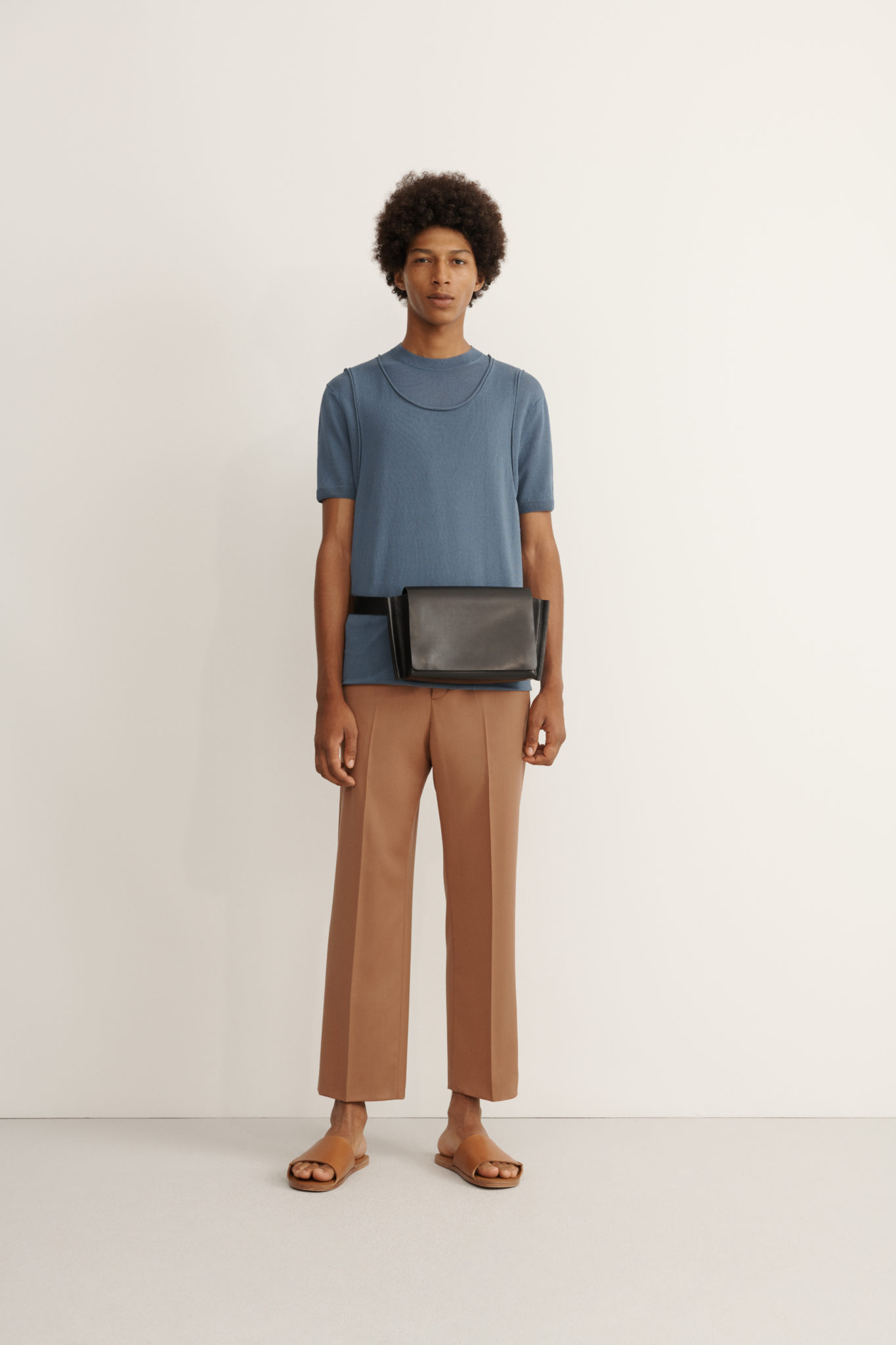 Chez les hommes, les cotons double face sont cousus pour façonner une veste matelassée et apporter de la légèreté à une pièce superposée. Une nouvelle masculinité se profile grâce à une approche plus féminine, qui prête aux hommes une silhouette espiègle et modulaire. Le drapage insuffle une dimension polyvalente à la confection, comme l’illustrent une chemise et un blazer croisés. La fonctionnalité se veut modeste, à en croire un trench et une chemise en popeline de coton à la patte dissimulée. L’esprit paysage se réincarne dans un pull jacquard texturé en maille douce. Pour compléter la collection, les styles bien taillés partent à la rencontre du denim taille haute, dont l’effet enduit permet de proposer une sélection de modèles texturés de transition.