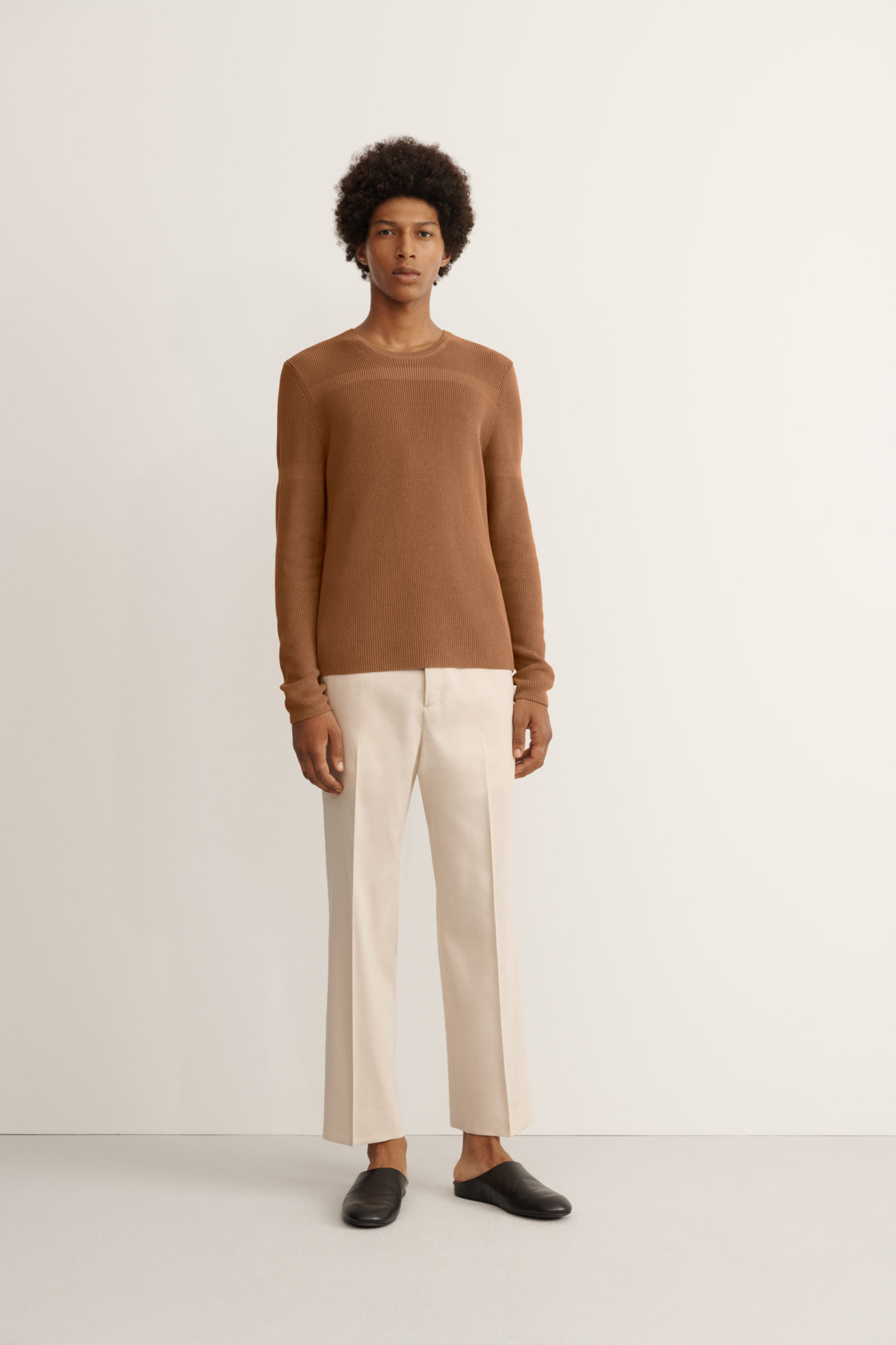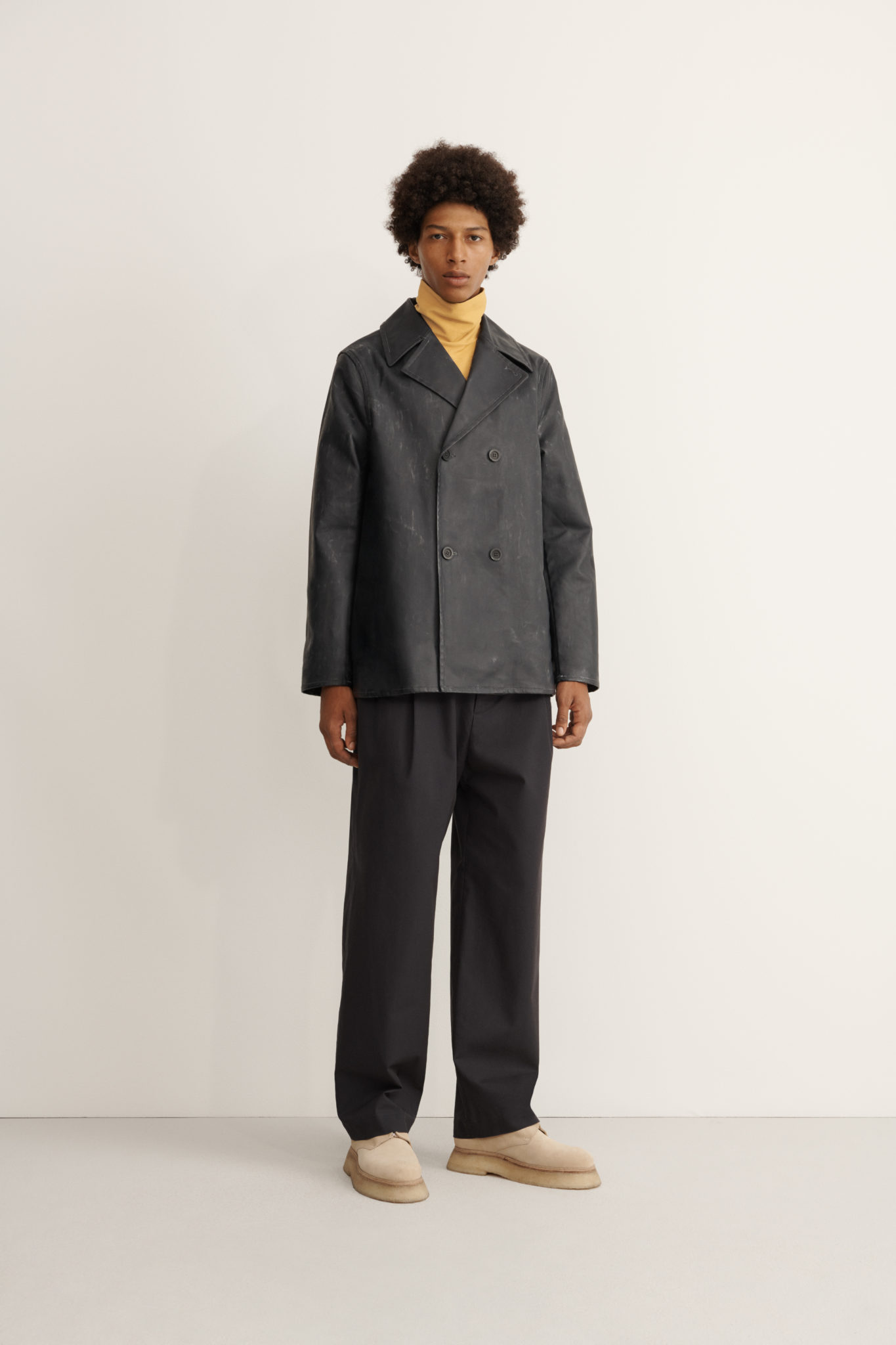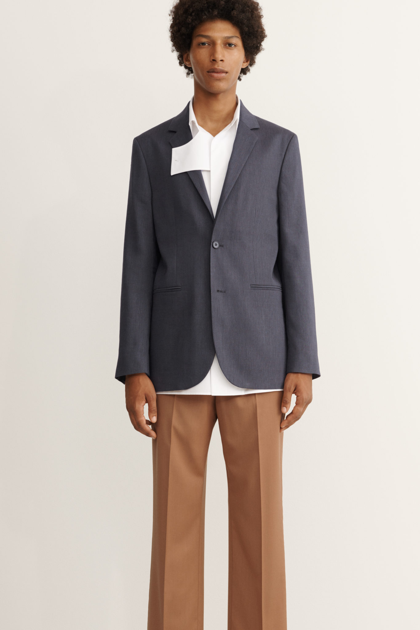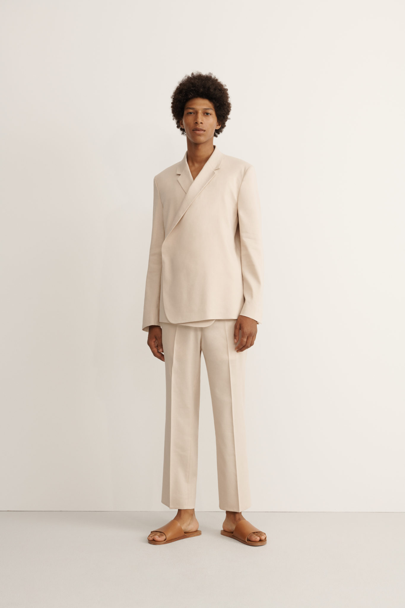 Chez les hommes, les cotons double face sont cousus pour façonner une veste matelassée et apporter de la légèreté à une pièce superposée. Une nouvelle masculinité se profile grâce à une approche plus féminine, qui prête aux hommes une silhouette espiègle et modulaire. Le drapage insuffle une dimension polyvalente à la confection, comme l’illustrent une chemise et un blazer croisés. La fonctionnalité se veut modeste, à en croire un trench et une chemise en popeline de coton à la patte dissimulée. L’esprit paysage se réincarne dans un pull jacquard texturé en maille douce. Pour compléter la collection, les styles bien taillés partent à la rencontre du denim taille haute, dont l’effet enduit permet de proposer une sélection de modèles texturés de transition.