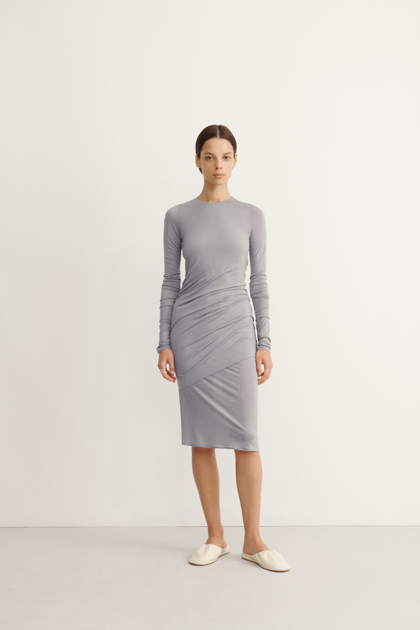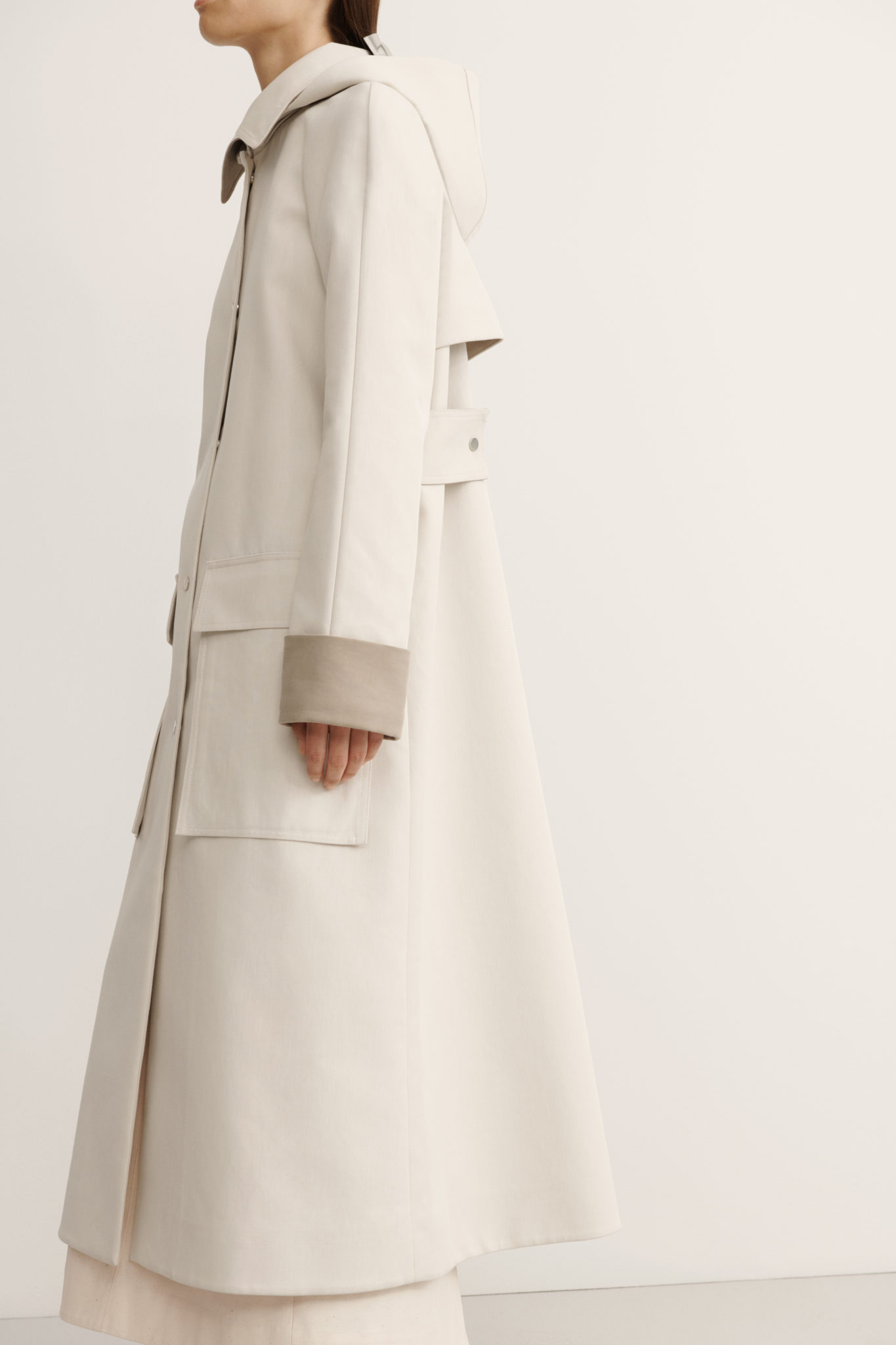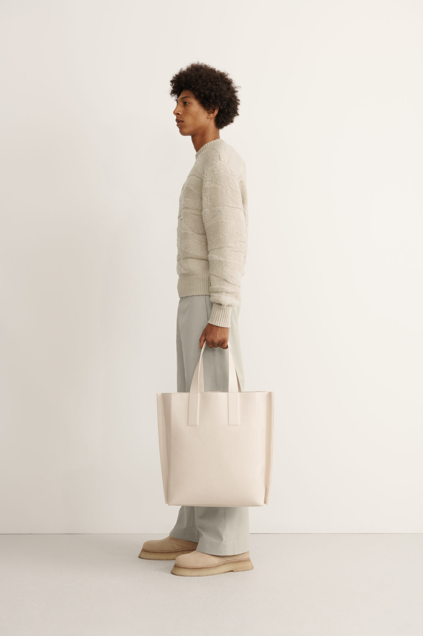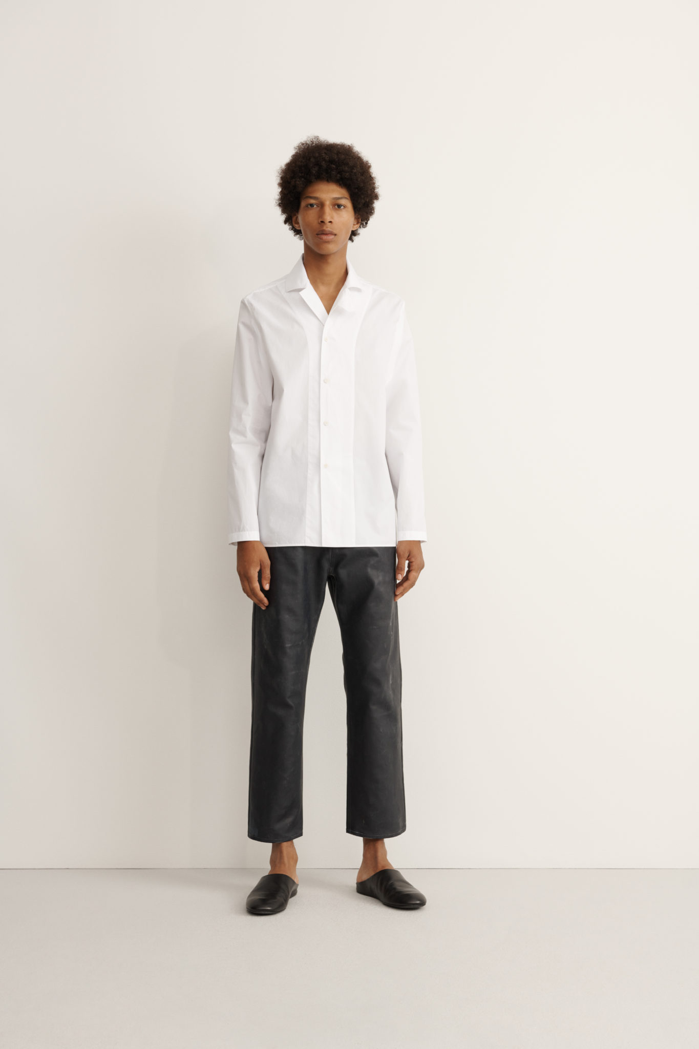 Chez les hommes, les cotons double face sont cousus pour façonner une veste matelassée et apporter de la légèreté à une pièce superposée. Une nouvelle masculinité se profile grâce à une approche plus féminine, qui prête aux hommes une silhouette espiègle et modulaire. Le drapage insuffle une dimension polyvalente à la confection, comme l’illustrent une chemise et un blazer croisés. La fonctionnalité se veut modeste, à en croire un trench et une chemise en popeline de coton à la patte dissimulée. L’esprit paysage se réincarne dans un pull jacquard texturé en maille douce. Pour compléter la collection, les styles bien taillés partent à la rencontre du denim taille haute, dont l’effet enduit permet de proposer une sélection de modèles texturés de transition.