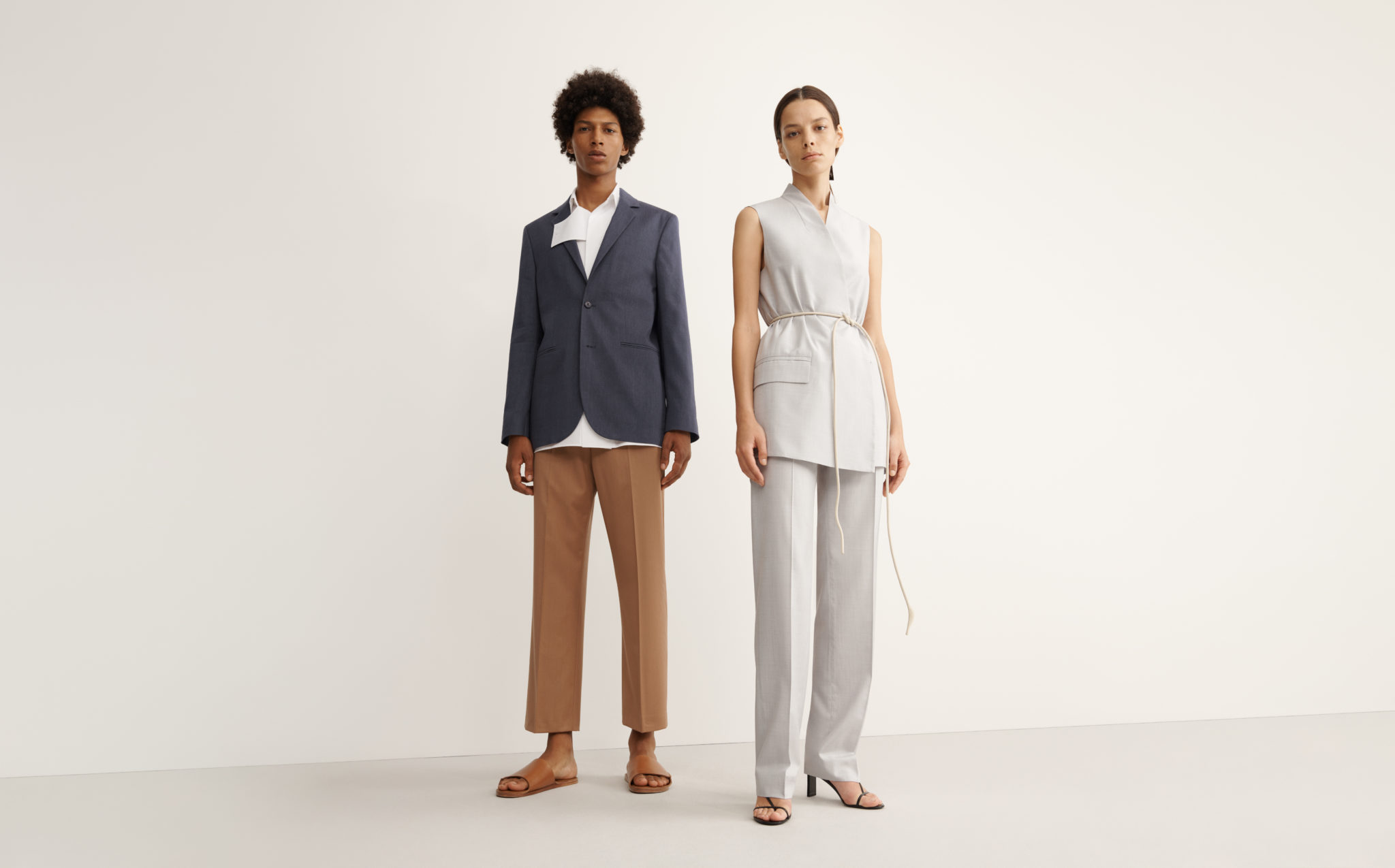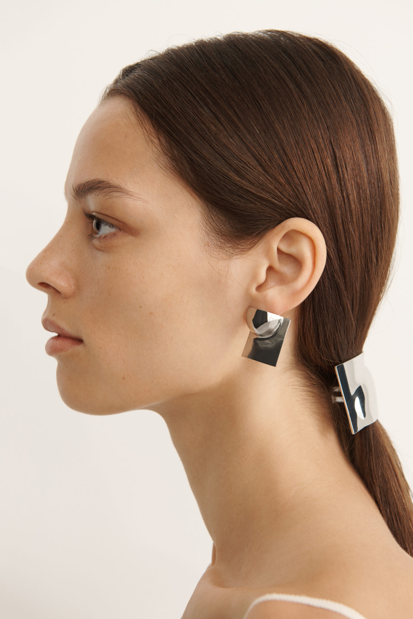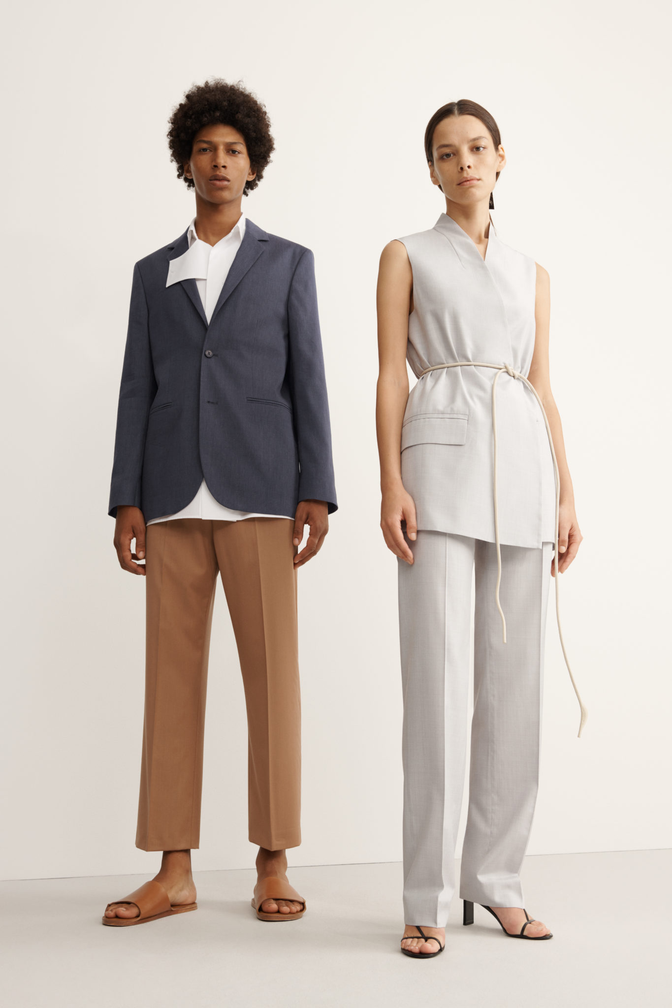 Côté accessoires, les lignes éclectiques s’offrent à nous au détour de mules sans lacets qui viennent chausser aussi bien les femmes que les hommes, pour leur conférer une allure nonchalante tout en simplicité. Conçus en fonction de leur forme, les accessoires jouent la discrétion à l’image des boucles d’oreilles rectangulaires en argent sterling recyclé et d’un sac plié triangulaire en cuir. L’aspect fonctionnel de la collection homme se glisse dans une couverture multi-usage pouvant faire office de sac. Quant aux accessoires pour cheveux, ils se métamorphosent au gré de la collection et se révèlent indispensables p