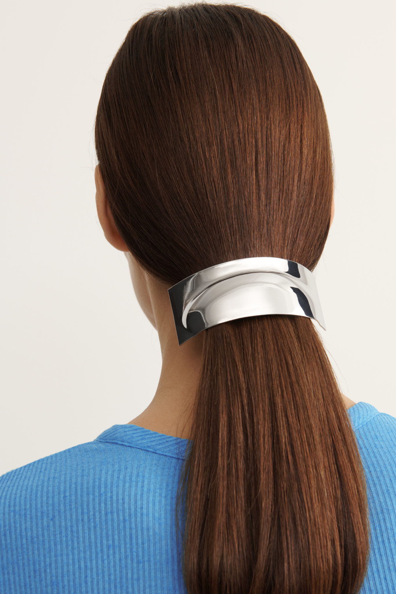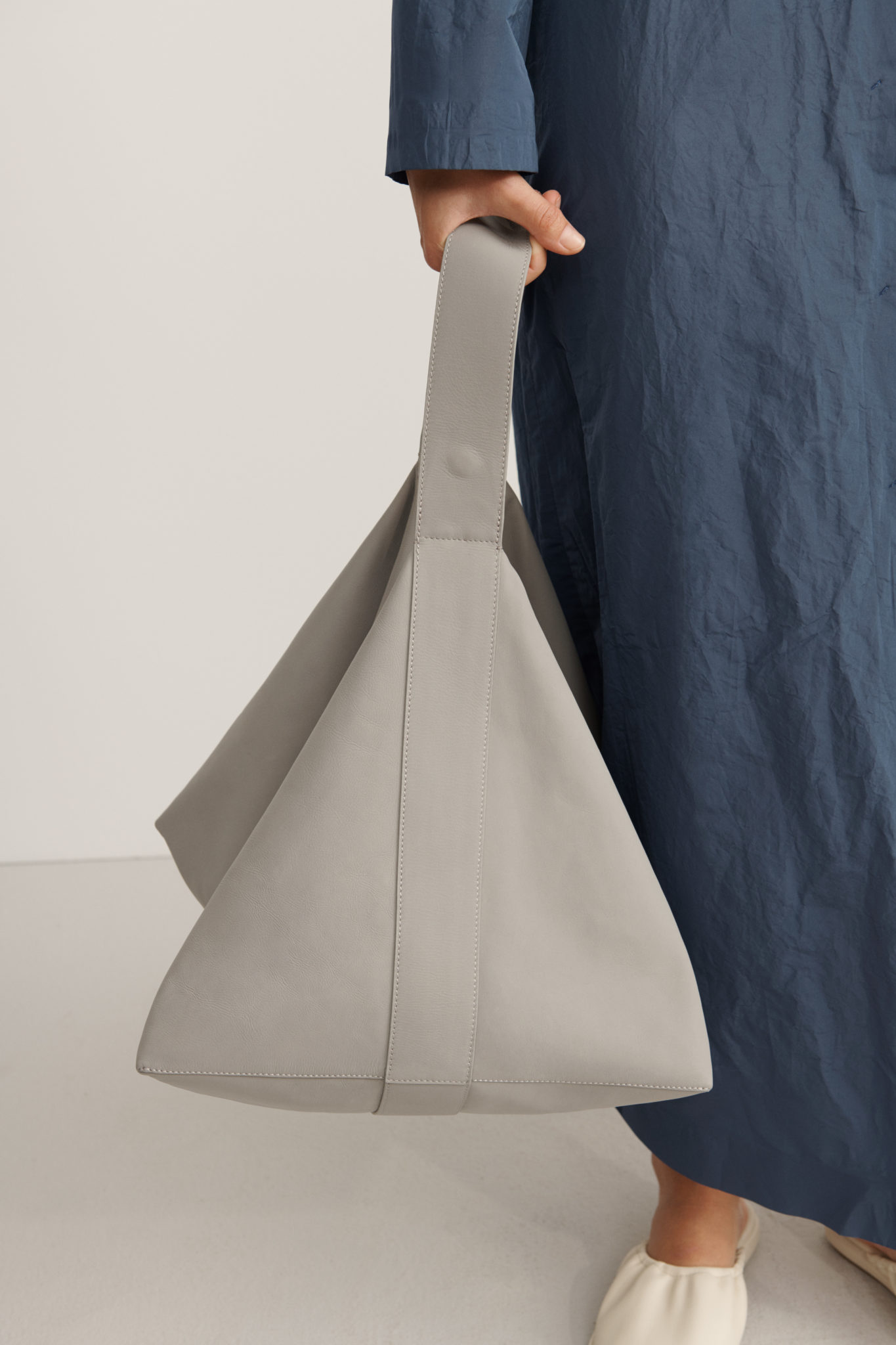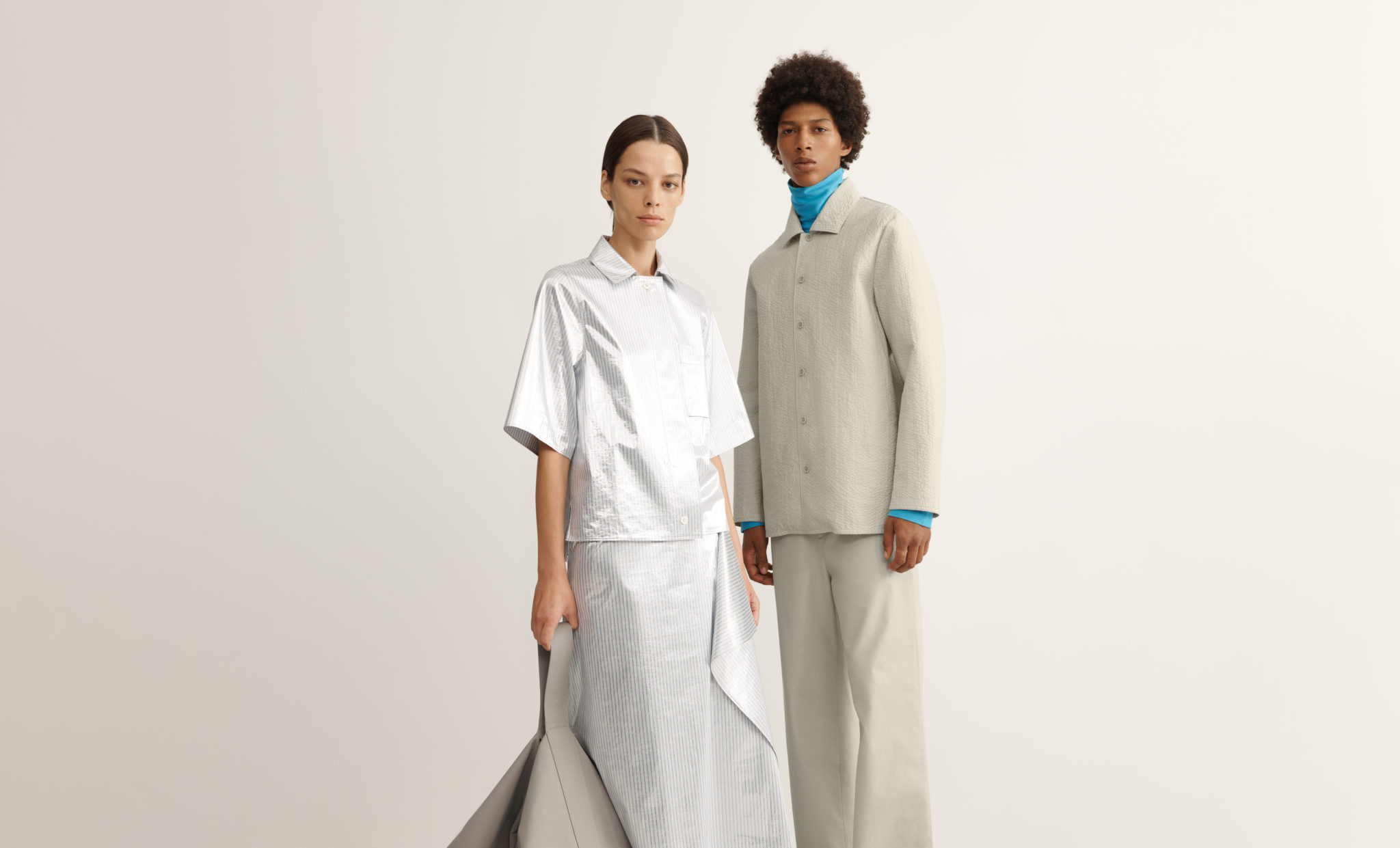 Côté accessoires, les lignes éclectiques s’offrent à nous au détour de mules sans lacets qui viennent chausser aussi bien les femmes que les hommes, pour leur conférer une allure nonchalante tout en simplicité. Conçus en fonction de leur forme, les accessoires jouent la discrétion à l’image des boucles d’oreilles rectangulaires en argent sterling recyclé et d’un sac plié triangulaire en cuir. L’aspect fonctionnel de la collection homme se glisse dans une couverture multi-usage pouvant faire office de sac. Quant aux accessoires pour cheveux, ils se métamorphosent au gré de la collection et se révèlent indispensables p