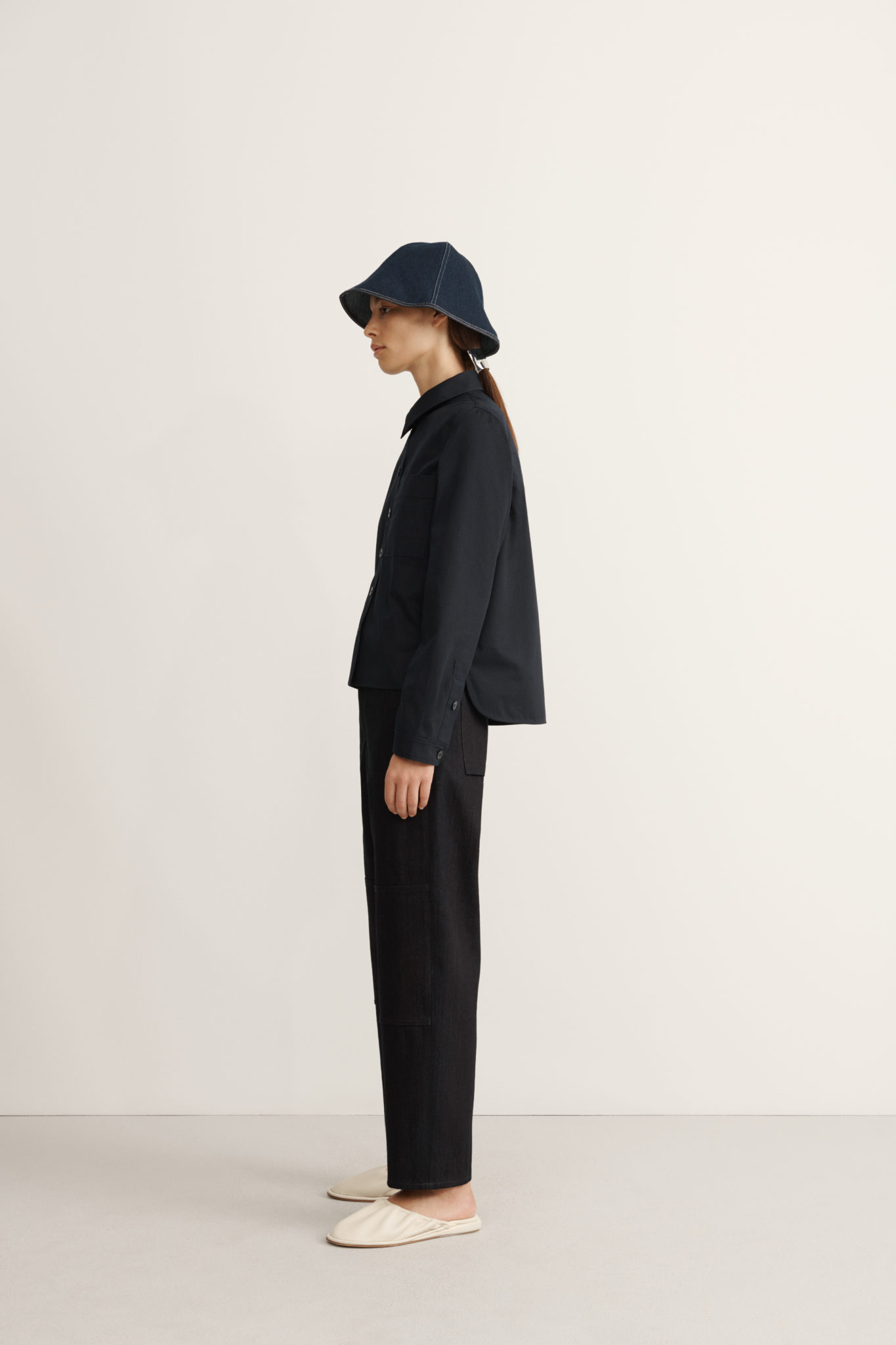 Au cœur d’une palette de couleurs évoquant la praticité à l’état brut, l’écru naturel, les tons neutres doux et les gris clairs industriels s’imposent au sein de la collection, contrastés par le cyan électrique, le rouge audacieux, le jaune moutarde et les nuances bleu indigo.