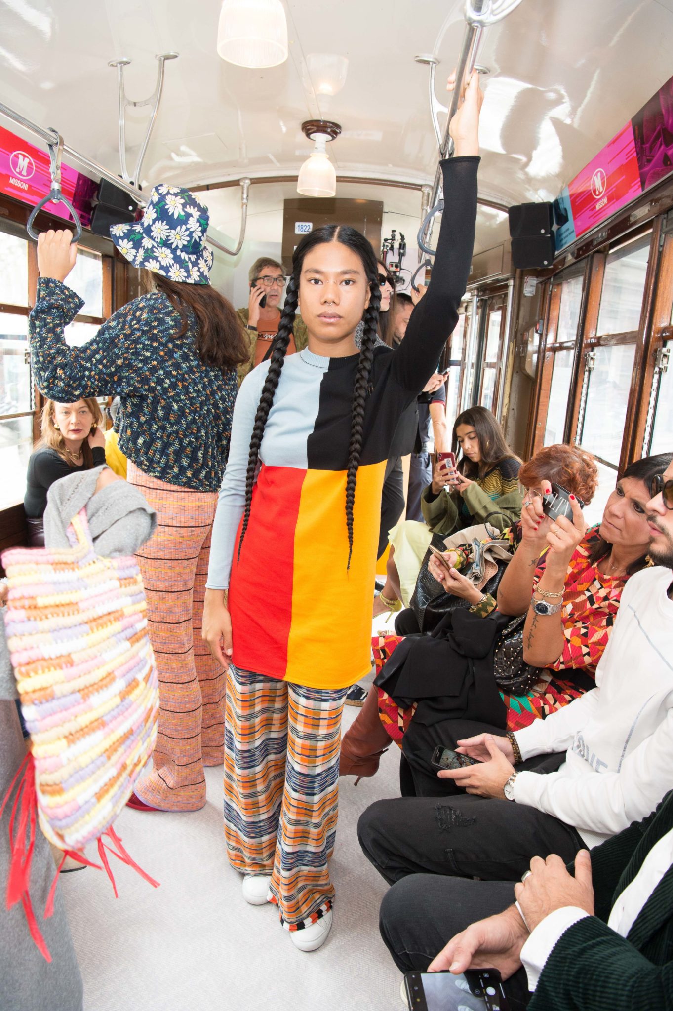 Expect the unexpected. In fact, today, the presentation takes the form of a tranche de vie as various characters of every age and walk of life get up and down from a tram crossing the city, decked in M Missoni but completely devoid of the catwalk antics. Is it theater or real life? Do we really need to know? Clothing is part of the mise en scene of daily life anyway, that’s for sure. The rest is individual interpretation.