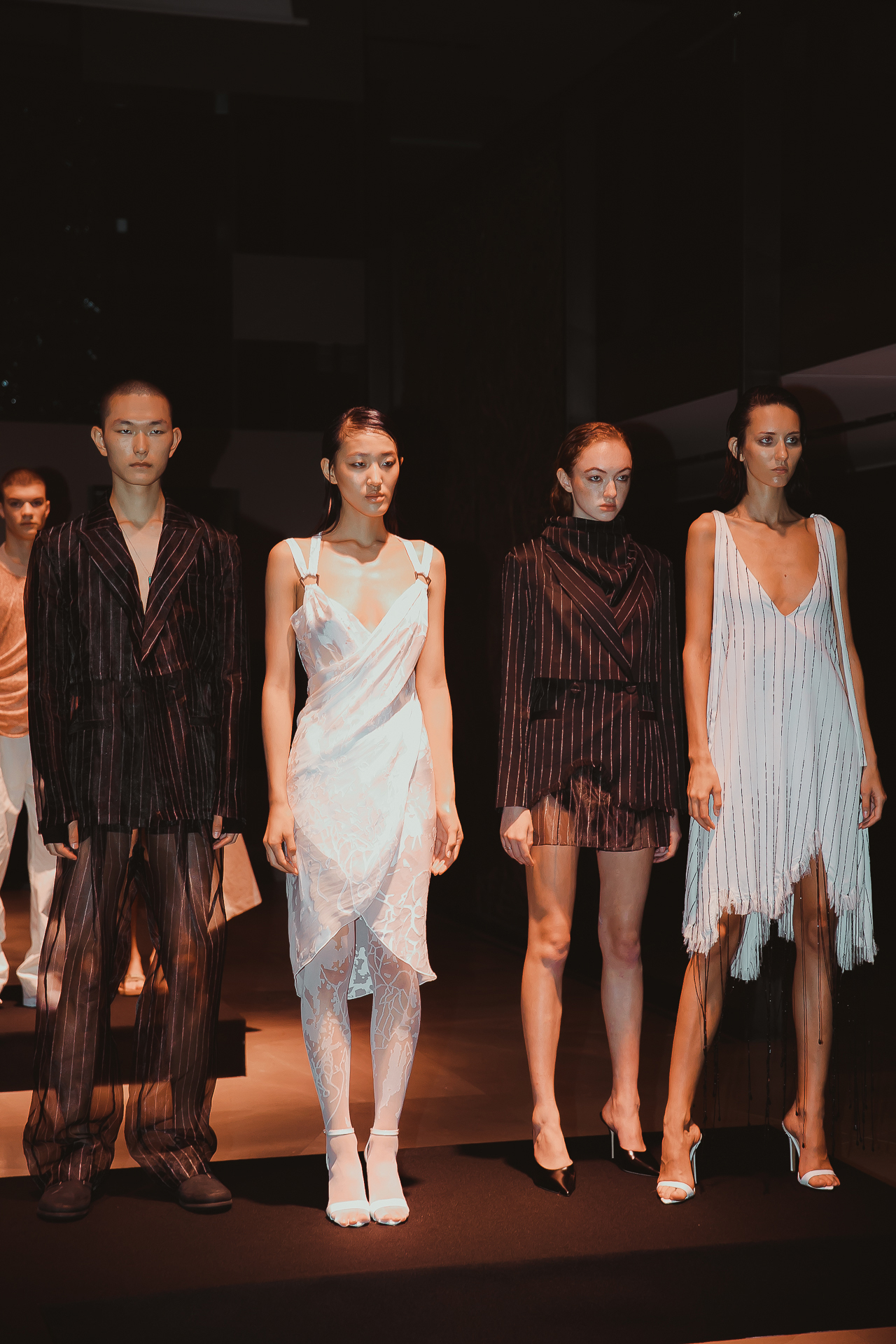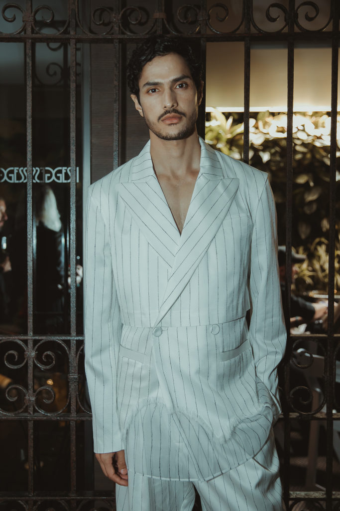Pinstriped suits feature uneven cuts and a hand-made frayed hem leaves space to an organdy lining with the same pattern that completes the garments’ fitting.