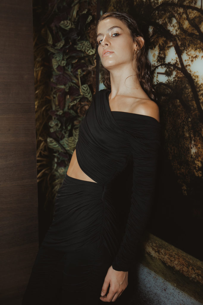 Creativity and high quality are the values that drove the creation of this collection. Daniele Niboli has carefully chosen companies and laboratories. Only partners able to guarantee a 100% made in Italy. Among these Fulgar, Italian excellence and international leader in the production of man-made yarns, with an entirely green portfolio. Italian fabrics, some of which are produced with innovative fibers derived from low environmental impact yarns such as the black hyper-light jersey made with recycled yarn Q-NOVA® by Fulgar and utilized for stockings and tights that showcase the same design as devoré satin – or the strictly green denim canvas.