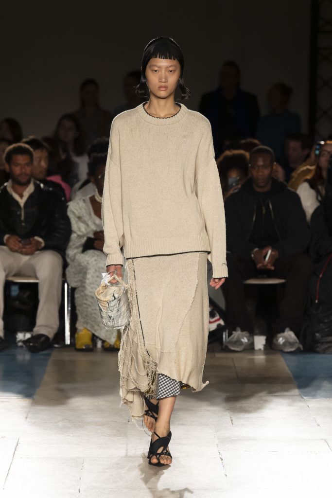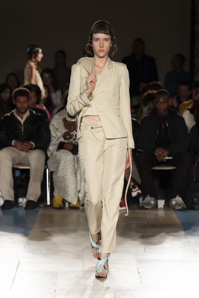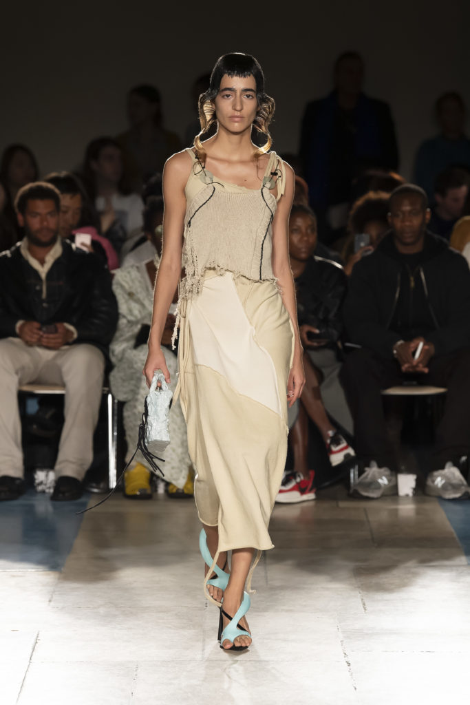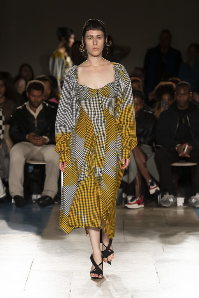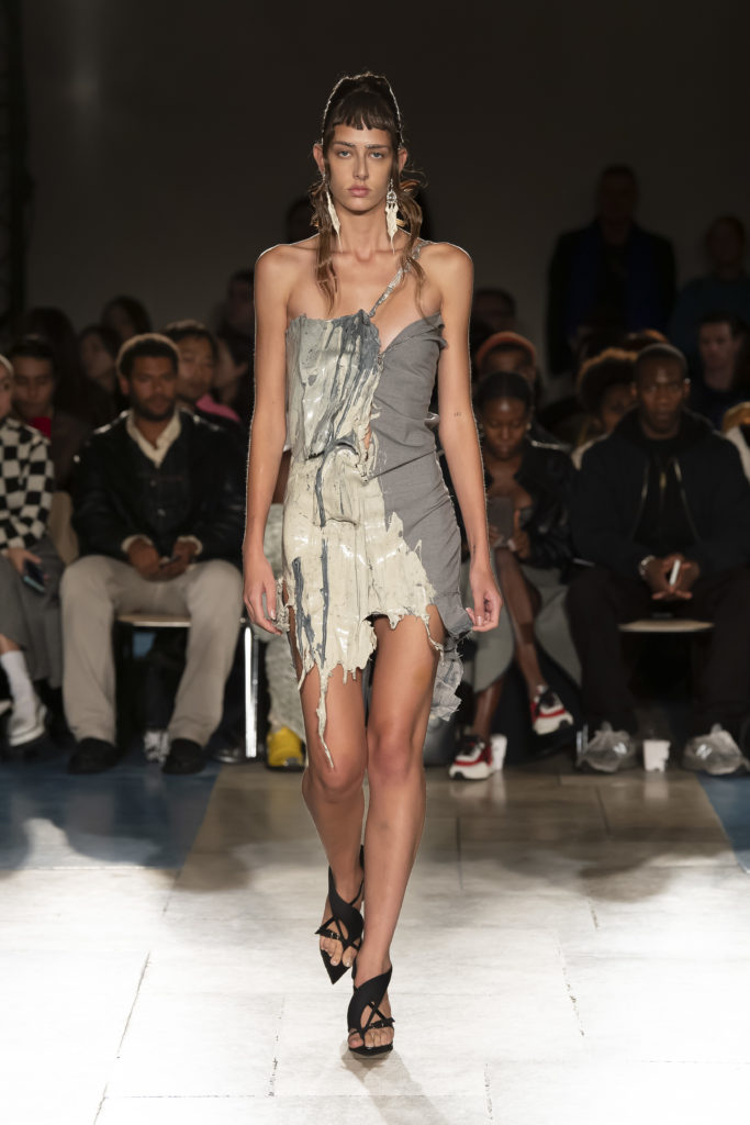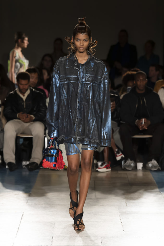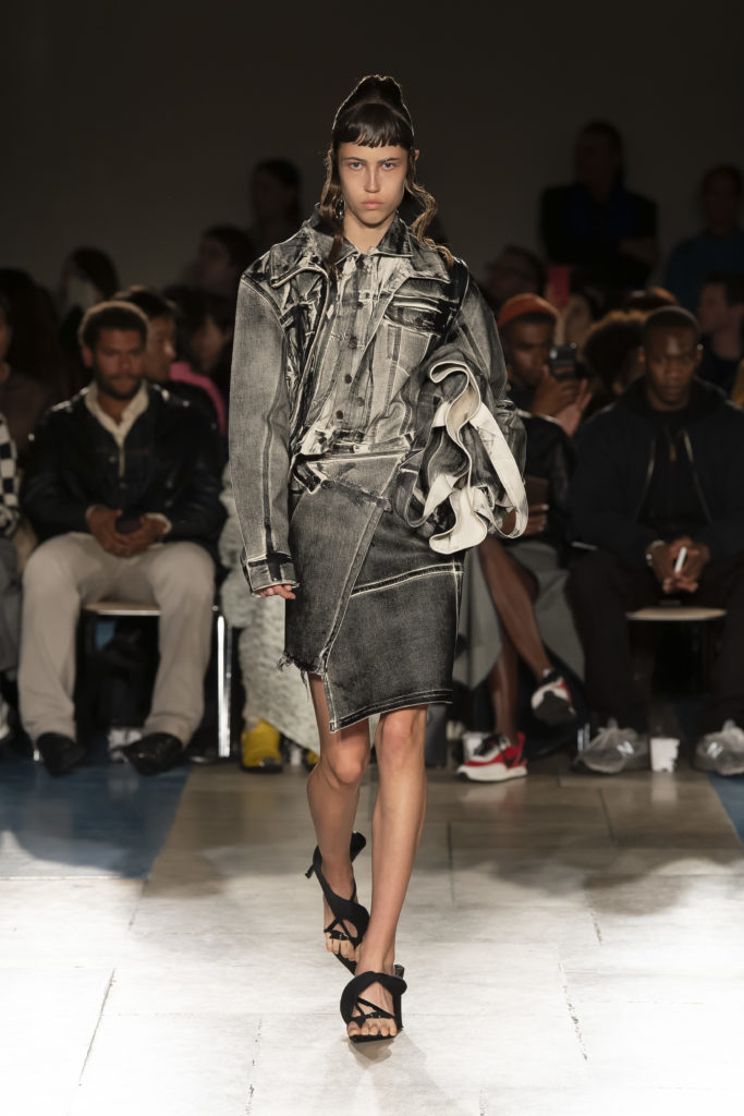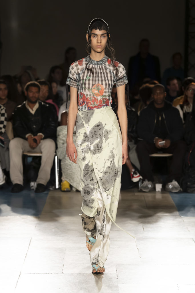 La démarche déconstructiviste de la marque et ses traitements innovants des textiles parcourent toute la collection PE2020 : des pièces tailleurs asymétriques au tissu Vichy teint à la main en passant par le denim peint aux finissions hypnotiques.