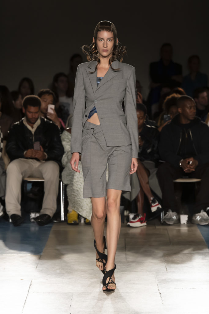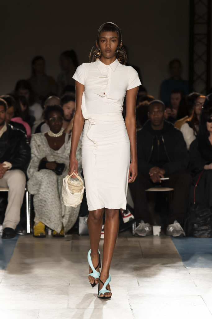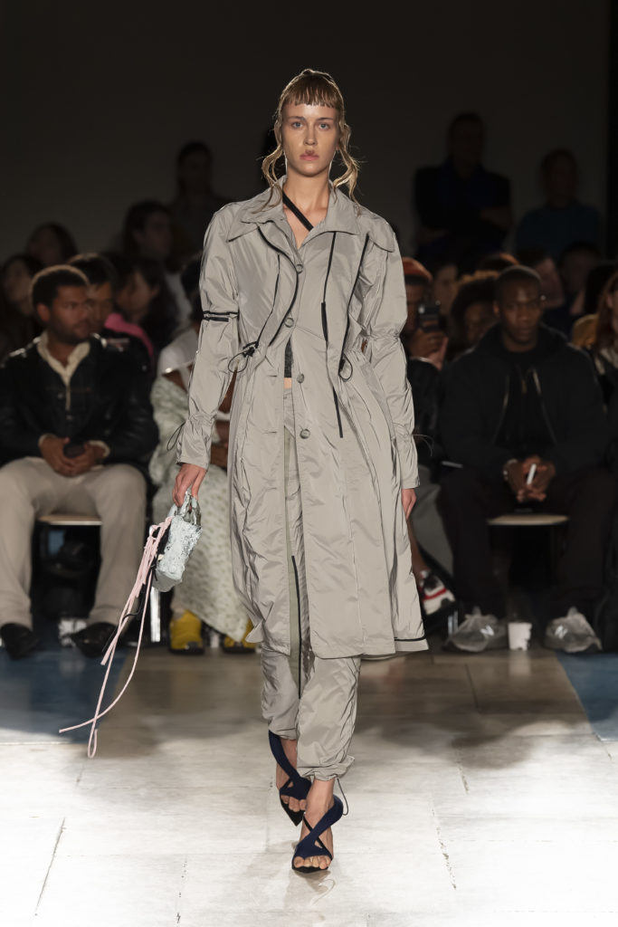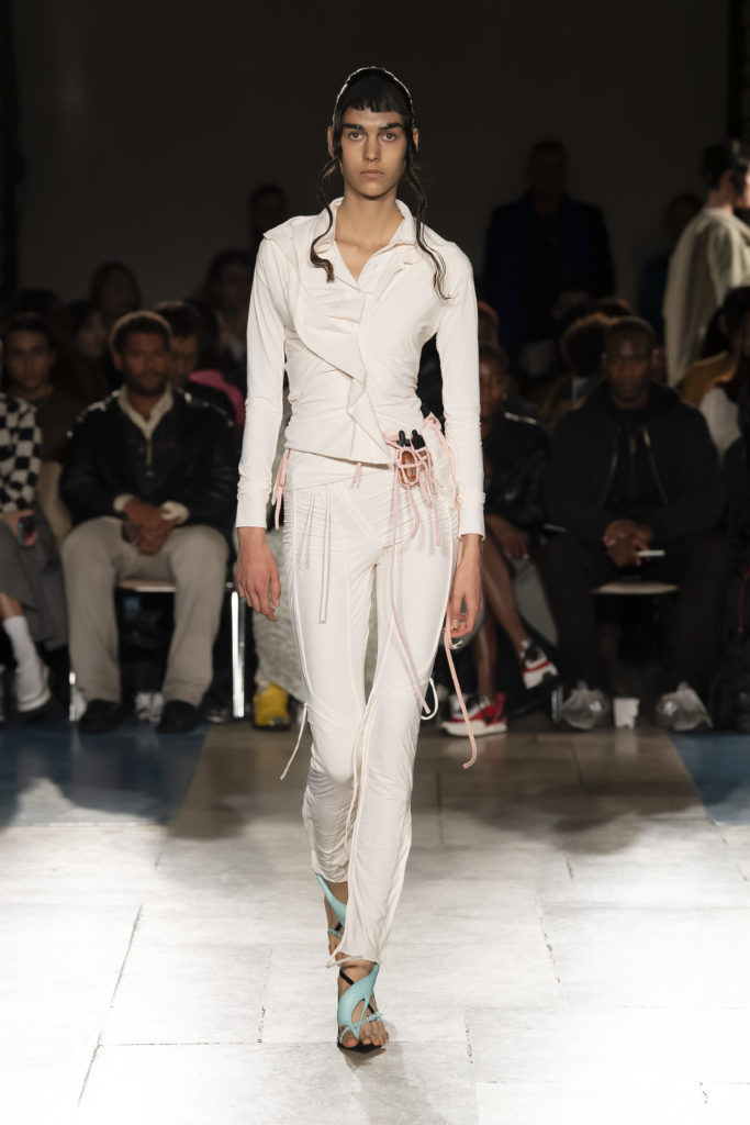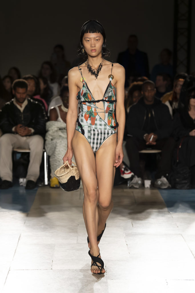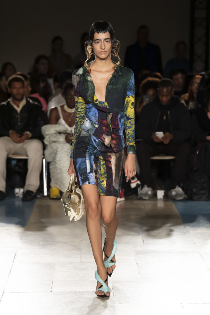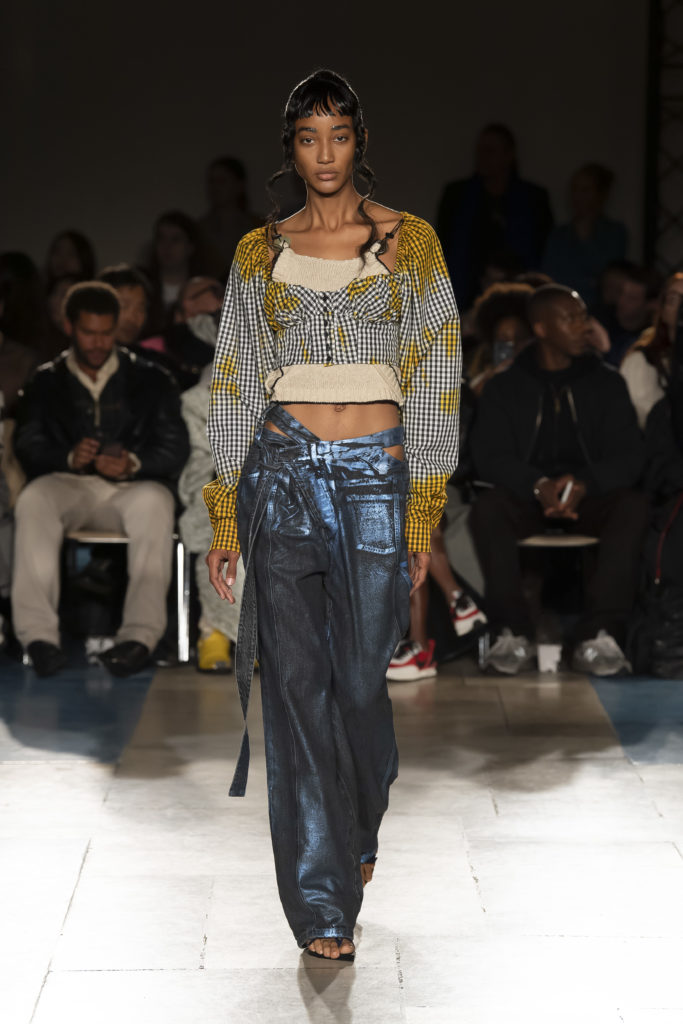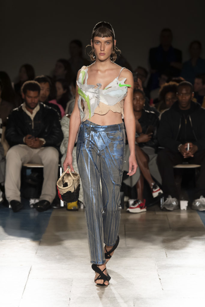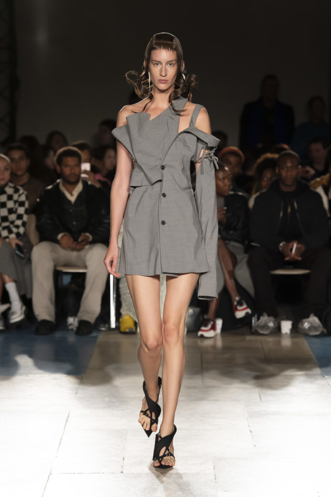 La démarche déconstructiviste de la marque et ses traitements innovants des textiles parcourent toute la collection PE2020 : des pièces tailleurs asymétriques au tissu Vichy teint à la main en passant par le denim peint aux finissions hypnotiques.