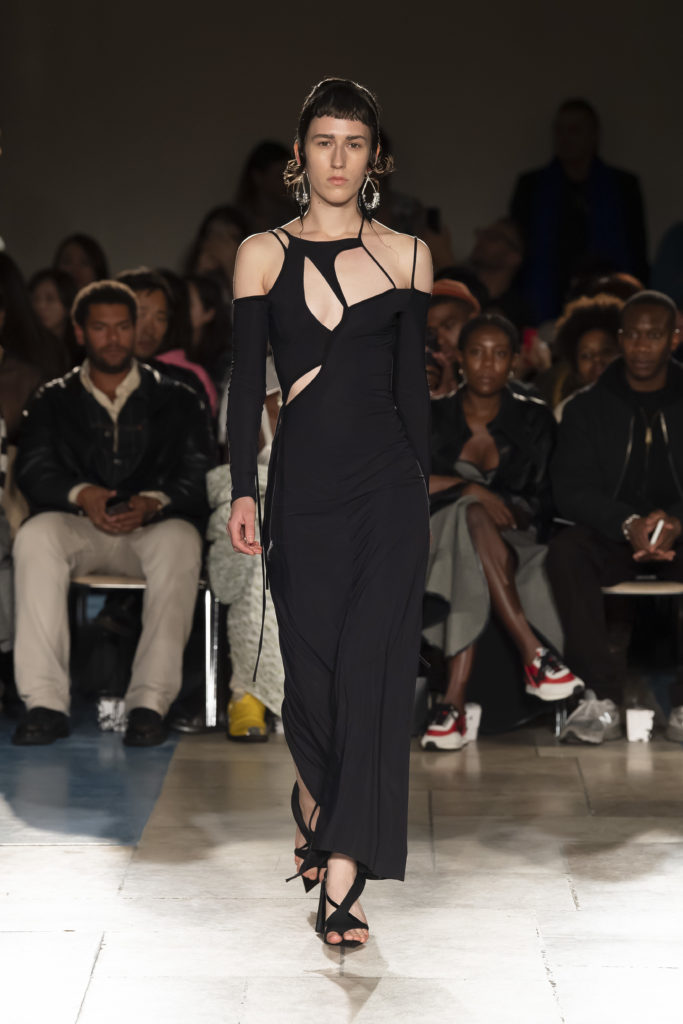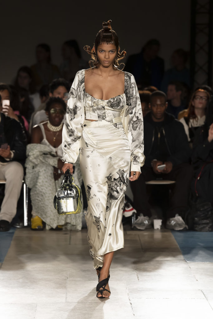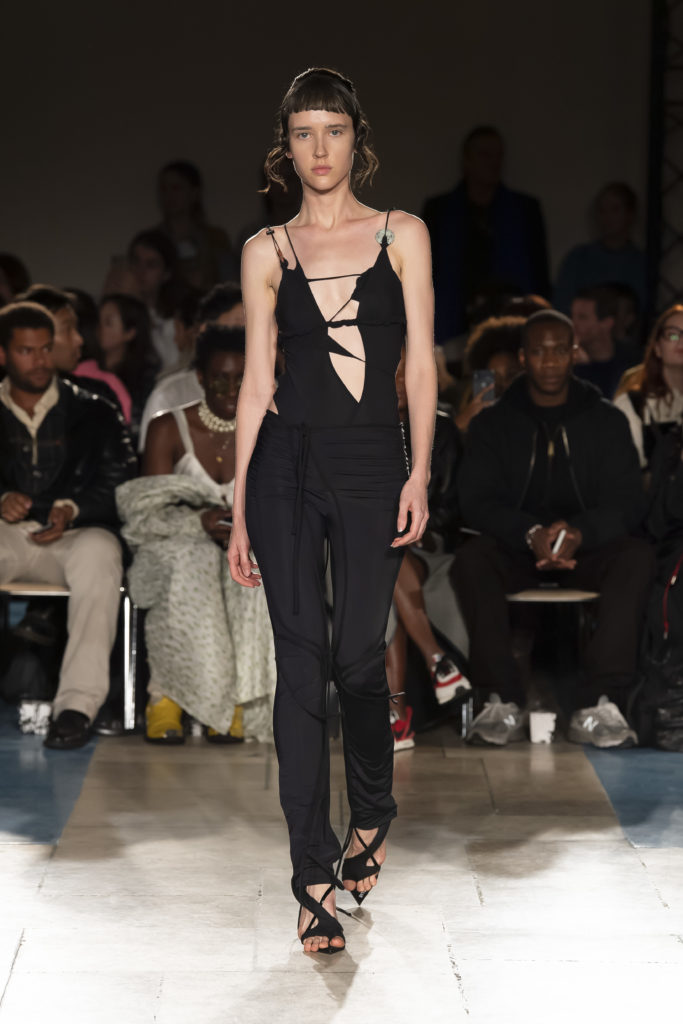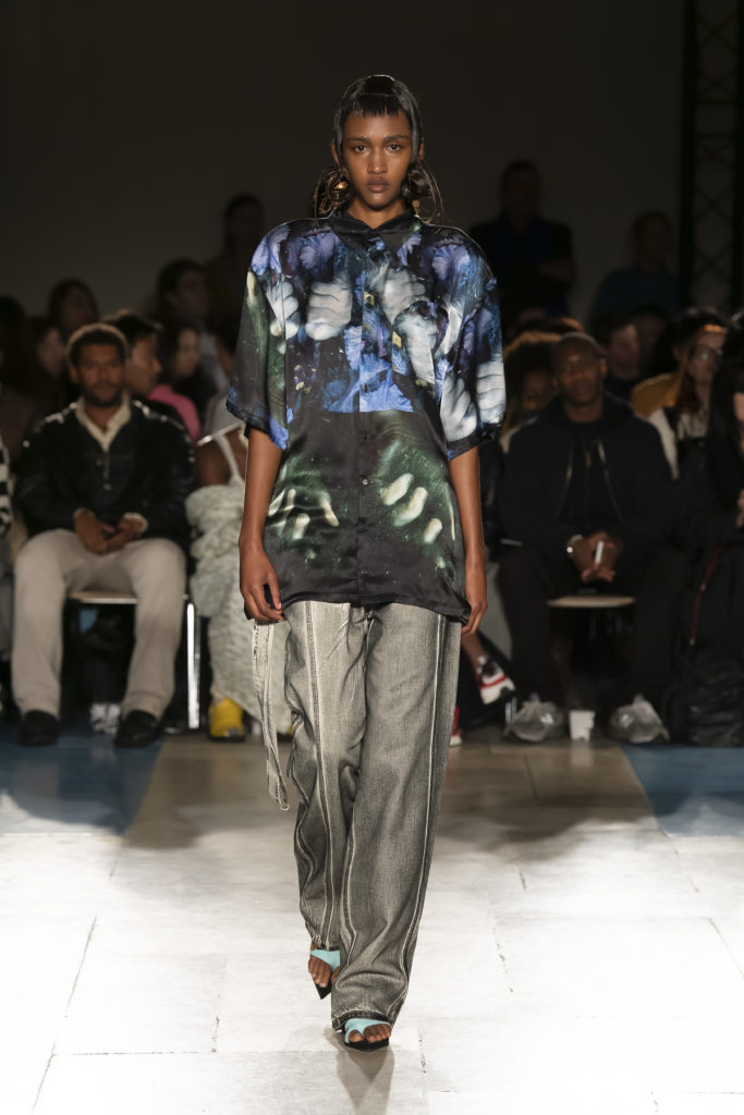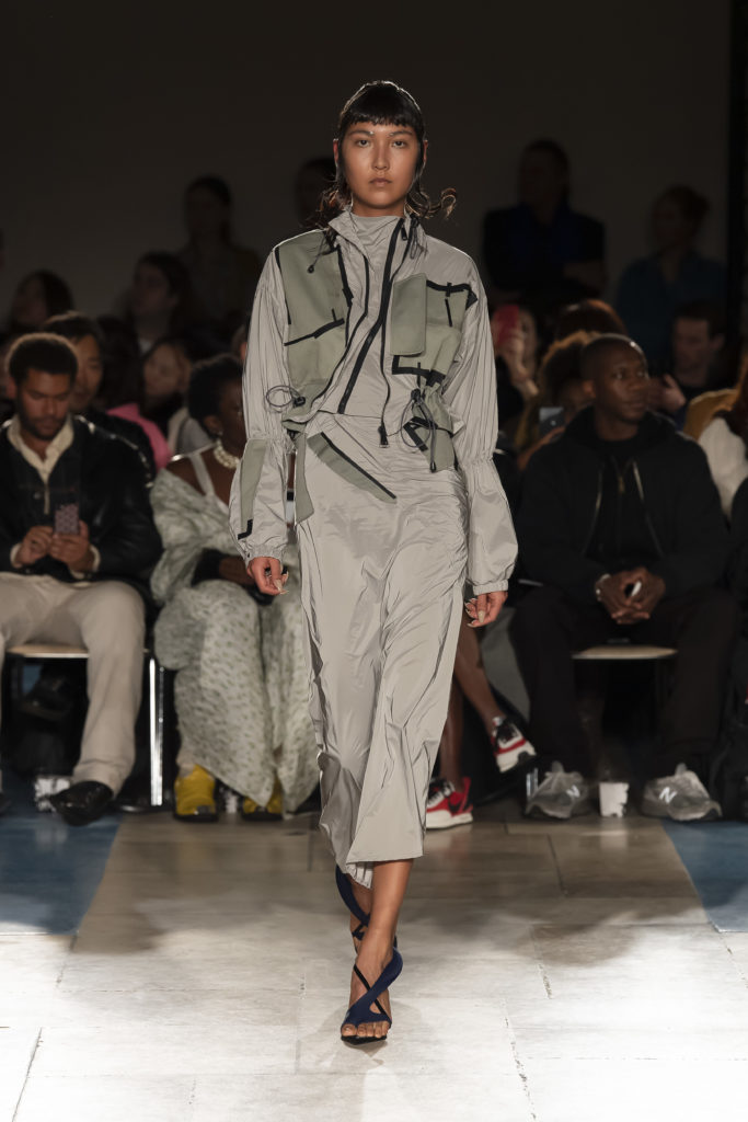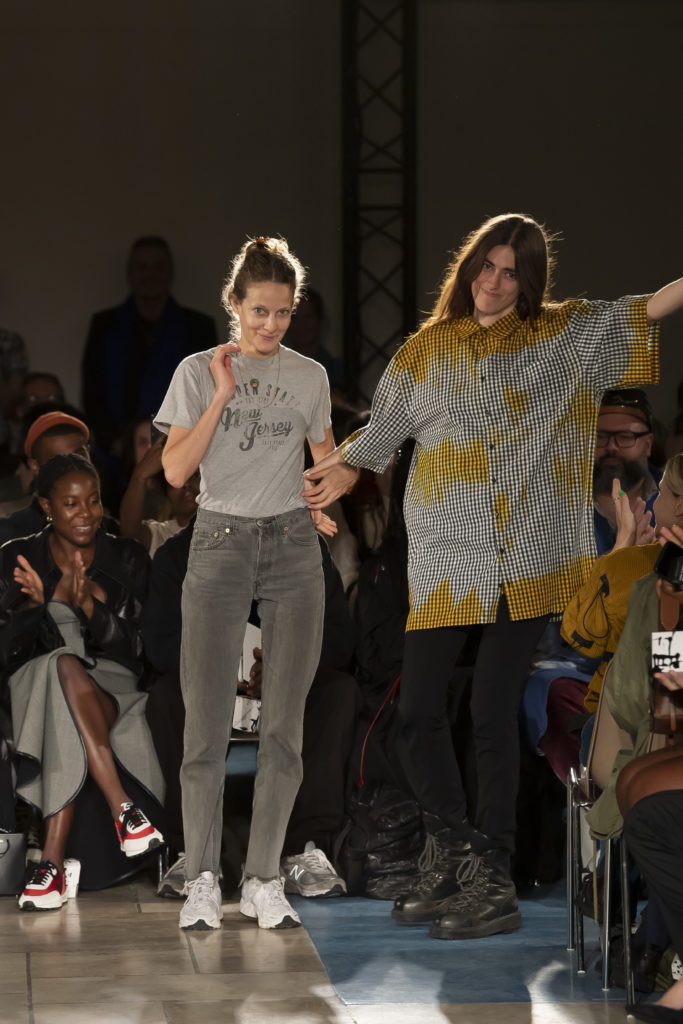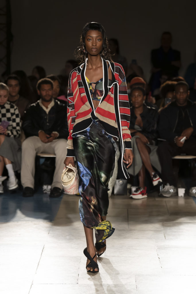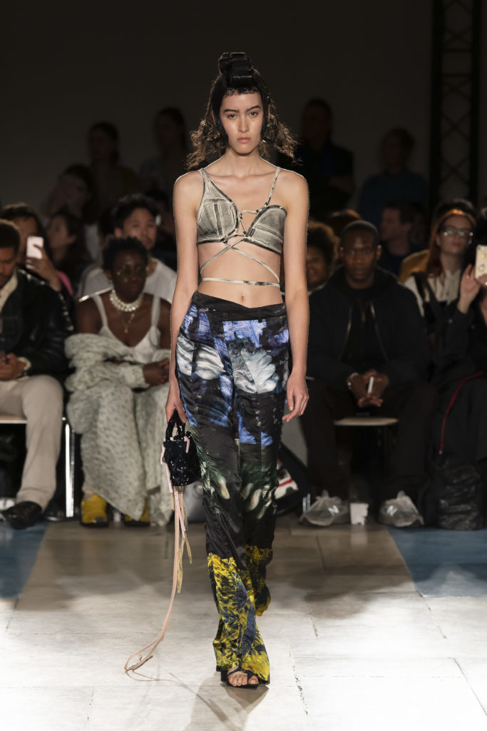 La démarche déconstructiviste de la marque et ses traitements innovants des textiles parcourent toute la collection PE2020 : des pièces tailleurs asymétriques au tissu Vichy teint à la main en passant par le denim peint aux finissions hypnotiques.