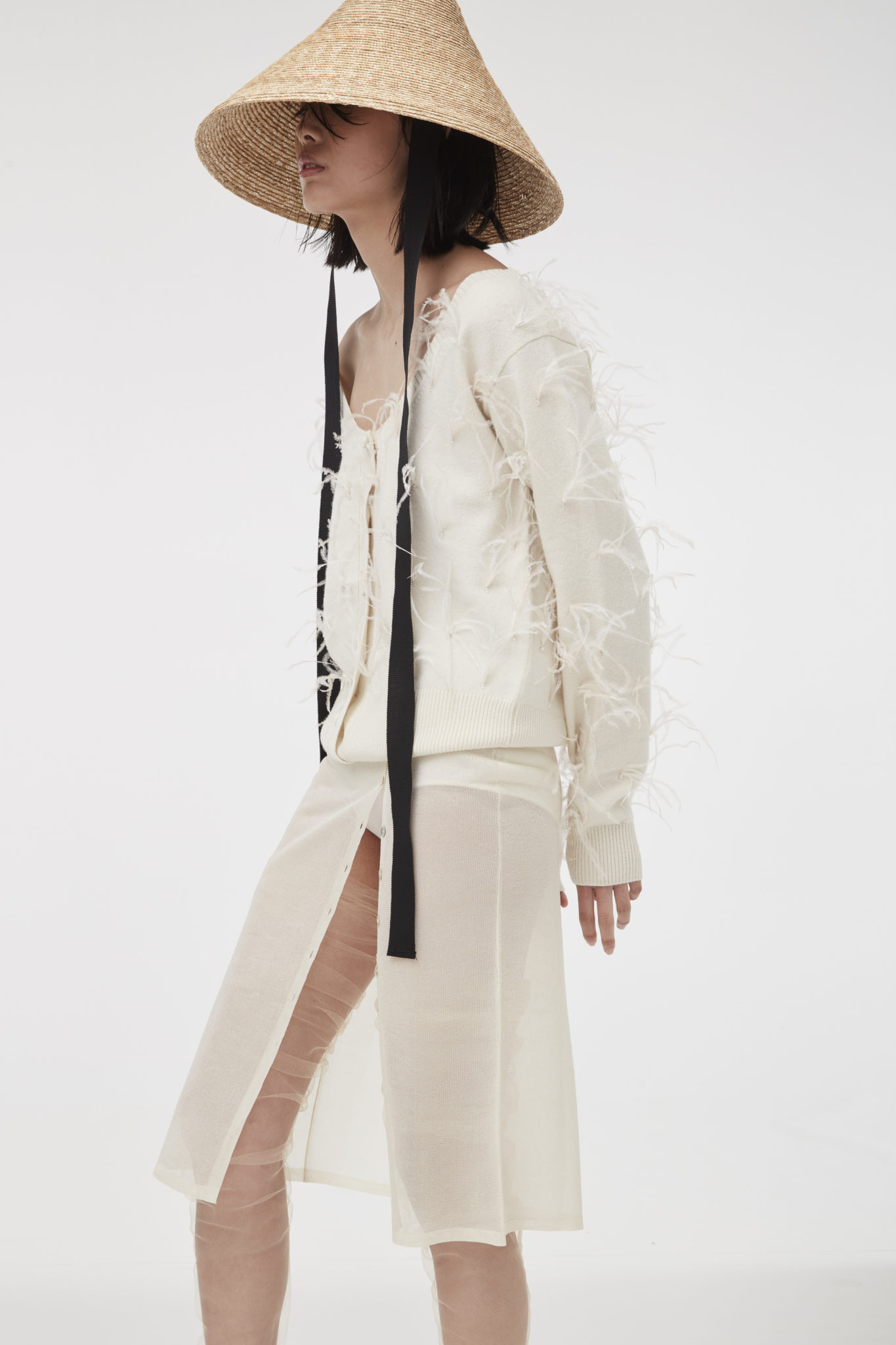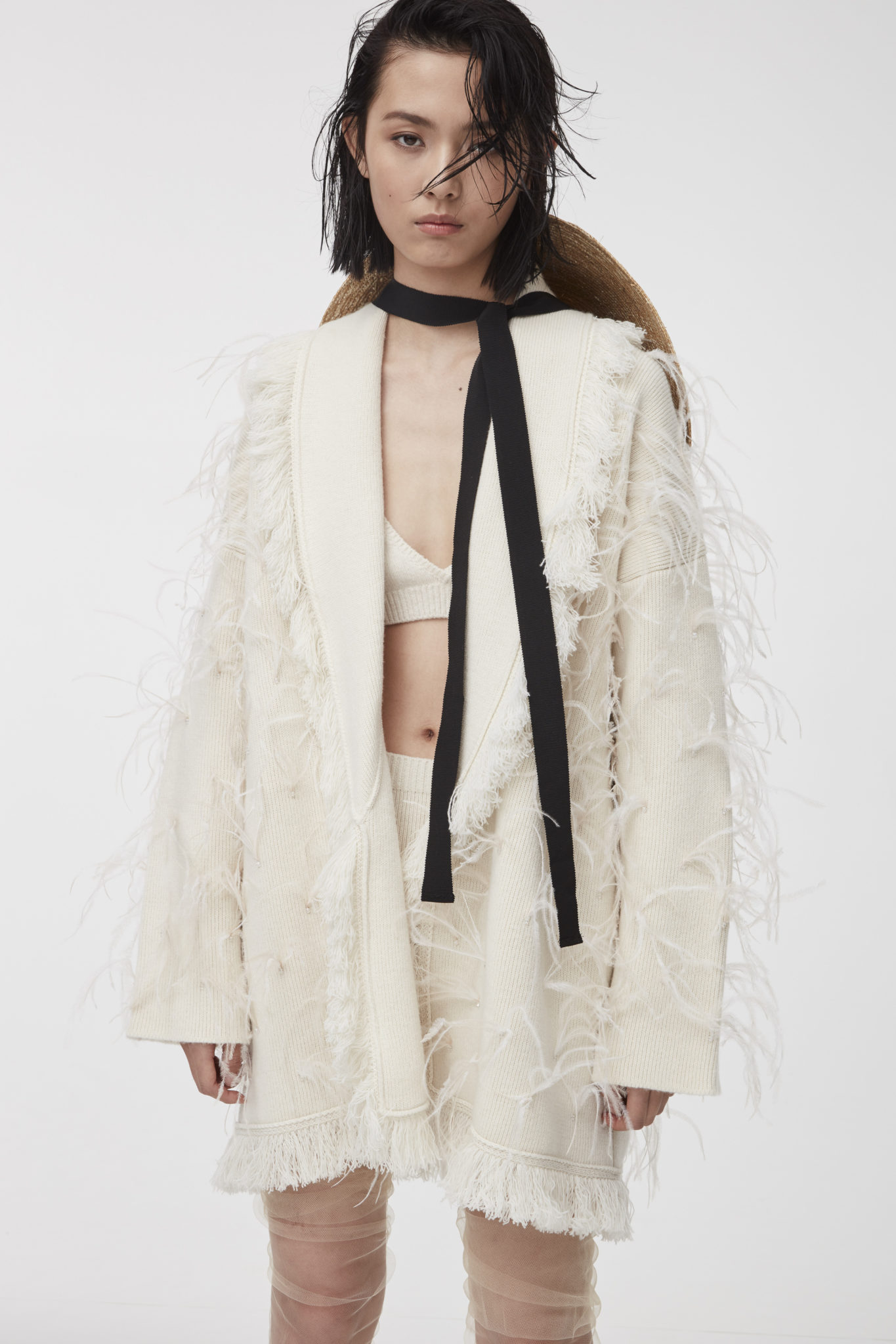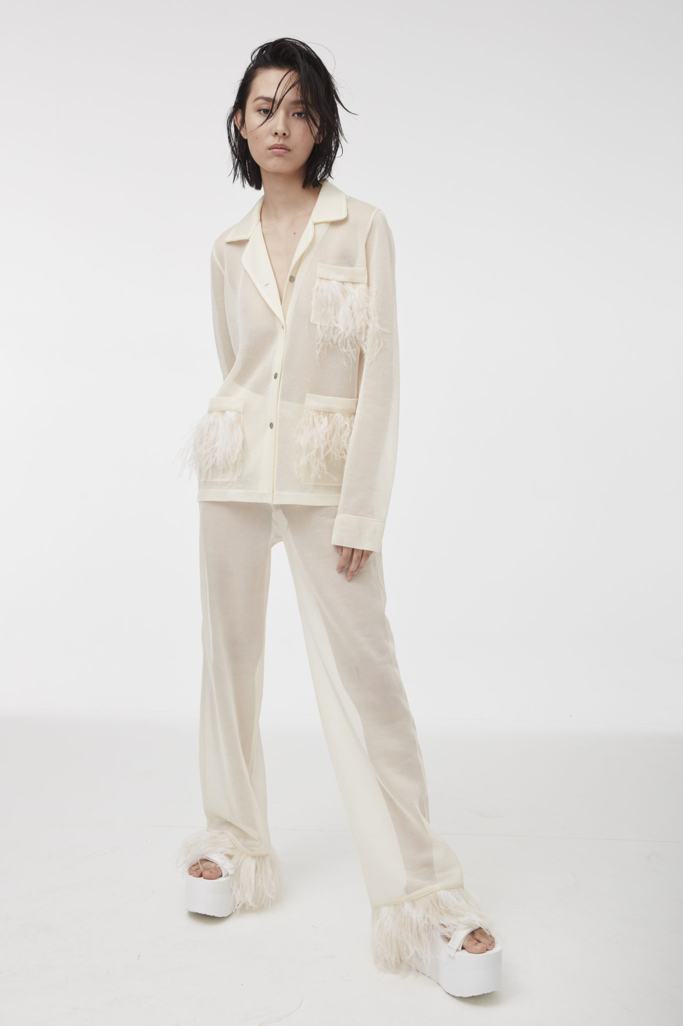 The tropical extravaganza also continued with fluid pajama sets and silk kimonos, sometimes punctuated by a cascade of plush feathers for a delicate, lively effect.