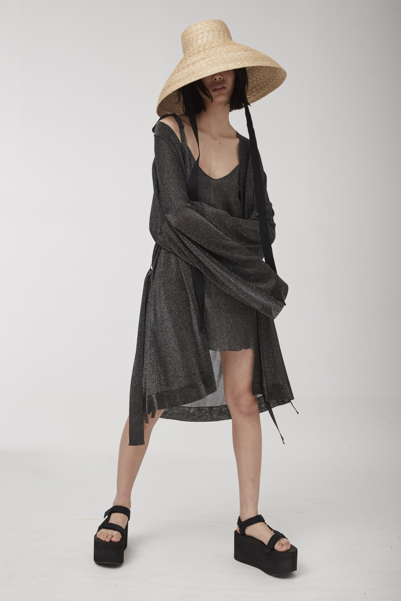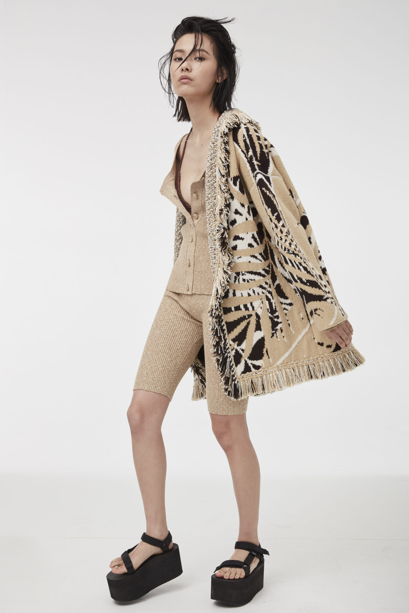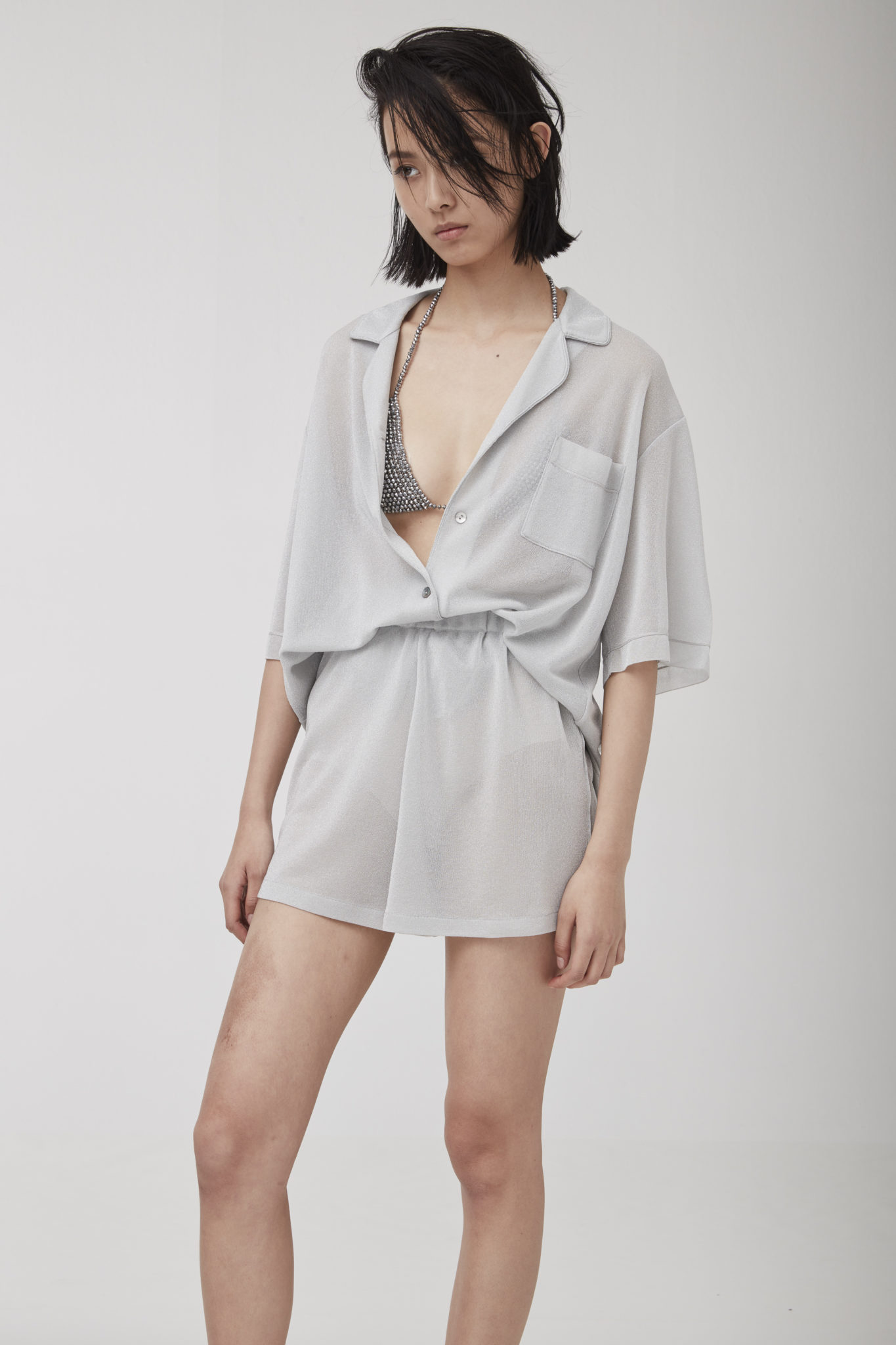 Charming light effects pop up on the lightweight wrap-around cardigans, micro tops matched with cycling shorts, as well as on the knitted pajama sets and silk slip dresses.