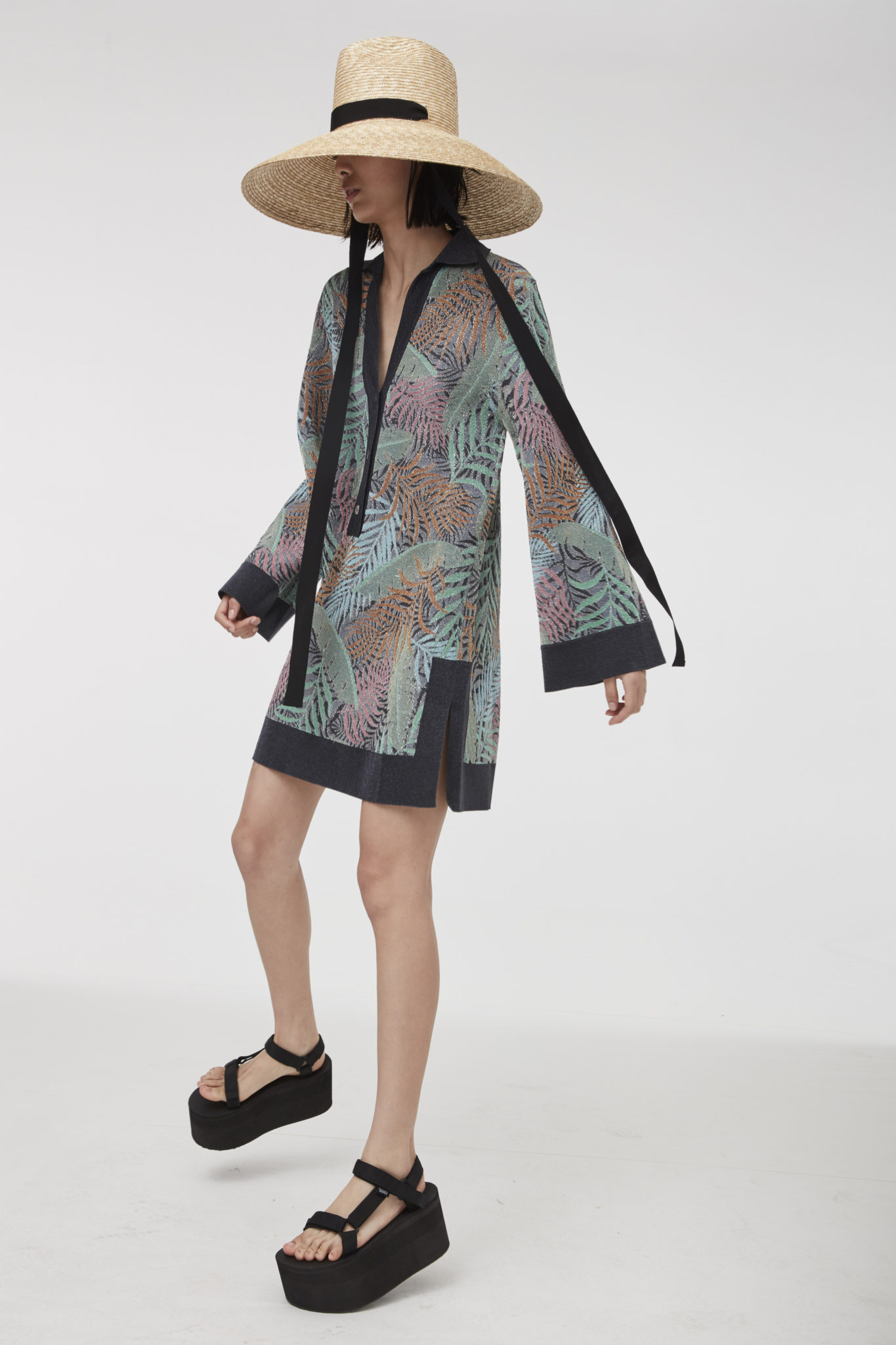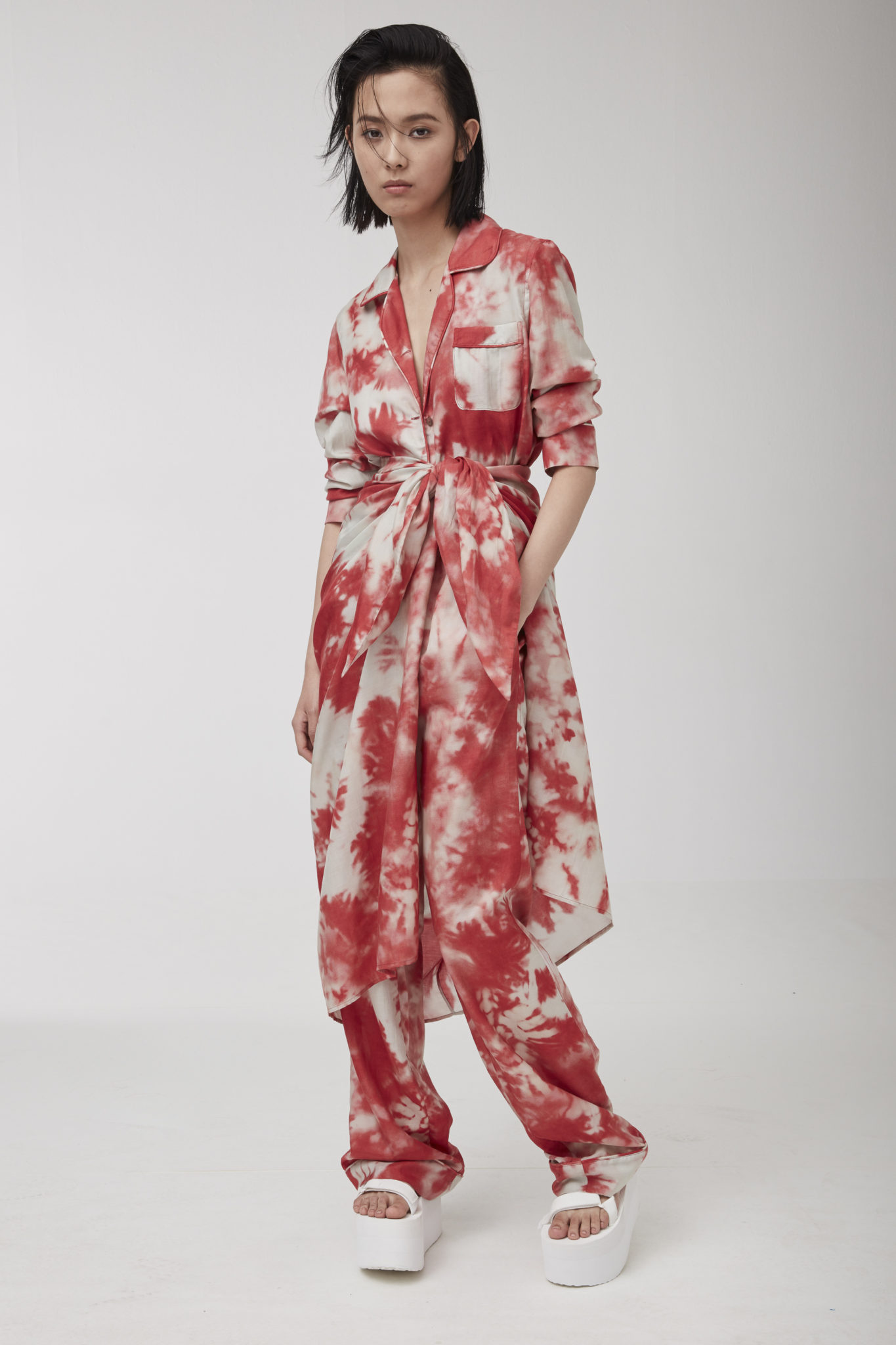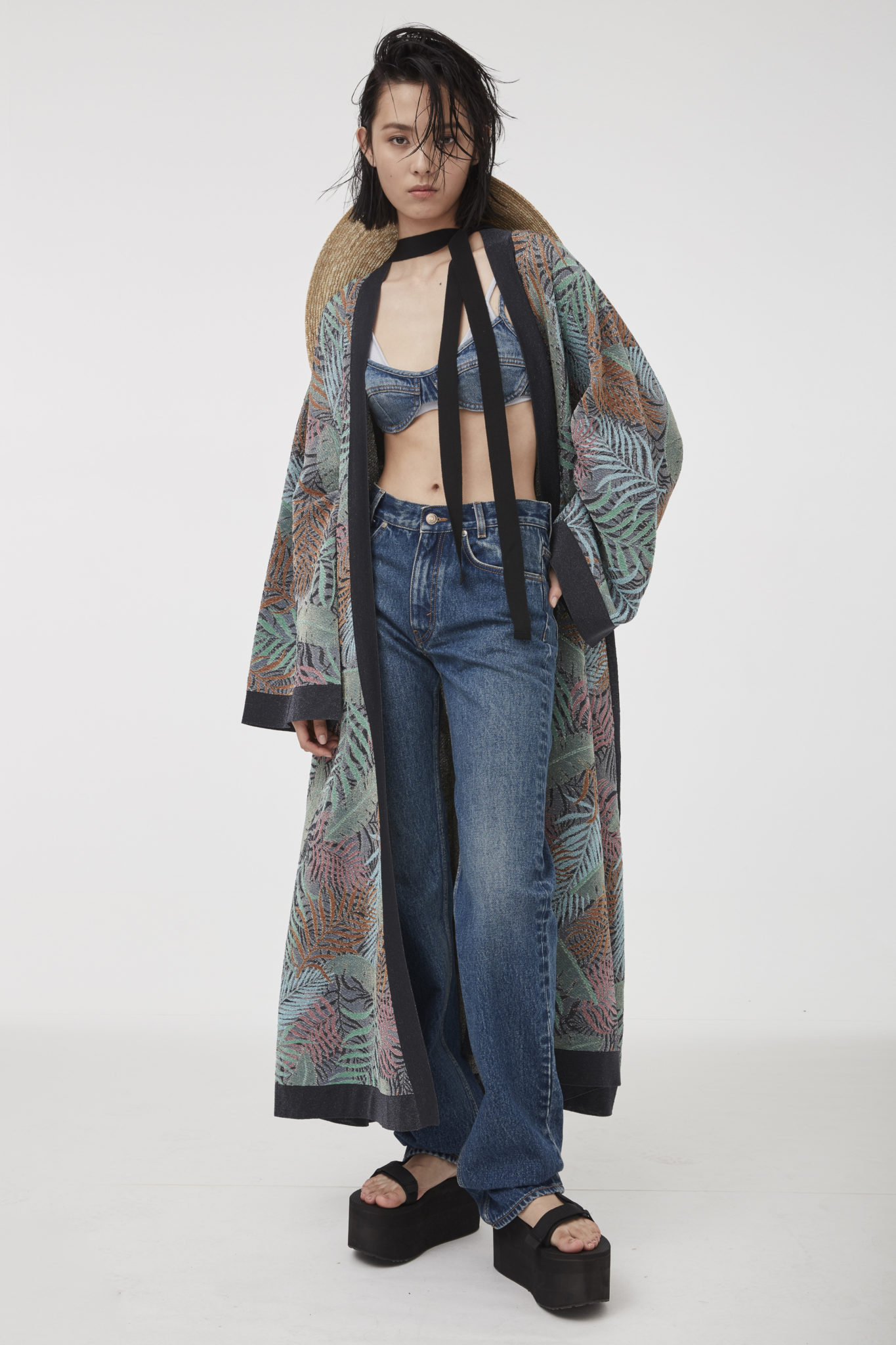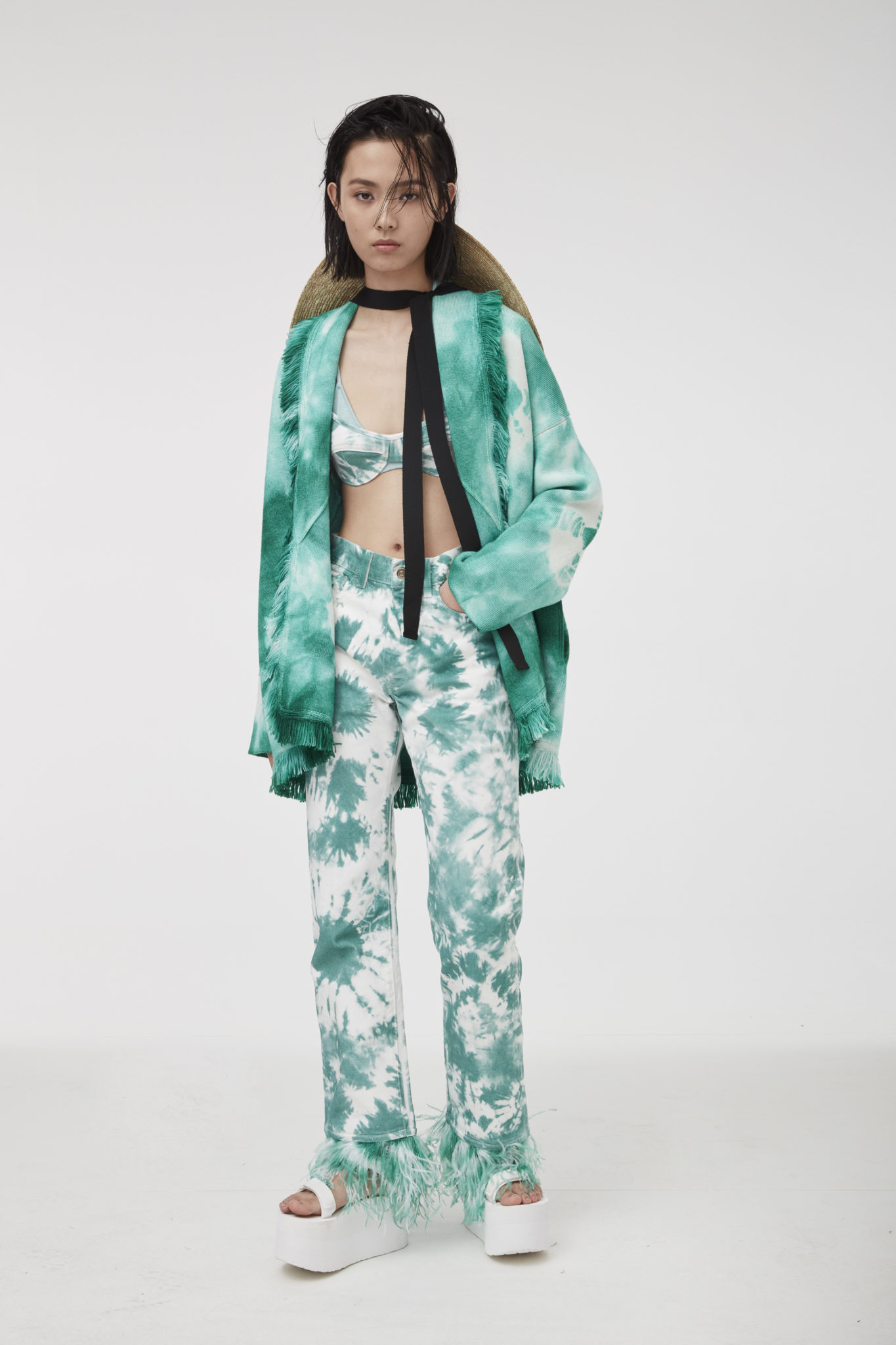 Seventies’ silhouettes take center stage in the denim pieces, including flared pants and shorts matched with coordinated bralettes, which are splashed with fresh pink and turquoise tie-dye motifs.