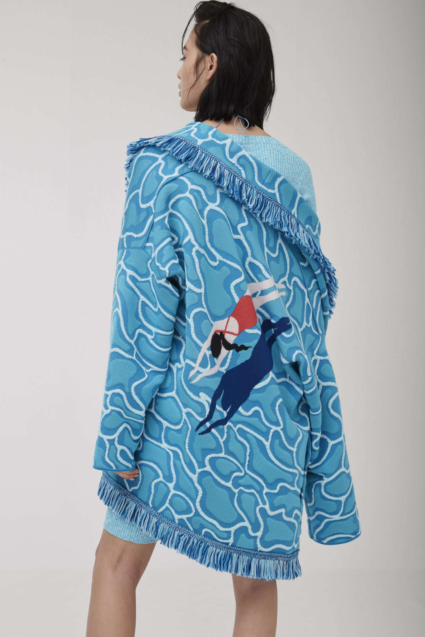 The translucent surface of the pool inspires a blend of special, lightweight yarns mixed with Japanese silk. Knitwear also gets the look of terrycloth, while a swimmer appears as a high-high-definition image on a luxurious Icon cardigan.