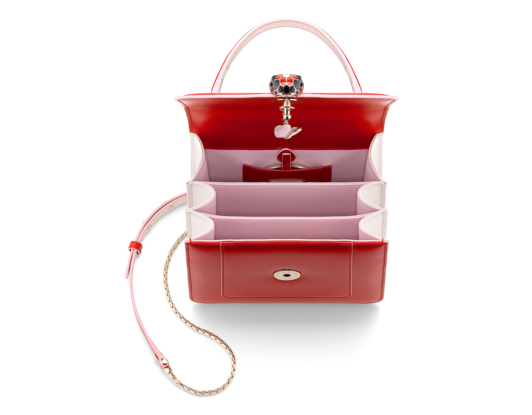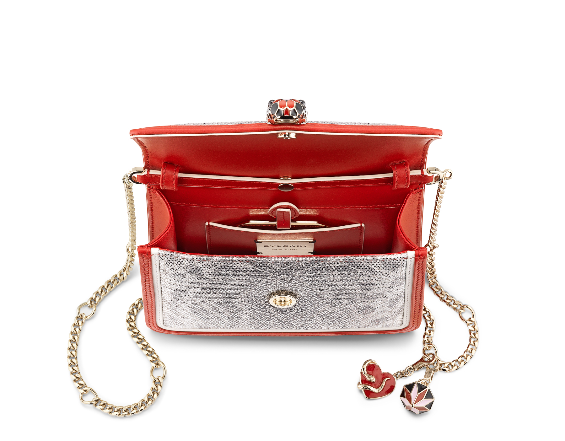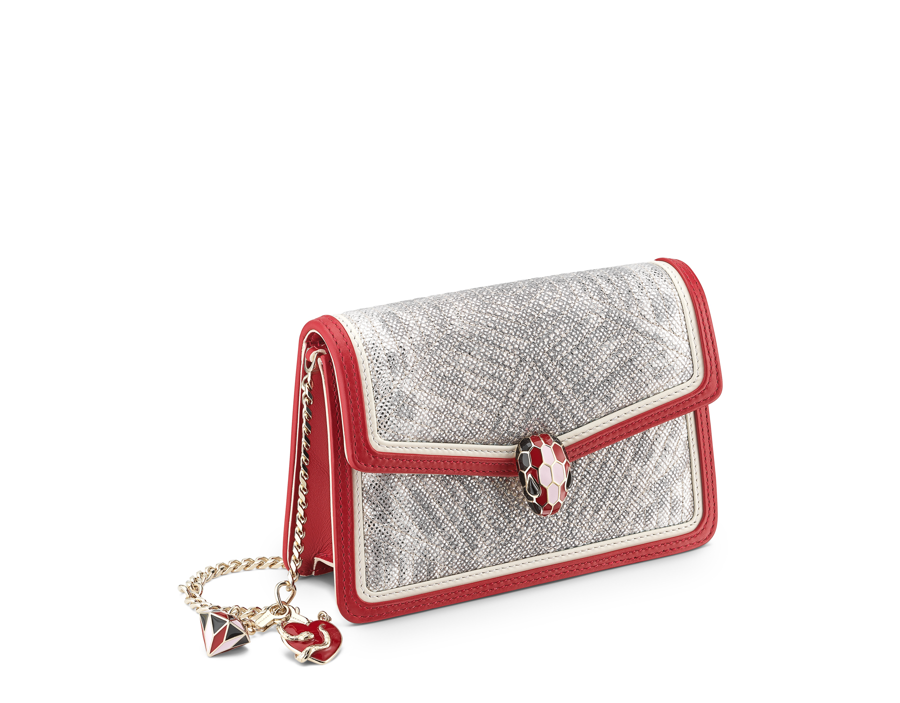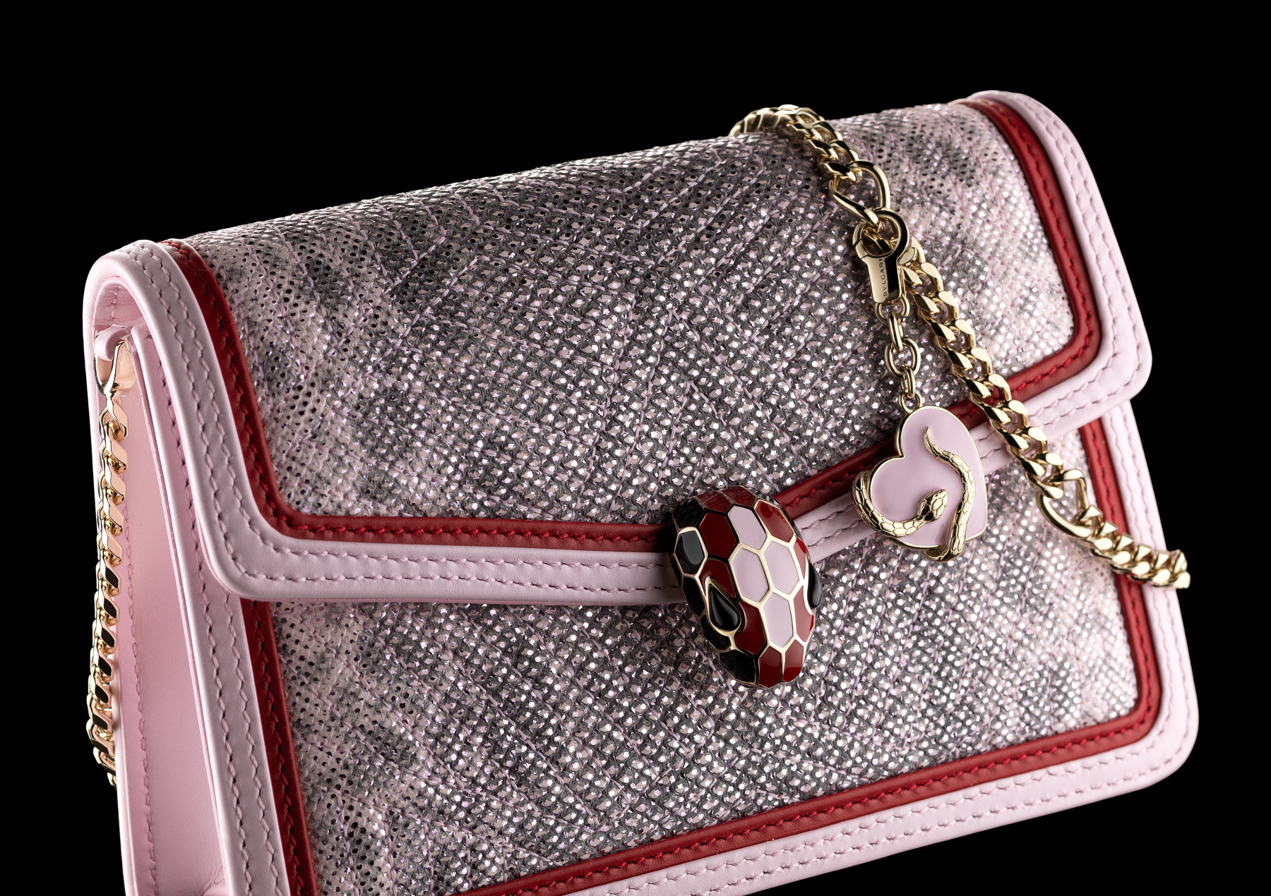 Pour Bvlgari, l’amour, lorsque vient la Saint Valentin, est disponible dans toutes les tailles et toutes les formes : l’emblématique sac bandoulière avec poignée Serpenti Forever en cuir de veau adopte le romantisme d’un pendentif rose en forme de cœur, entouré d’un serpent sensuel. Orné de ce même pendentif, le sac Serpenti Micro Diamond Blast, un nouveau membre de la famille serpent de Bvlgari, est également décoré d’un pendentif en forme de diamant, pour rappeler de façon espiègle que rien n’est aussi précieux que l’amour. Décliné en deux jeux de couleurs différents, ce sac format “micro” ultra-désirable joue sur les contrastes, l’un des deux modèles dispose par exemple d’un corps matelassé en karung métallisé couleur White Agate avec des pourtours en cuir de veau couleurs Carmine Jasper et White Agate. La nature polyvalente de ce sac lui permet tous les portés : en bandoulière, à l’épaule ou en sac-banane ultra-chic, ce “micro bijou” est le compagnon idéal de toutes les sorties, ajoutant une touche de glamour quelle que soit l’occasion, tout au long de l’année.