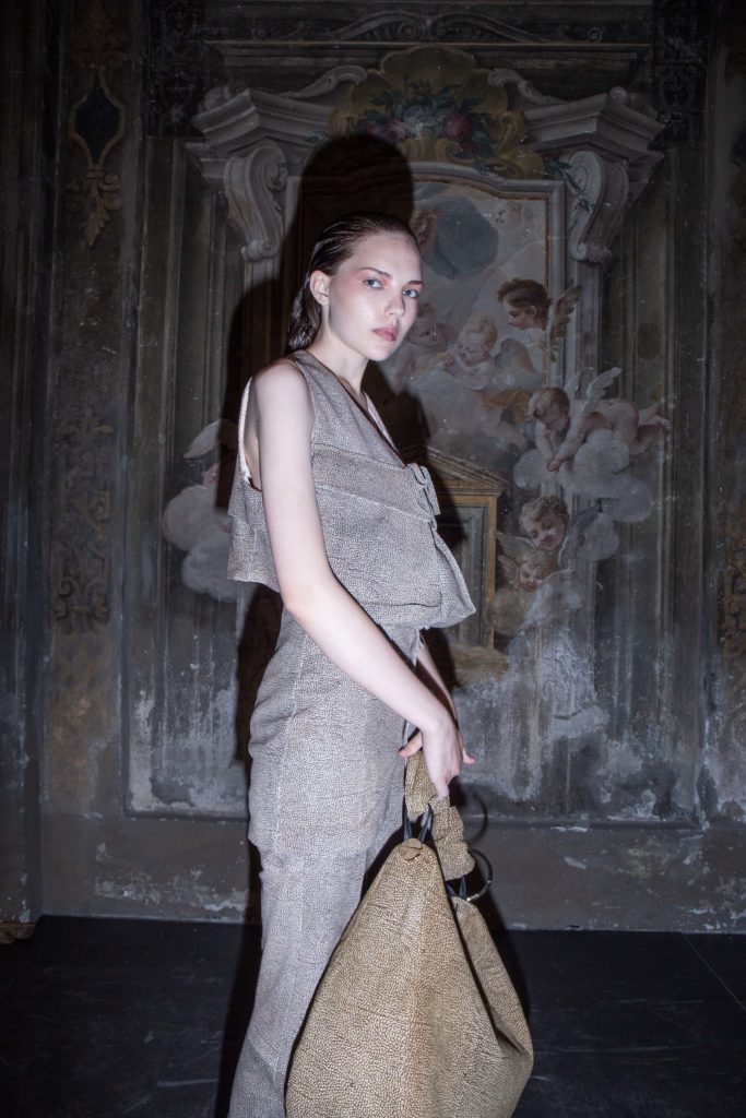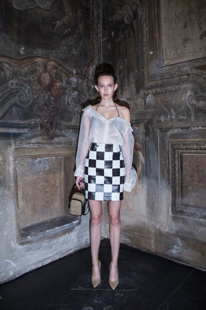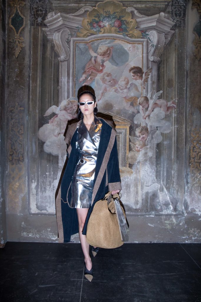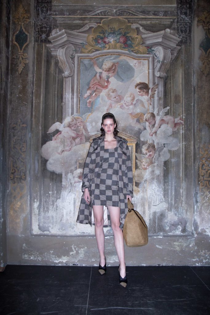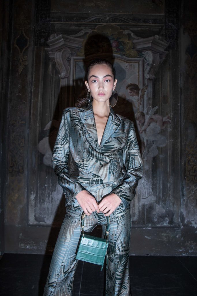 Mirrors are displacing devices. According to philosopher Michel Foucault a mirror is a “placeless place”, which means, in fact, a parallel dimension. This very idea is central to 1910 Borbonese: a parallel dimension to Borbonese as envisioned by Dorian Tarantini and Matteo Mena. This season, guests enter the solemn spaces of San Paolo Converso to find themselves displaced into a wholly mirrored scene with stylized palms on the altar suggesting a desert landscape. Glistening with reflections, the mirror makes the presence of a glaring sun felt, as a vision of desert modernism unfolds. The collection is a juxtaposition of graphic motifs, mirrored surfaces and plant textures, with Borbonese’s signature OP pattern constantly flowing on the background. A subcultural sensibility drenched with an enduring fascination for fashion as pure pomp, Dorian Tarantini and Matteo Mena keep giving an interpretation of Borbonese that while respectful of the roots takes bold, unexpected twists and turns, insouciantly playing with notions of good and bad taste to herald an idea of extreme glamour. The 1910 Borbonese woman, this season, is a spiky femme, towering on pointy stiletto heeled slingback, a mirror leather sun reflector around her neck to catch the faintest ray of light, extreme flares making her look even taller, bathing suits and skimpy dresses offering her best, sculpted self to the world, chromed metallic sunglasses shielding her eyes. Fierce and uncompromising, she locks herself up in a checkerboard trenchcoat or wears a bathrobe as a coat, waist cinched by an OP sash belt. She has a fondness for suede, printed in hyper realistic cactus motifs, and for foliage patterns tailored into double breasted suits. Her blouses are dramatic, her suits are powerful. The wardrobe she owns and flaunts is focused yet full of surprises, running from statement coats to accessories such as the micro or macro Luna bag and mirrored disc earrings to insouciant t-shirts with Borbonese spelt out like a Hollywood insignia. Black, white, metal, cactus greens and OP beige seal the message precisely, colorwise. 1910 is Borbonese seen through a mirror that distorts, enhances and augments, pushing everything to the max.