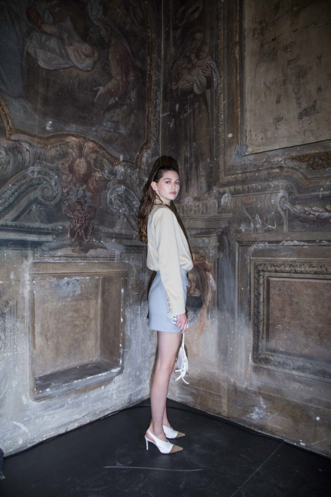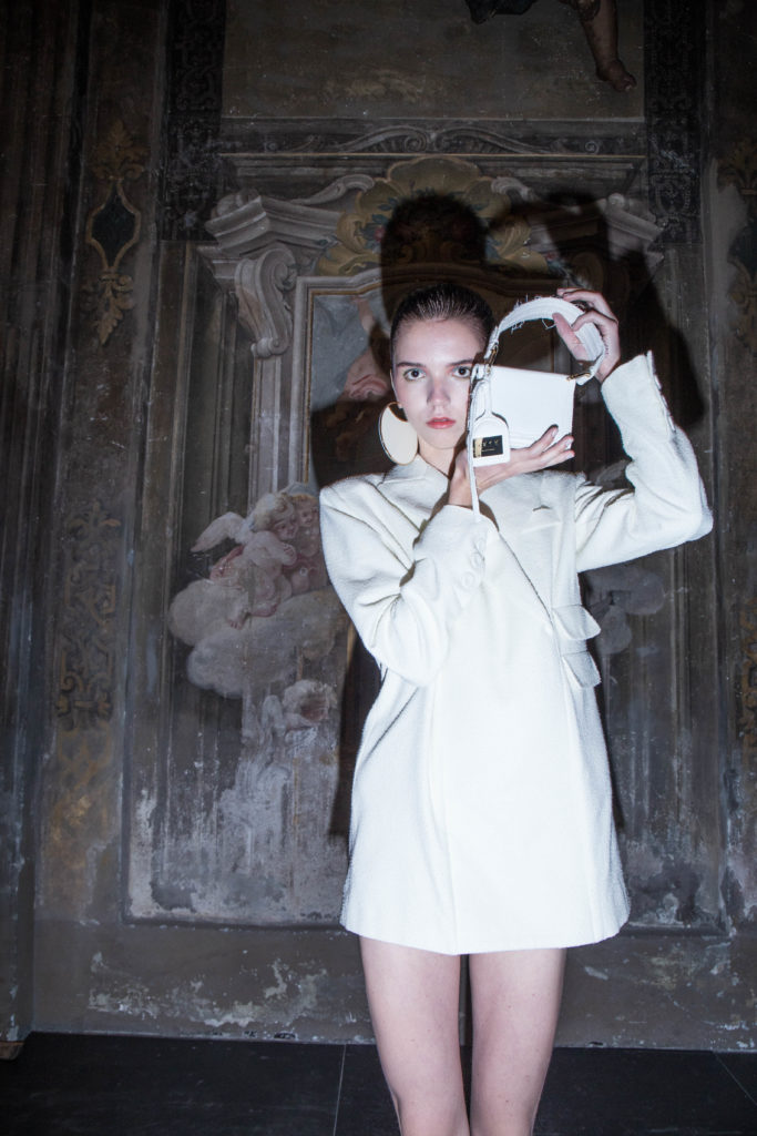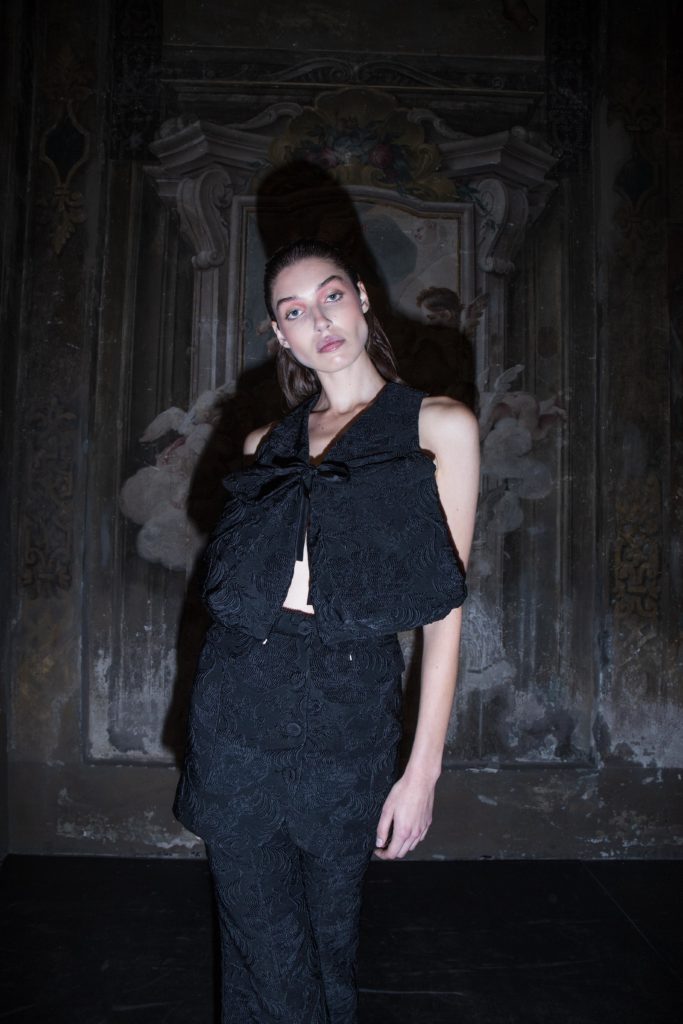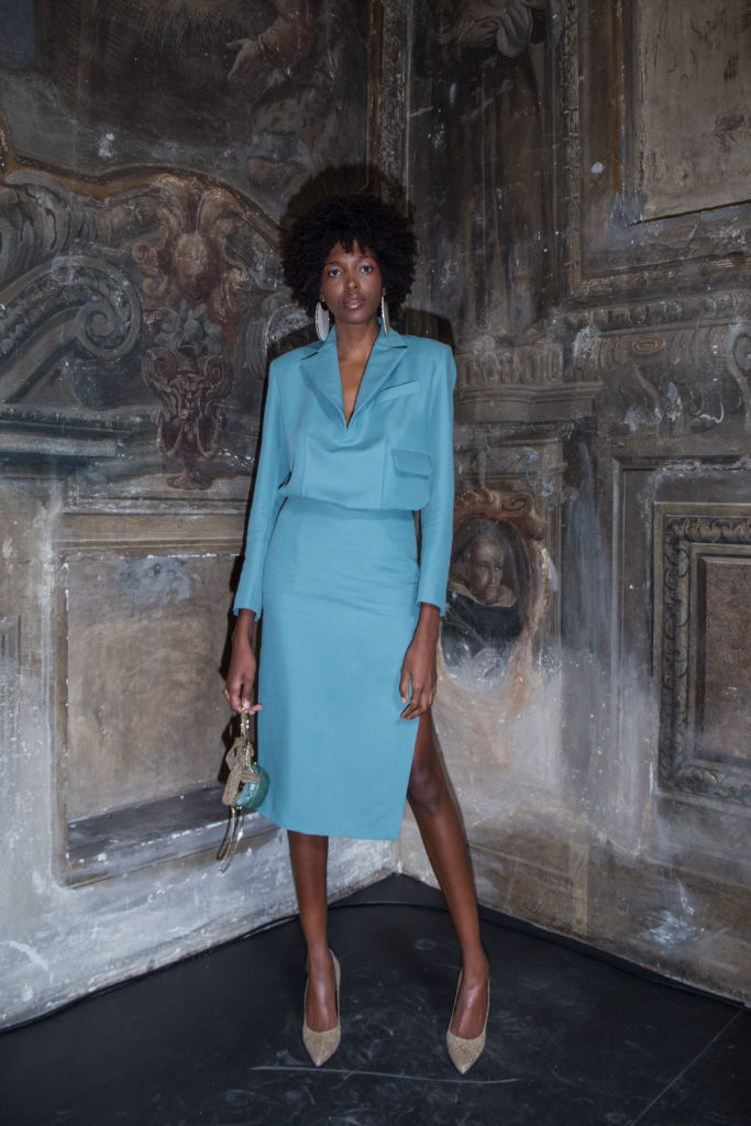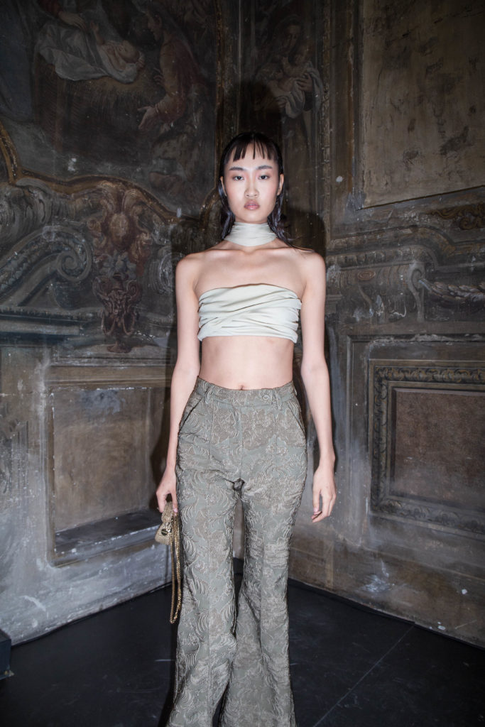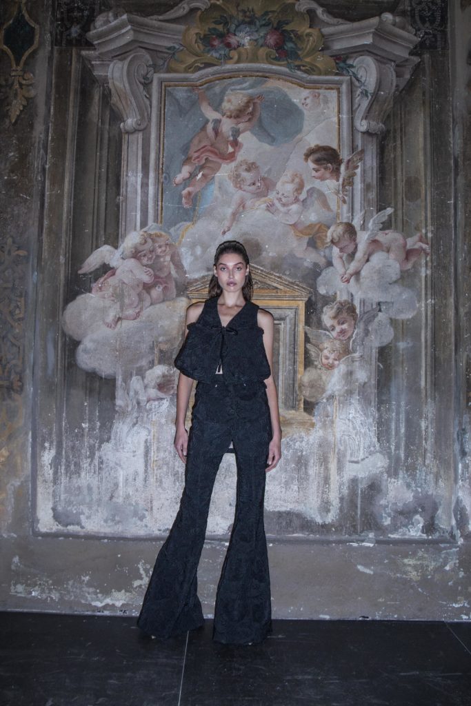 Mirrors are displacing devices. According to philosopher Michel Foucault a mirror is a “placeless place”, which means, in fact, a parallel dimension. This very idea is central to 1910 Borbonese: a parallel dimension to Borbonese as envisioned by Dorian Tarantini and Matteo Mena. This season, guests enter the solemn spaces of San Paolo Converso to find themselves displaced into a wholly mirrored scene with stylized palms on the altar suggesting a desert landscape. Glistening with reflections, the mirror makes the presence of a glaring sun felt, as a vision of desert modernism unfolds. The collection is a juxtaposition of graphic motifs, mirrored surfaces and plant textures, with Borbonese’s signature OP pattern constantly flowing on the background. A subcultural sensibility drenched with an enduring fascination for fashion as pure pomp, Dorian Tarantini and Matteo Mena keep giving an interpretation of Borbonese that while respectful of the roots takes bold, unexpected twists and turns, insouciantly playing with notions of good and bad taste to herald an idea of extreme glamour. The 1910 Borbonese woman, this season, is a spiky femme, towering on pointy stiletto heeled slingback, a mirror leather sun reflector around her neck to catch the faintest ray of light, extreme flares making her look even taller, bathing suits and skimpy dresses offering her best, sculpted self to the world, chromed metallic sunglasses shielding her eyes. Fierce and uncompromising, she locks herself up in a checkerboard trenchcoat or wears a bathrobe as a coat, waist cinched by an OP sash belt. She has a fondness for suede, printed in hyper realistic cactus motifs, and for foliage patterns tailored into double breasted suits. Her blouses are dramatic, her suits are powerful. The wardrobe she owns and flaunts is focused yet full of surprises, running from statement coats to accessories such as the micro or macro Luna bag and mirrored disc earrings to insouciant t-shirts with Borbonese spelt out like a Hollywood insignia. Black, white, metal, cactus greens and OP beige seal the message precisely, colorwise. 1910 is Borbonese seen through a mirror that distorts, enhances and augments, pushing everything to the max.