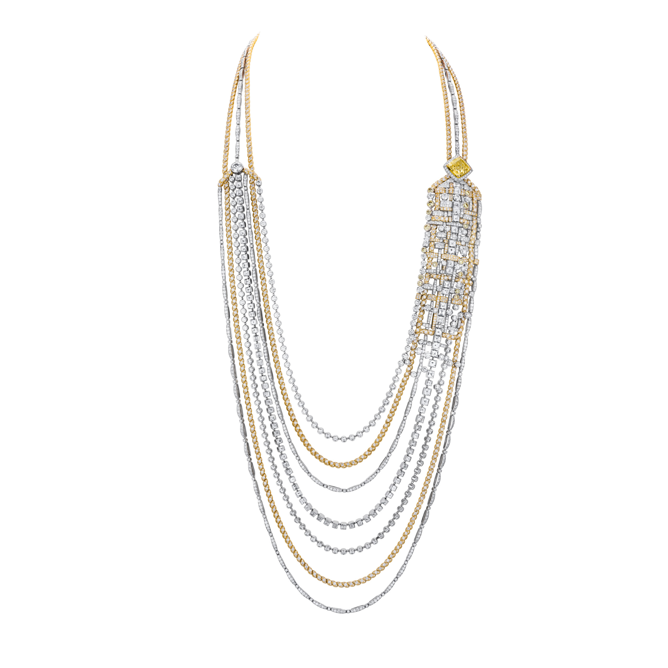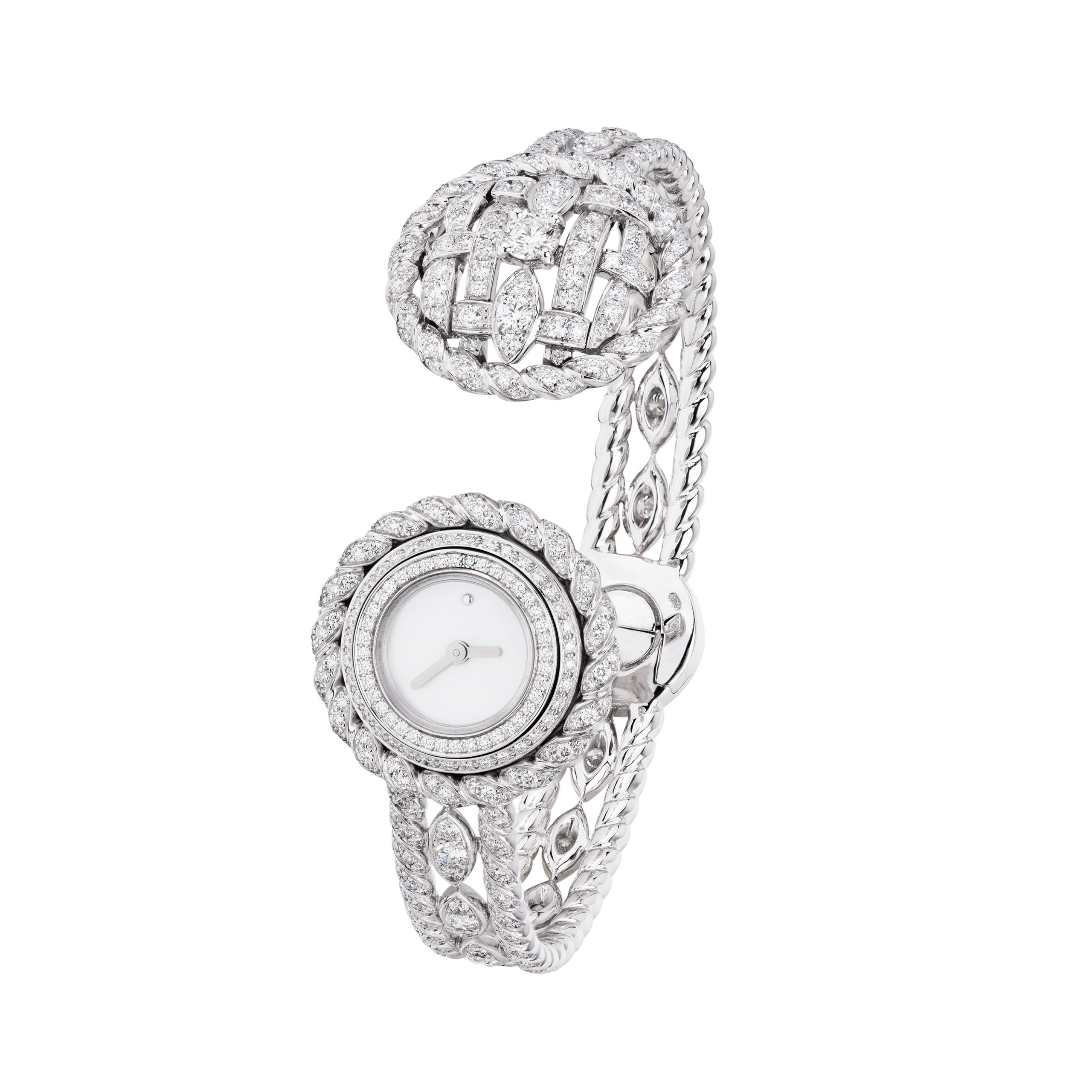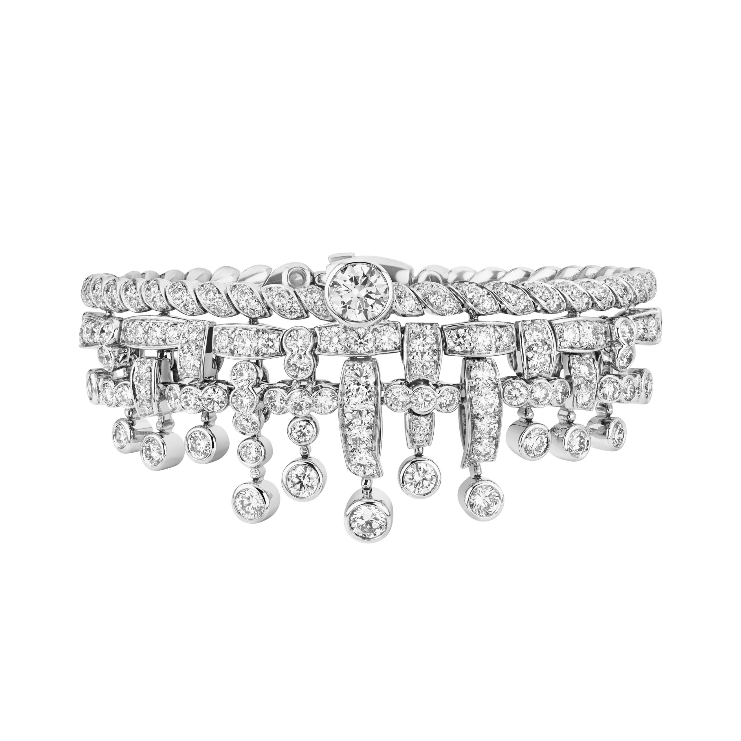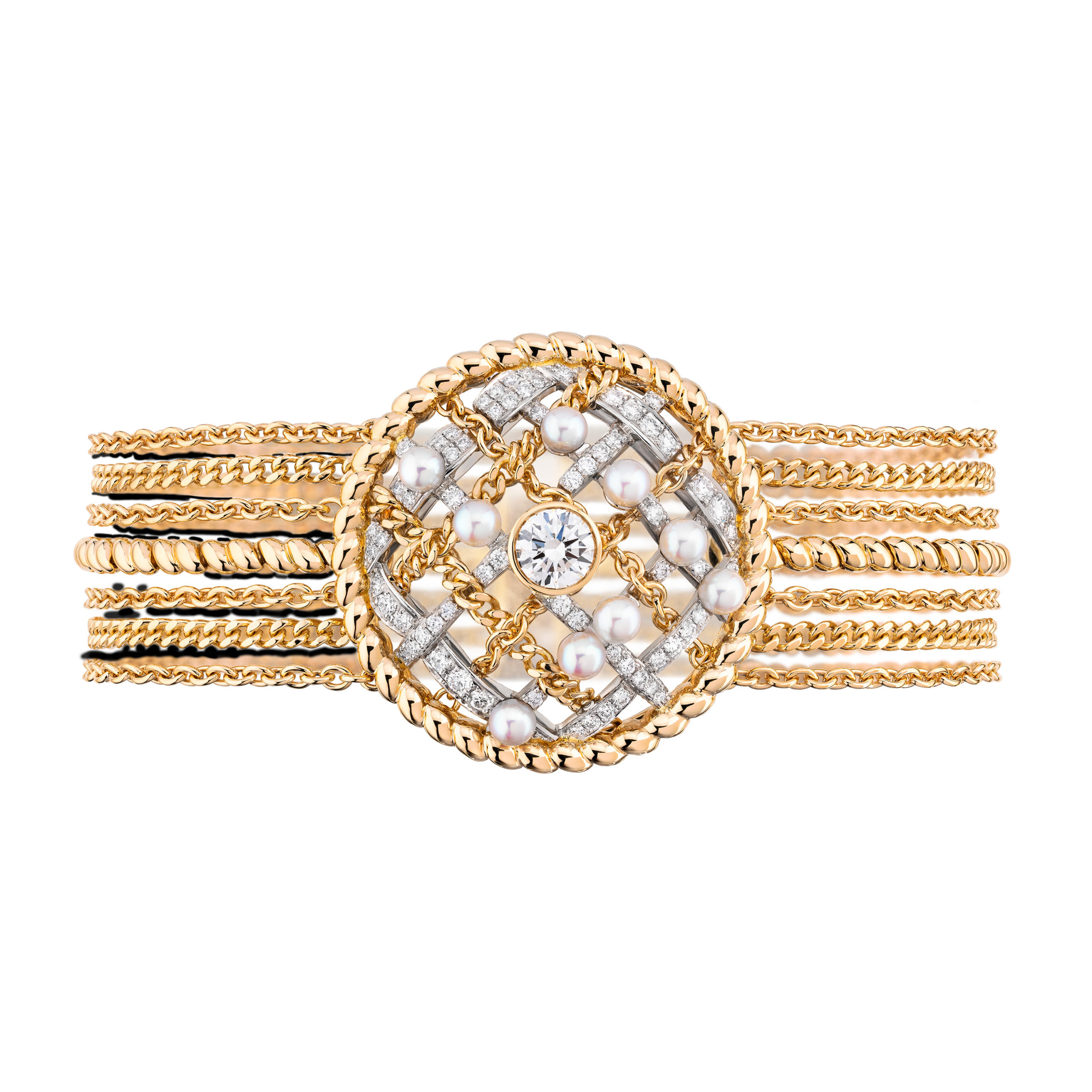 Pour répondre à ces questions, l’Atelier de Haute Joaillerie de CHANEL a mis au point des techniques particulières d’emmaillement d’or afin de traduire l’aspect irrégulier du tweed qui plaisait tant à Gabrielle Chanel. Diamants, perles, saphirs sont travaillés sur plusieurs niveaux offrant ainsi aux colliers, bagues et bracelets des effets texturés d’une richesse inouïe. Les lignes épurées de chaque création renforcent la puissance graphique de ces tissages exceptionnels, entièrement façonnés à la main. L’ensemble de la collection a été conçu pour exprimer les particularités du tweed : à l’épaisseur de ce tissu répond une alternance de matières précieuses, la souplesse et le confort se retrouvent dans la structure même des pièces qui sont, une à une, emmaillées et ouvragées sur l’endroit et l’envers à la manière d’une trame de tweed. Chaque serti a été affiné à l’extrême pour réduire les aspérités des grains en donnant une sensation de moelleux.