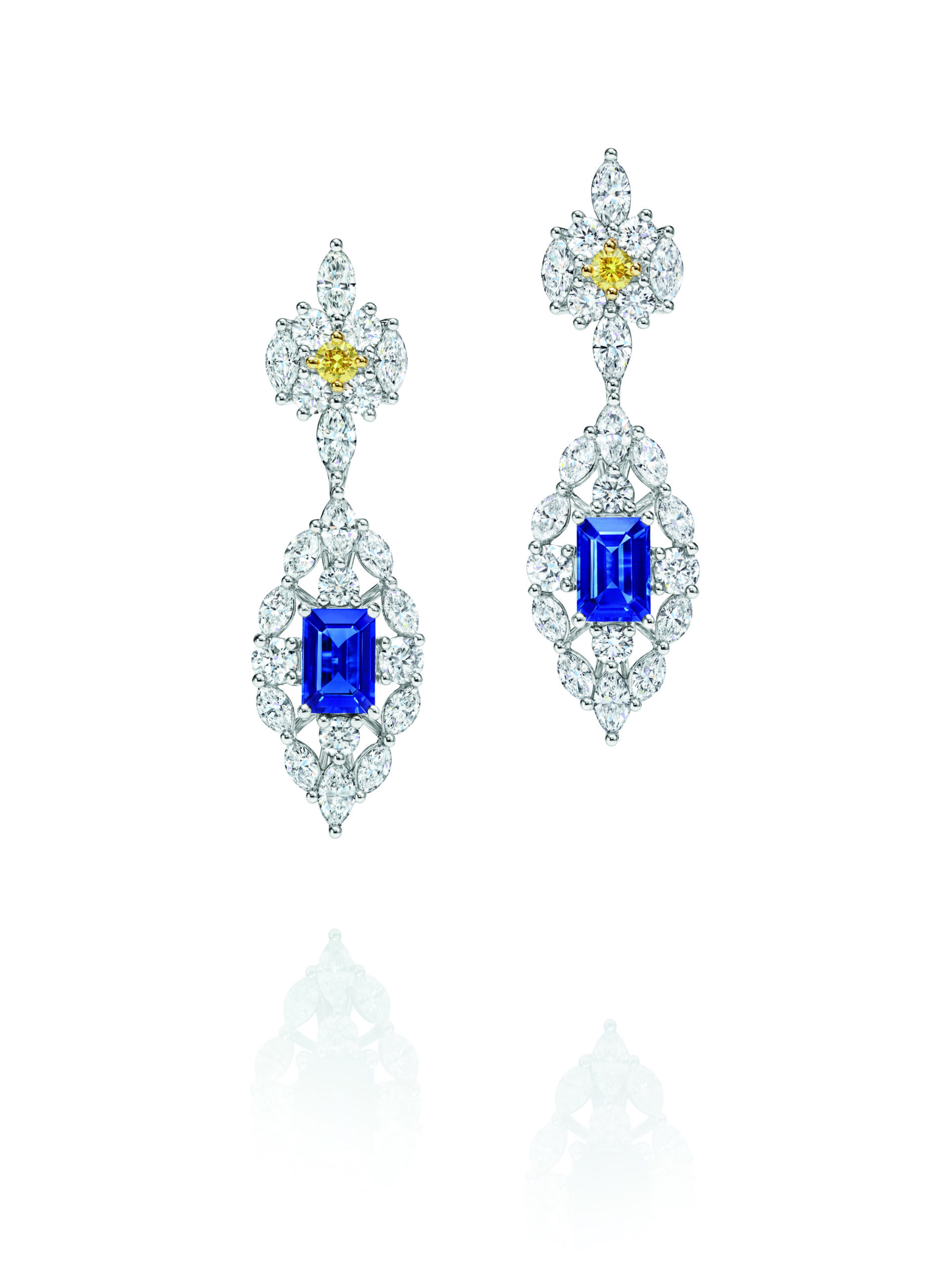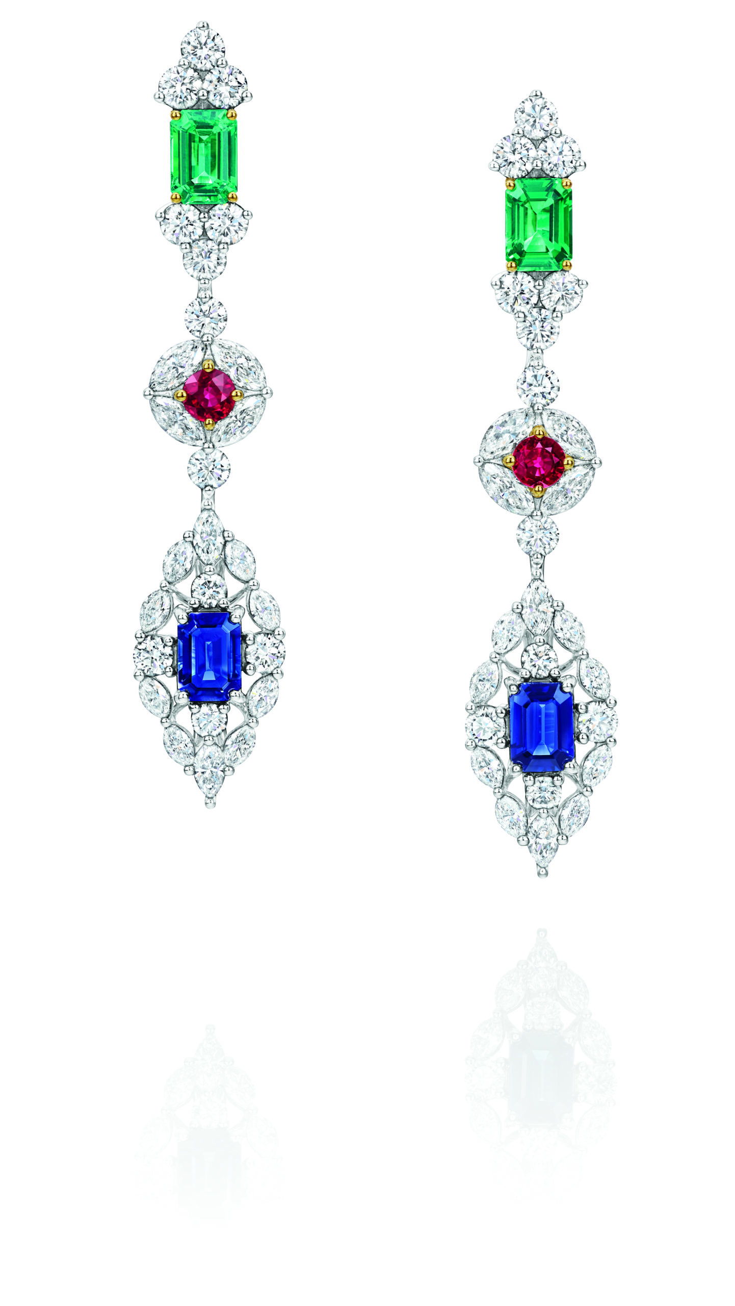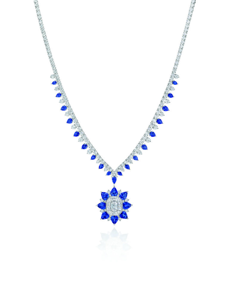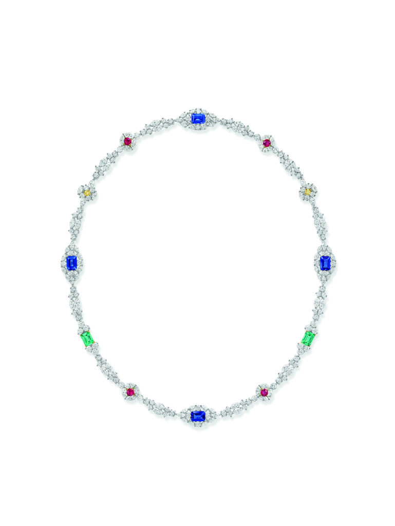 Pour Brownstone qui est un hommage aux extraordinaires brownstones de l’Upper East Side où Harry vit le jour, les diamants taille baguette, brillant et marquise rehaussés de pierres précieuses carrées colorées sont disposés dans un motif géométrique, qui rappelle l’architecture imposante de Manhattan. Disponible dans deux palettes de couleurs – turquoise pain de sucre avec des saphirs bleus et un mélange de saphirs bleus et jaunes – la collection comprend un long collier avec pendentif et des boucles d’oreilles assorties.