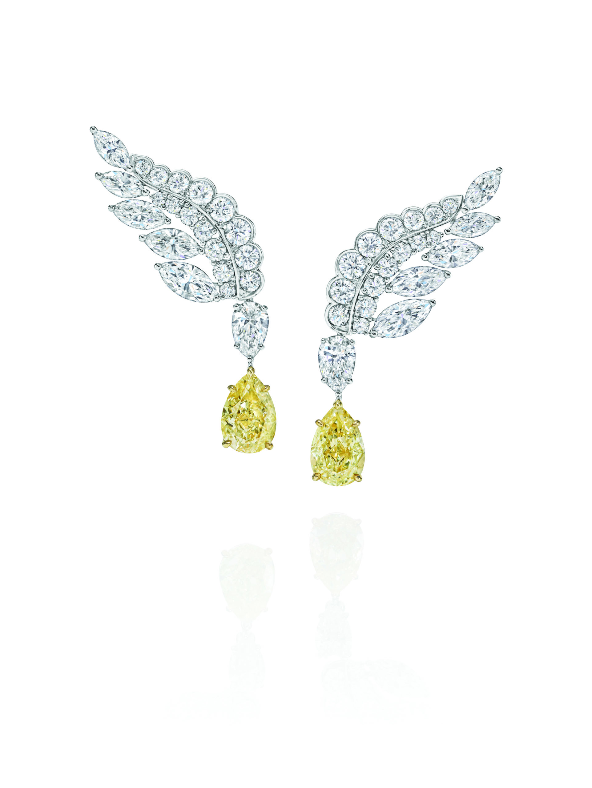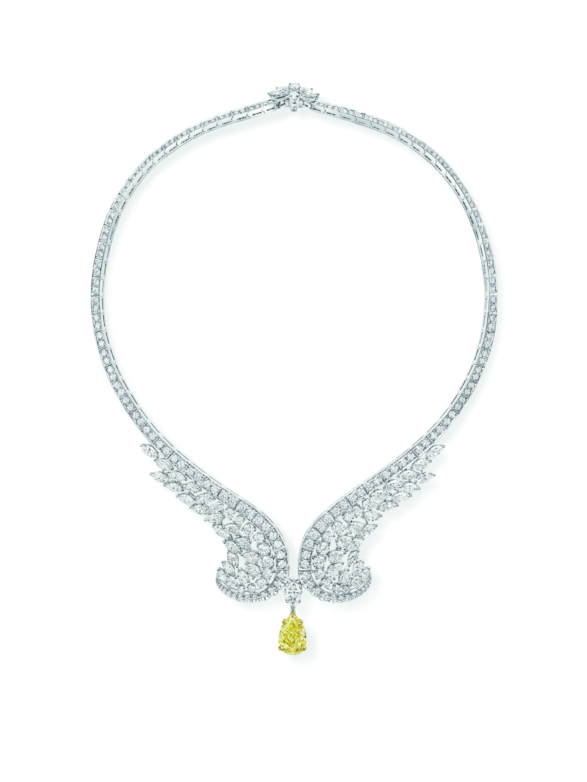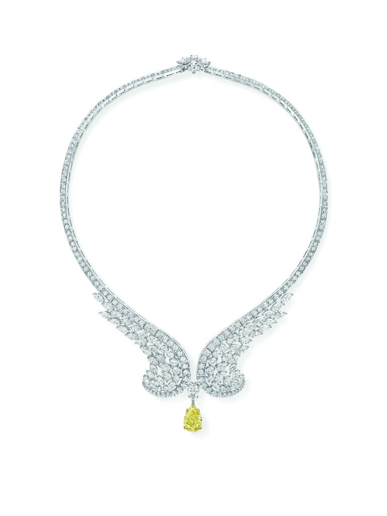Véritable volonté de la Maison de perpétrer cet héritage New-Yorkais, Eagle, reproduit avec majesté cet oiseau en vol, et associe remarquablement des diamants incolores à d’autres jaunes fancy, sur des pièces serties avec grand soin.