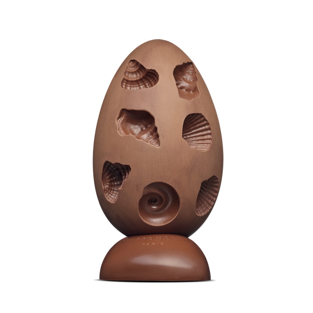 Ligne sobre et épurée, l’œuf Poséidon se révèle, marqué des empreintes fossilisées de coquillages, creusées à même le chocolat.
