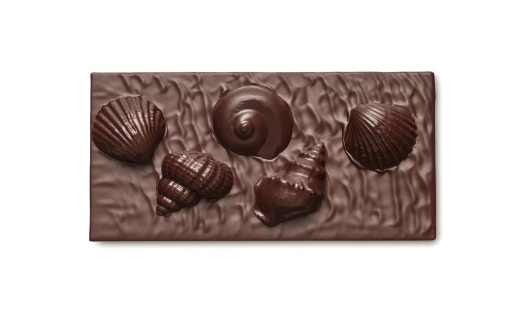 Deux tablettes inédites, dont l’aspect ondulé rappelant le ressac, se parent de 4 coquillages délicieusement fourrés d’un praliné noisette ou d’un praliné pignon de cèdre.