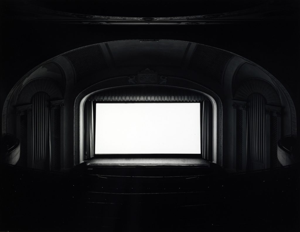 La série Theaters, initiée en 1976, est inspirée de l’intérêt de Sugimoto pour le zen et la phénoménologie. « Le monde tel qu’il m’apparaît a-t-il une existence réelle ? Dès le début, [il] m’est apparu comme un objet illusoire, qui ne prend un parfum de réalité qu’une fois photographié. » Avec l’idée de capter une image qui n’existerait que pour l’appareil et condenserait des dizaines de milliers d’images visibles, il s’introduit dans un cinéma (autrefois théâtre) de New York et réalise une prise de vue avec un temps d’exposition égal à la durée du film. La somme des 24 images/seconde ayant défilé le temps de la projection est un rectangle blanc étincelant, éclairant tout juste la salle environnante. Comme dans le zen, le vide est la culmination de la conscience. Est-ce un hasard si Sugimoto commence cette série l’année suivant celle de la première prise de vue sans film, qui conduira à l’ère numérique et à la dématérialisation de l’image ? Poursuivie sur quarante ans, la série s’étend en 2015 aux Abandoned Cinemas, dont les écrans n’éclairent plus de leur blancheur que la décrépitude de salles délaissées. Au-delà de sa dimension méditative et de son évocation du temps de la photographie, Theaters peut se lire comme une métaphore de la disparition de l’image en tant qu’expérience physique et renvoie à une époque où celle-ci n’était pas une donnée transitant en un flux virtuel, mais la projection d’une vision intérieure, l’objectivation d’un échange spirituel entre le sujet regardant et l’objet regardé.